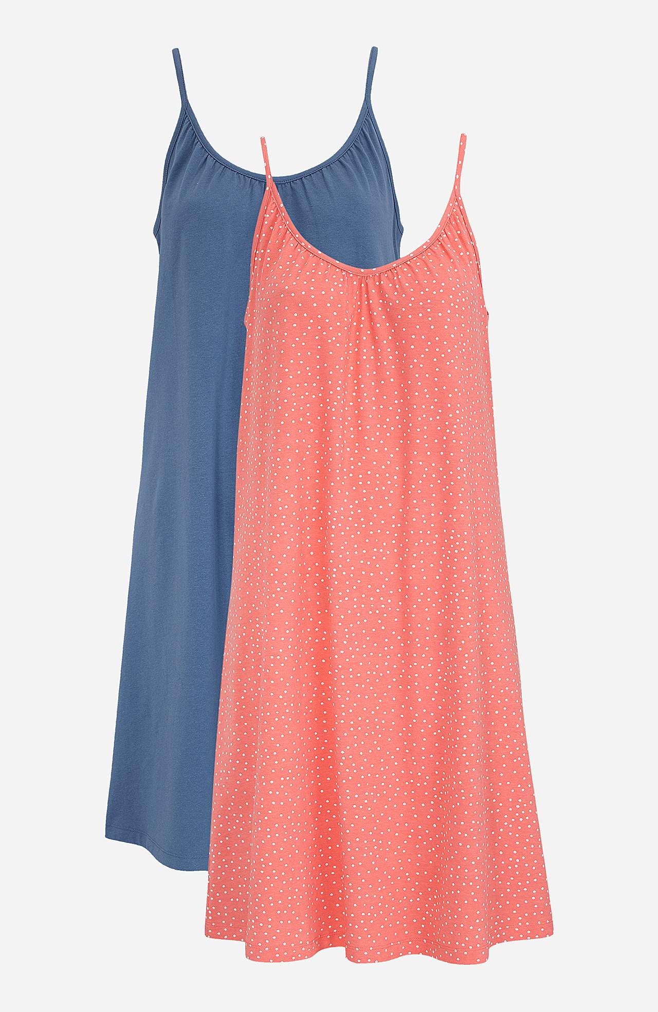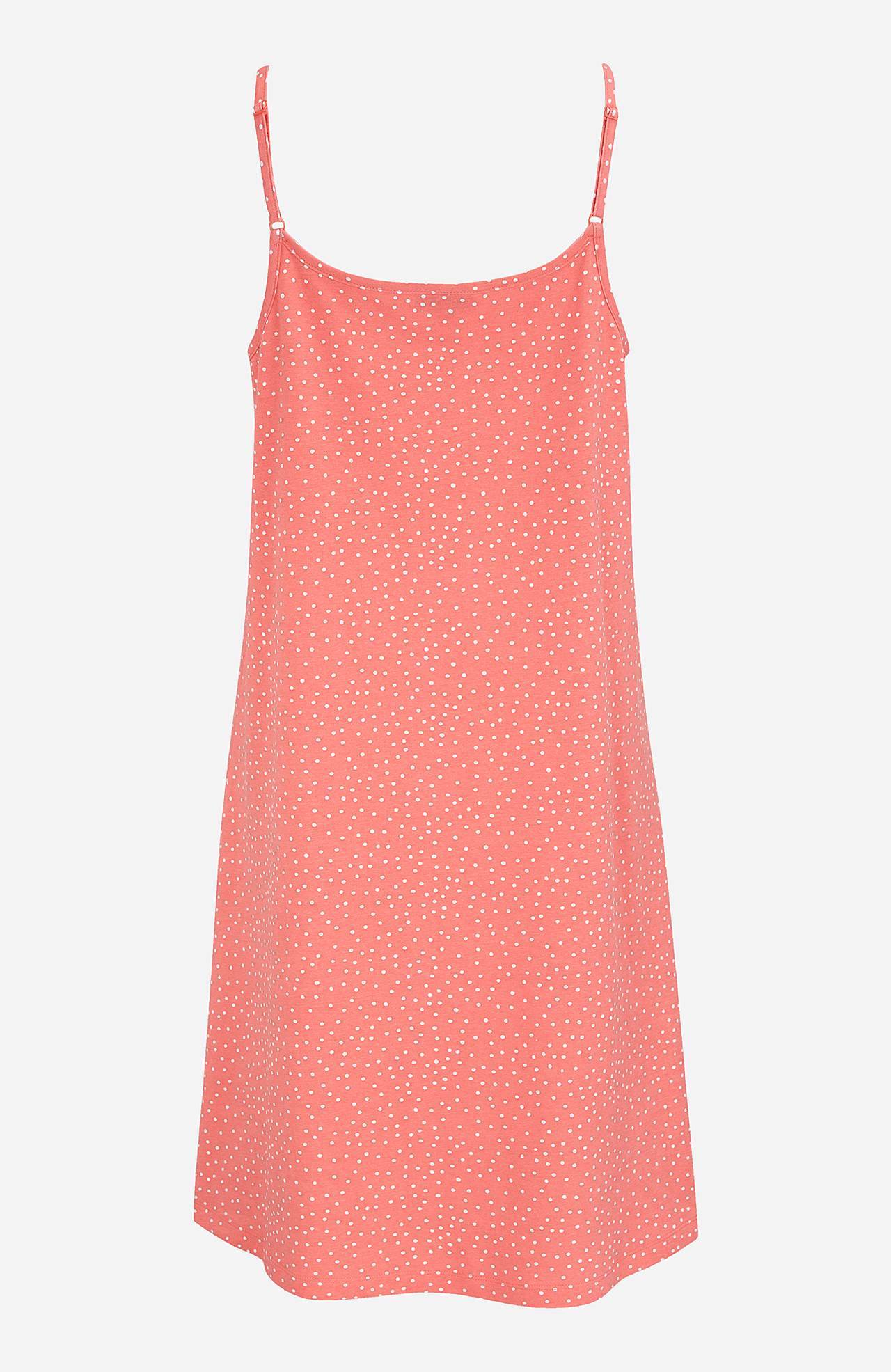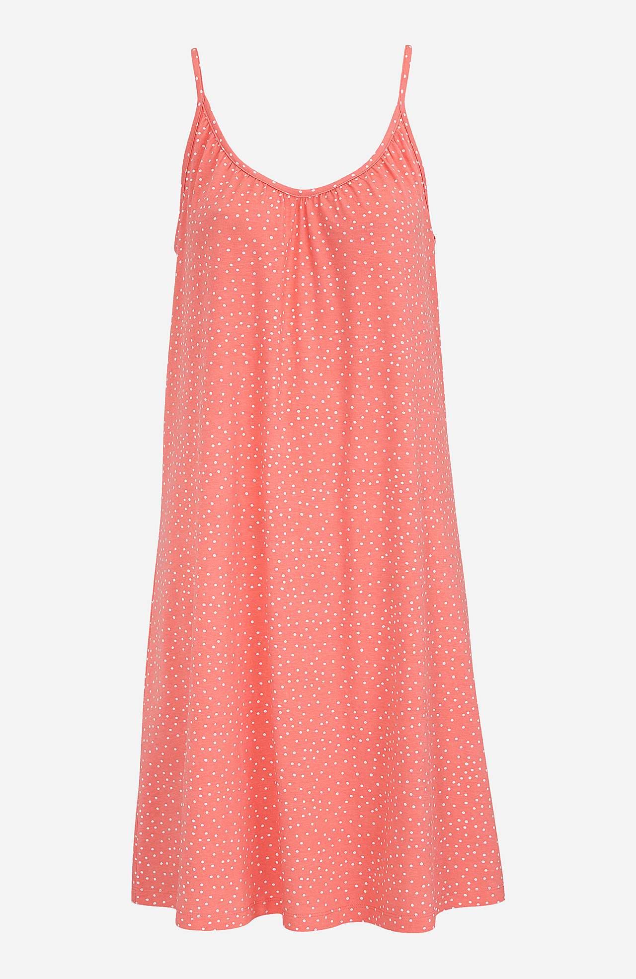 Koszula nocna do kolan bez rękawów. Dekolt w kształcie V z marszczeniami z przodu. Cienkie i regulowane ramiączka. Długość z tyłu zależna od rozmiaru, ok. 93-104 cm.