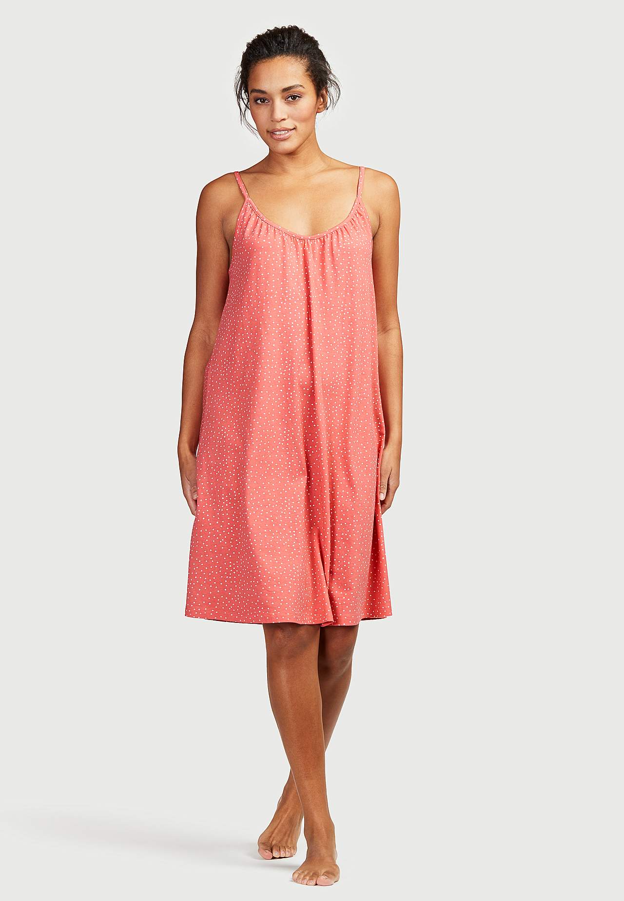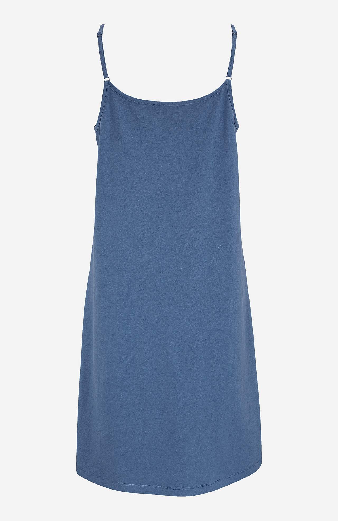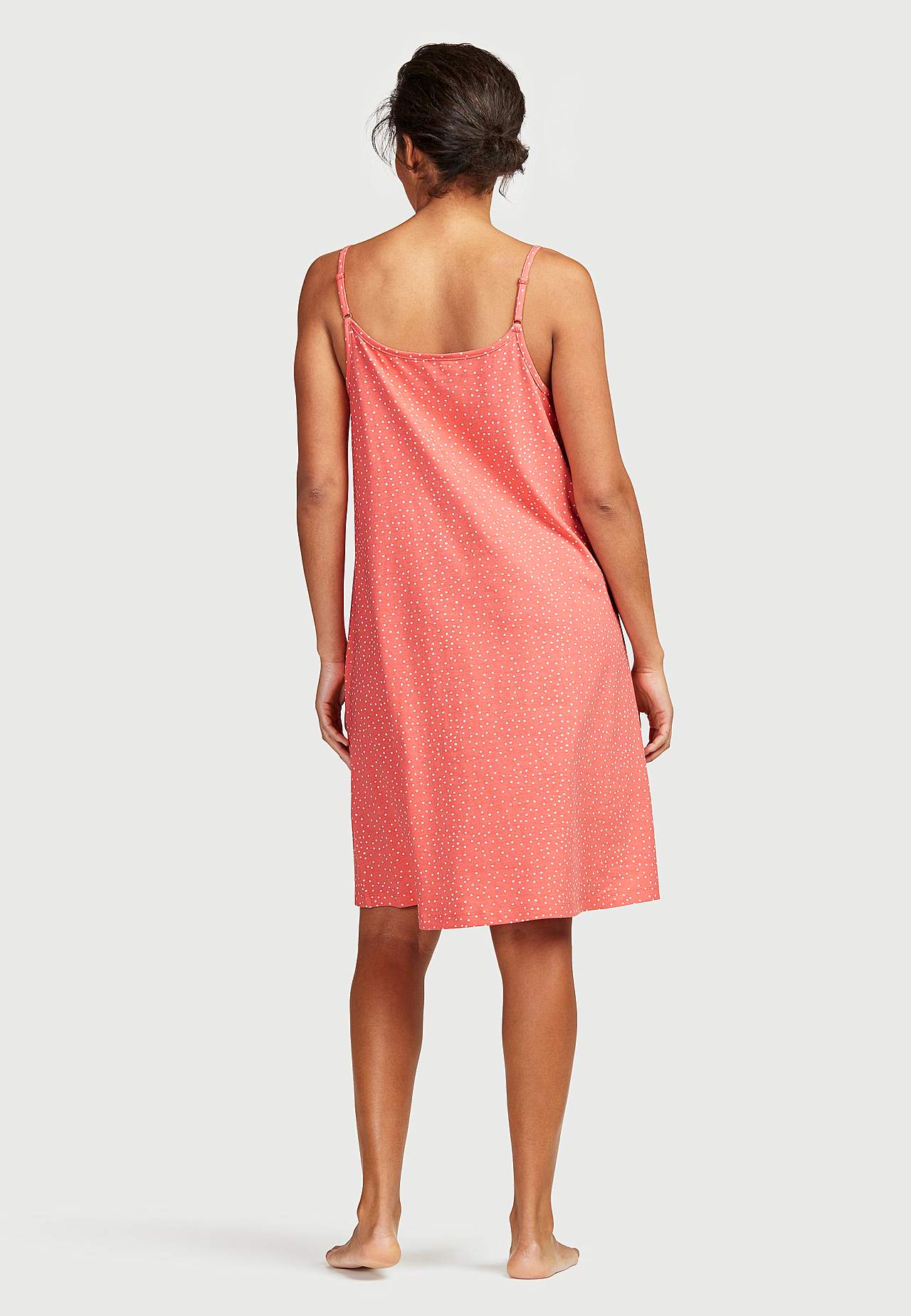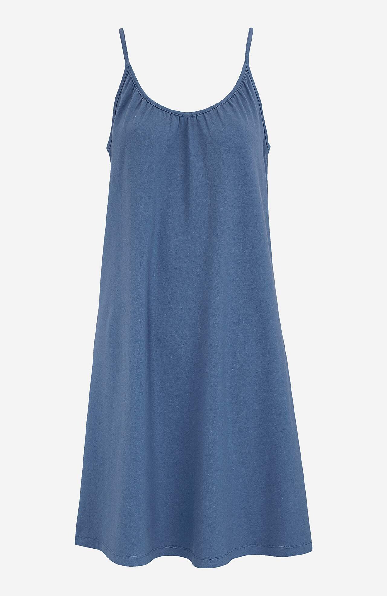 Koszula nocna do kolan bez rękawów. Dekolt w kształcie V z marszczeniami z przodu. Cienkie i regulowane ramiączka. Długość z tyłu zależna od rozmiaru, ok. 93-104 cm.
