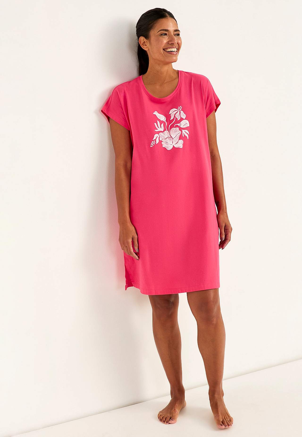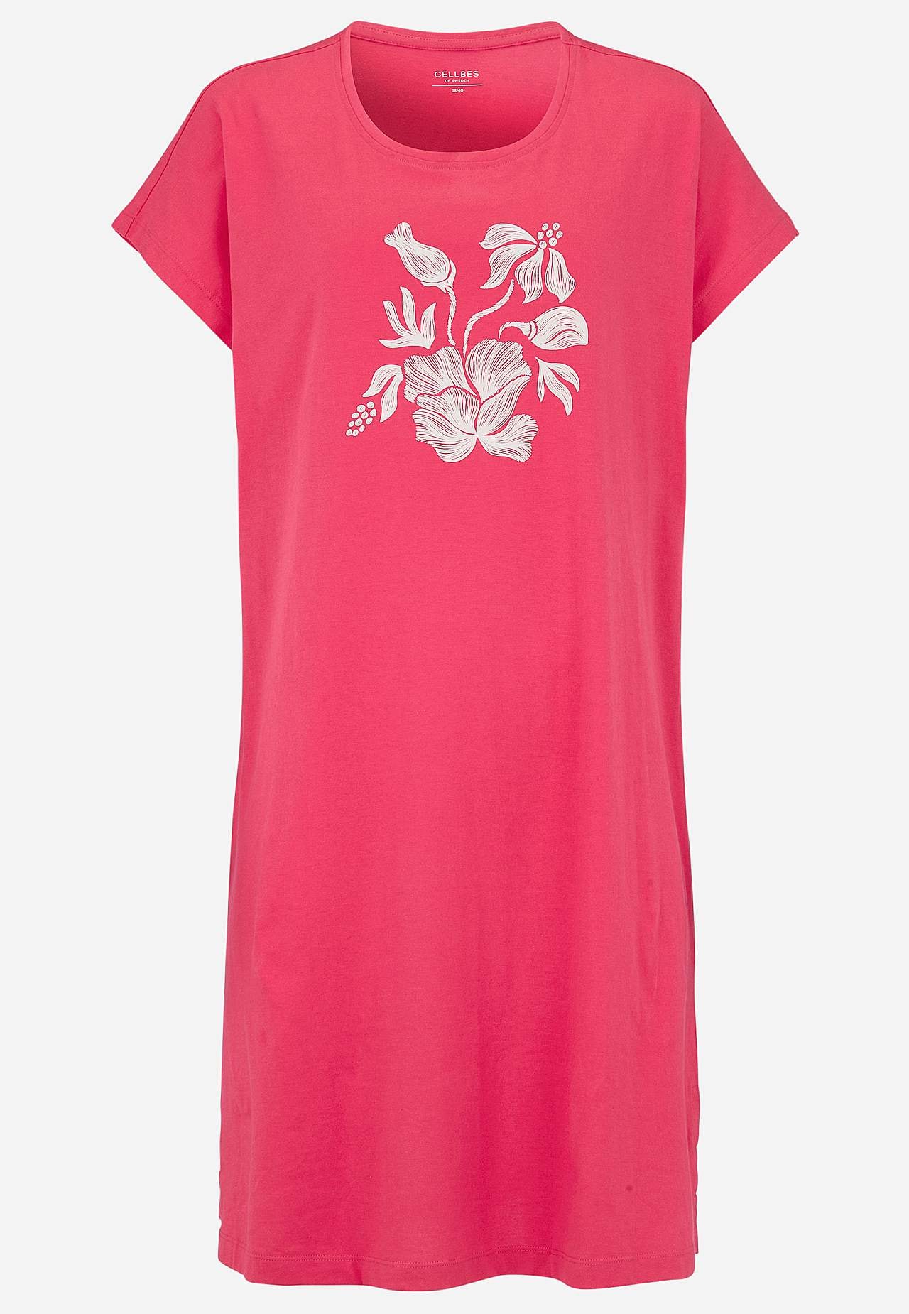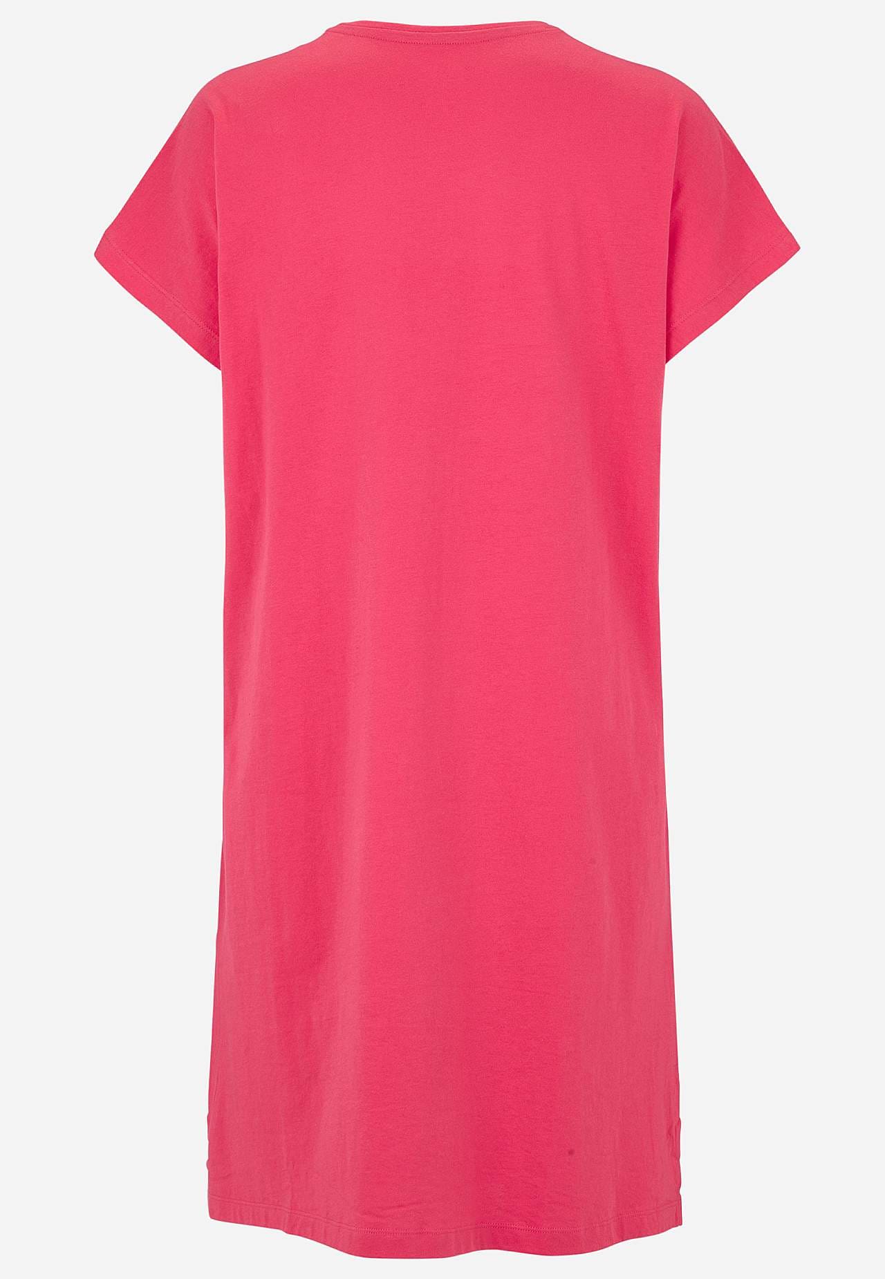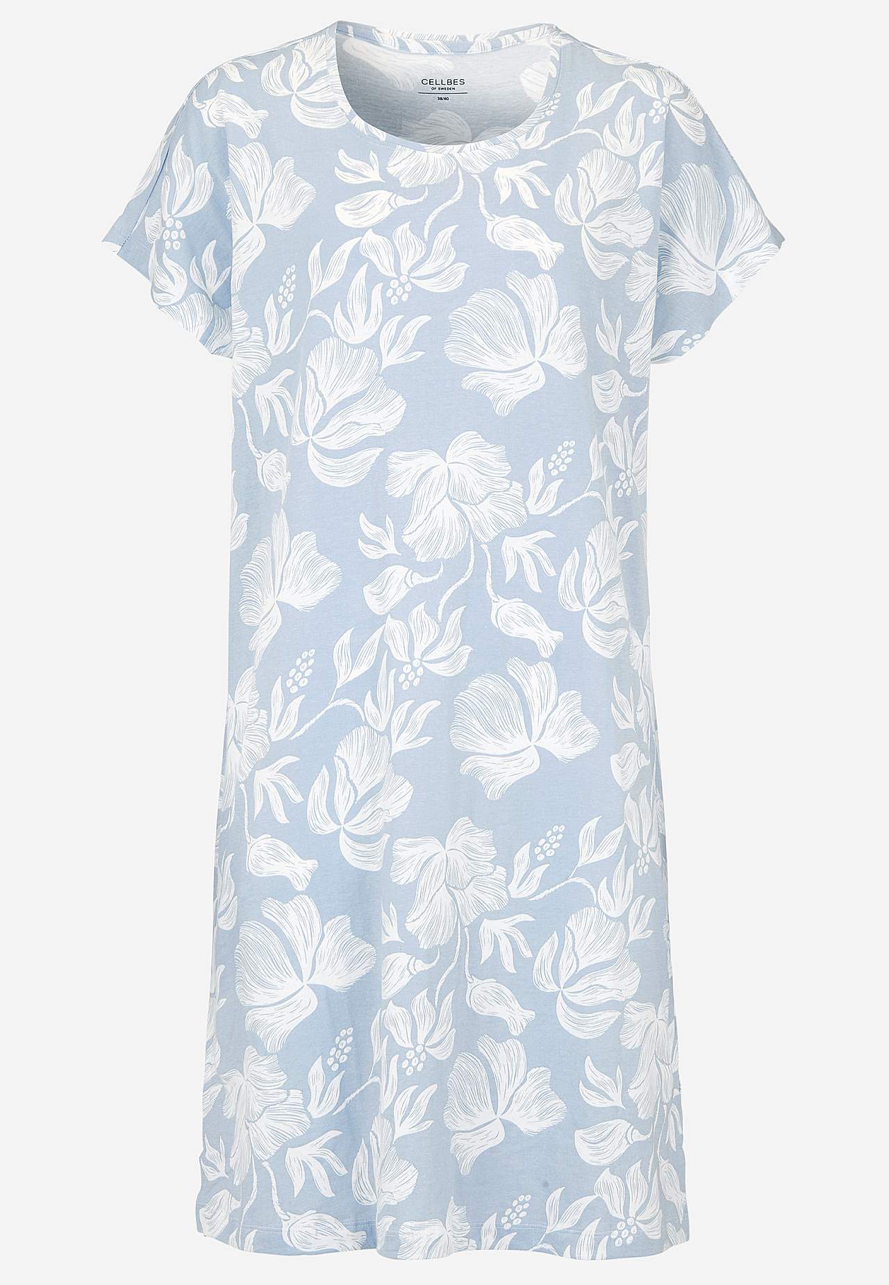 Krótka koszula nocna z miękkiej bawełny ekologicznej. Swobodny i prosty fason. Zaokrąglony dekolt. Krótkie kimonowe rękawy. Prosty brzeg z rozcięciem po bokach. Długość od ramion z tyłu w zależności od rozmiaru ok. 95-105 cm.