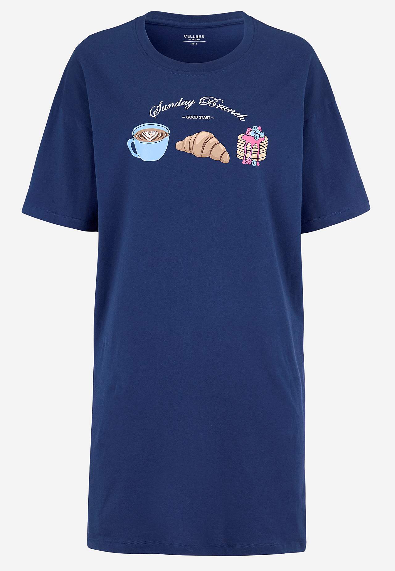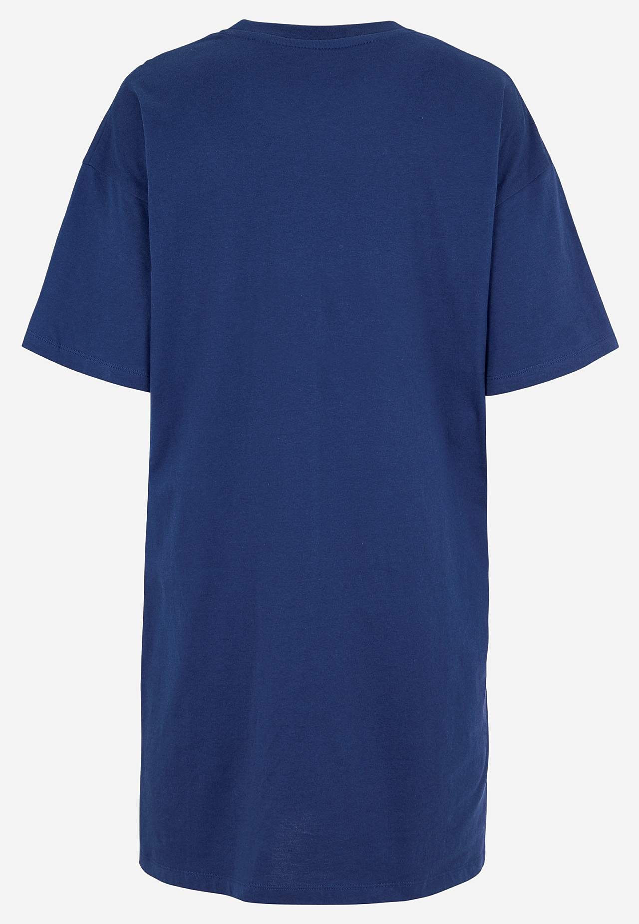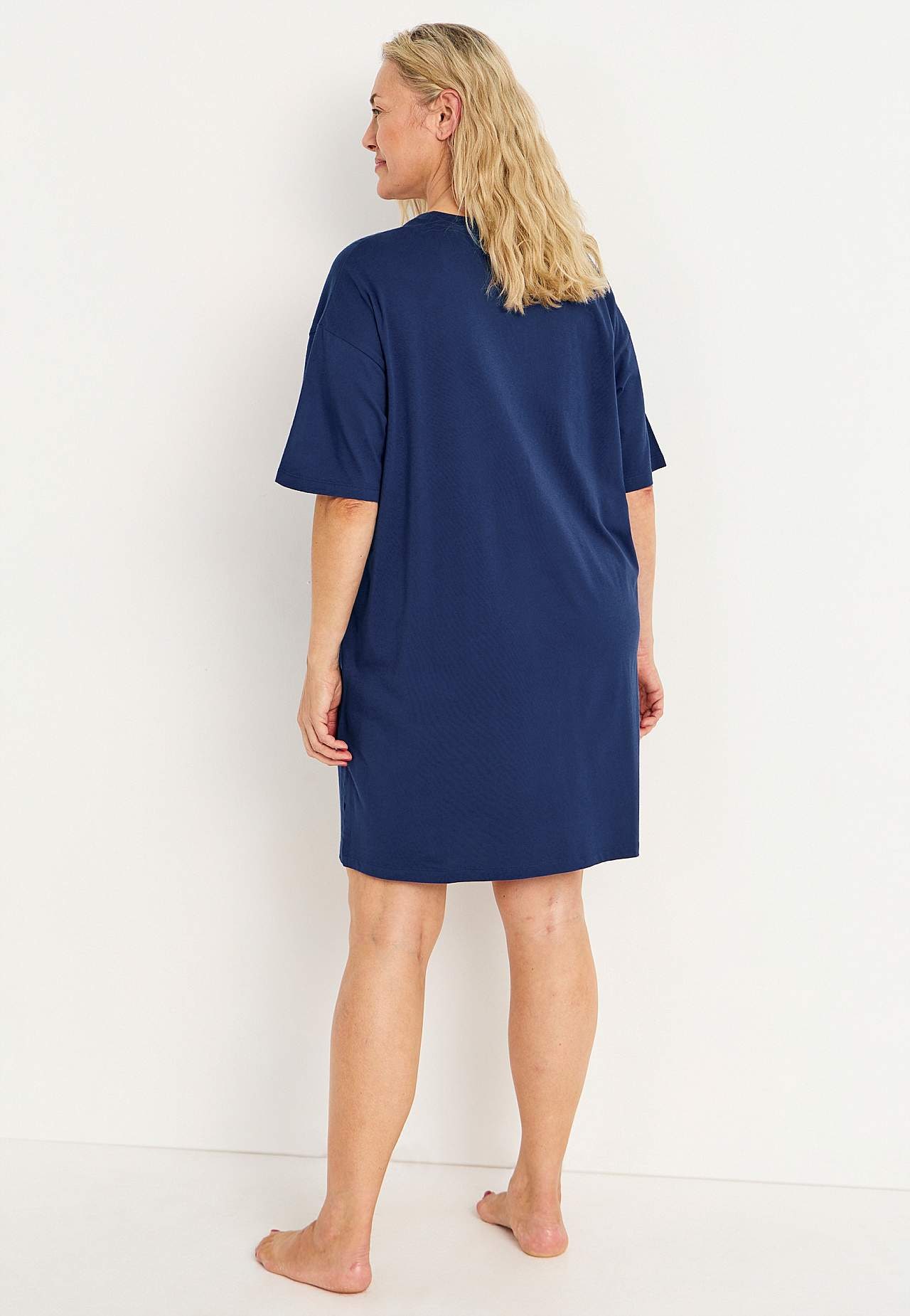 Krótka koszula nocna z miękkiej bawełny ekologicznej. Wzór z przodu. Swobodny i prosty fason. Zaokrąglony dekolt. Krótkie rękawy z obniżonym ramieniem. Prosty brzeg z rozcięciem po bokach. Długość od ramion z tyłu w zależności od rozmiaru ok. 88-95 cm.