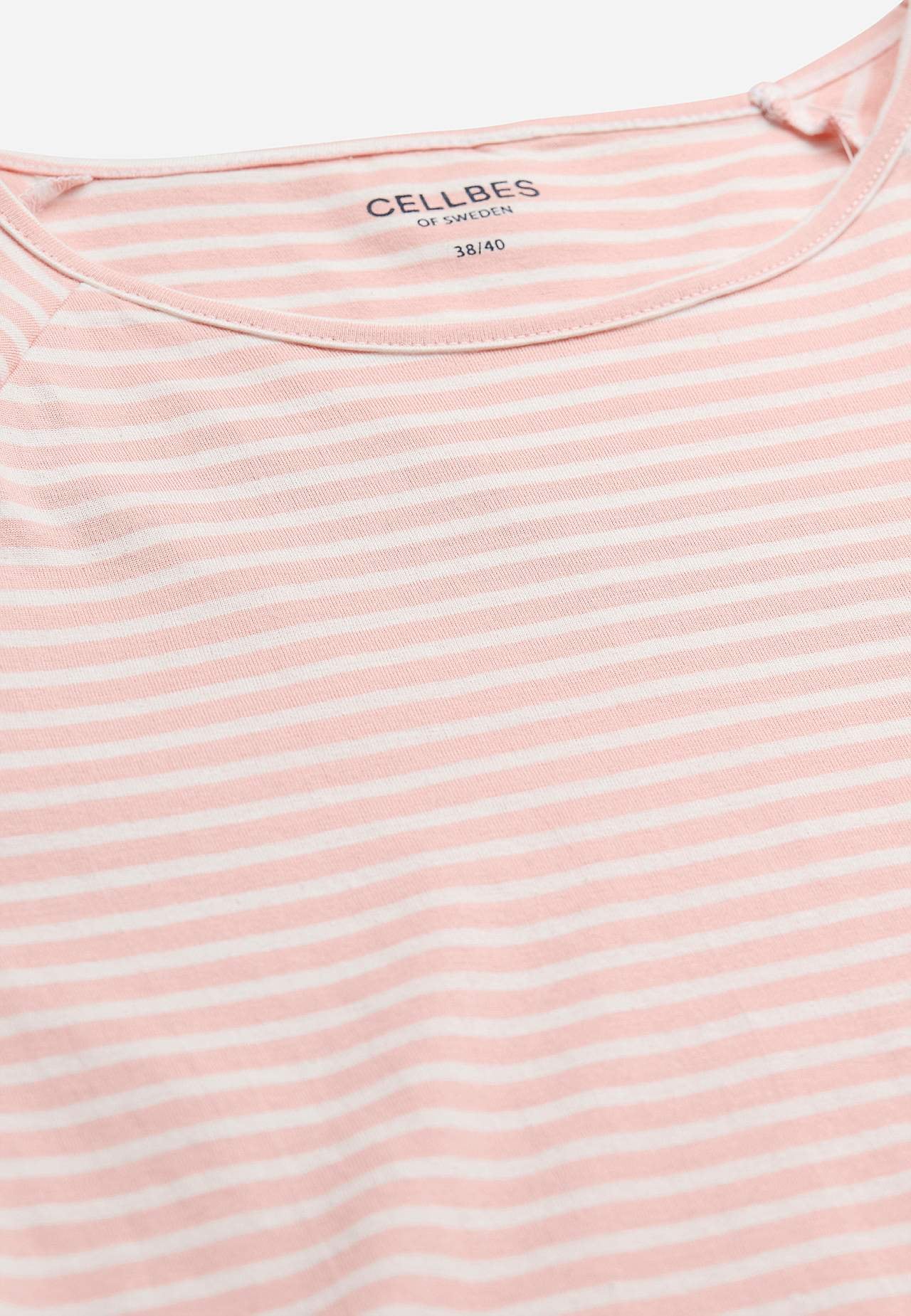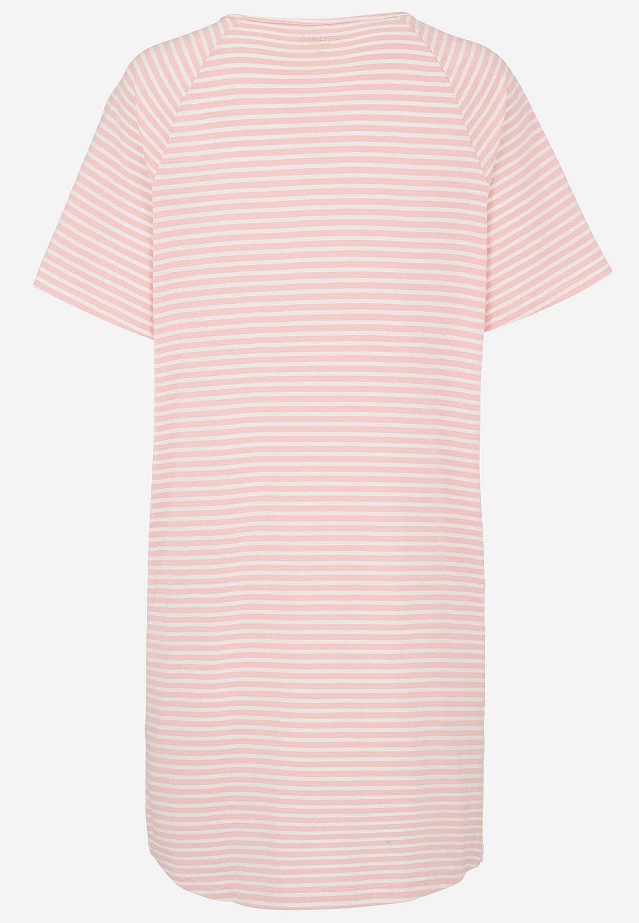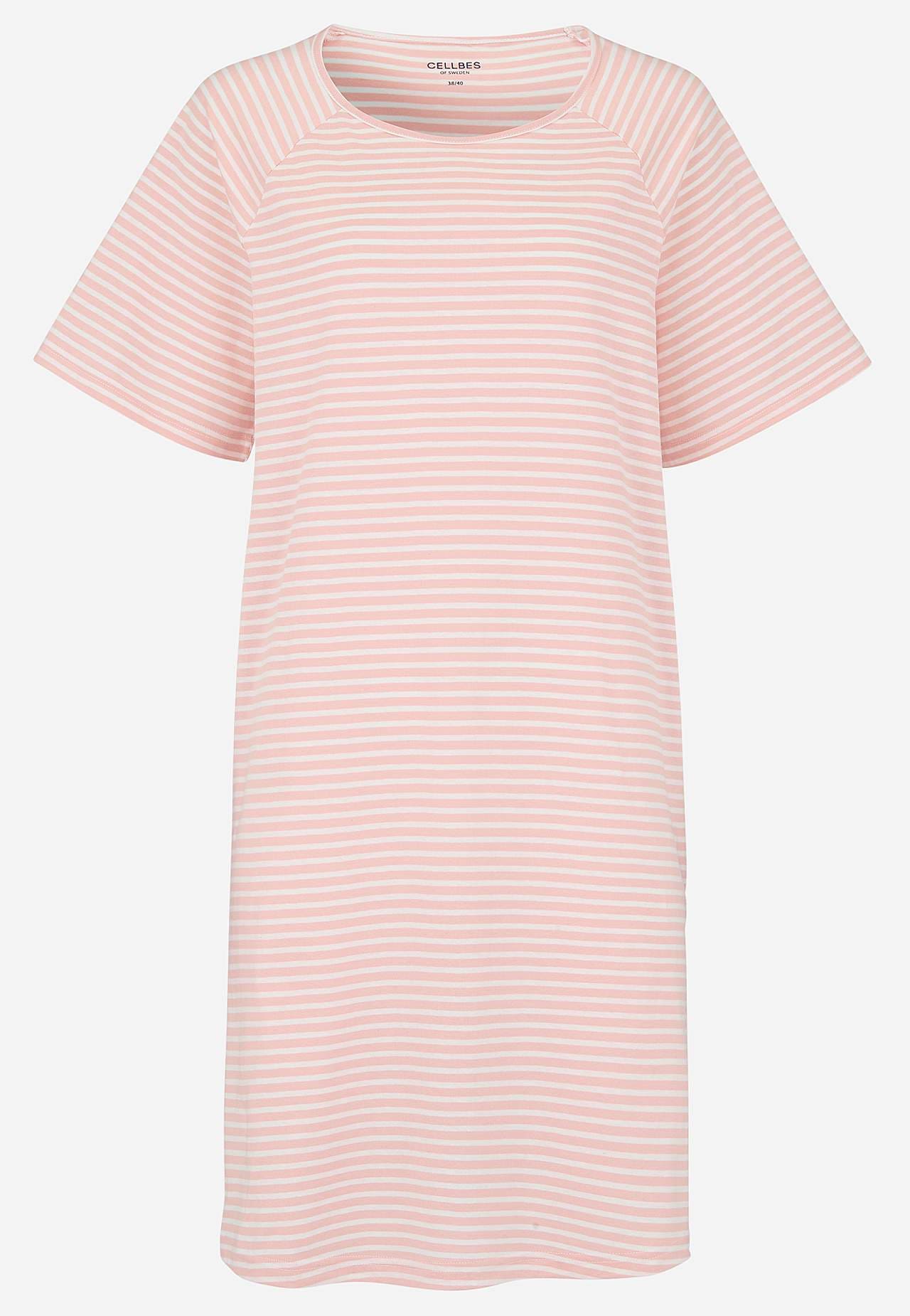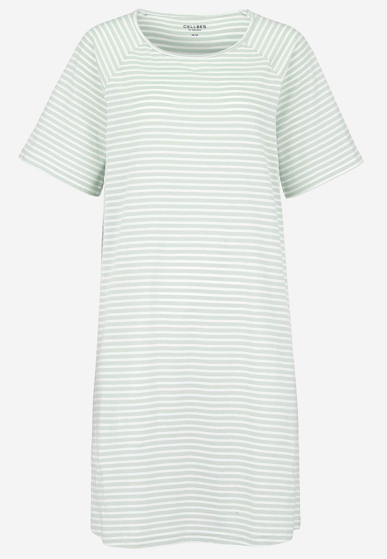 Krótka koszulka nocna z dzianiny z miękkiej bawełny ekologicznej. Fason swobodny i lekko w kształcie litery a. Pasiasty design. Zaokrąglony dekolt. Krótki reglanowy rękaw. Lekko zaokrąglony brzeg. Długość od ramion z tyłu w zależności od rozmiaru ok. 95-108 cm.