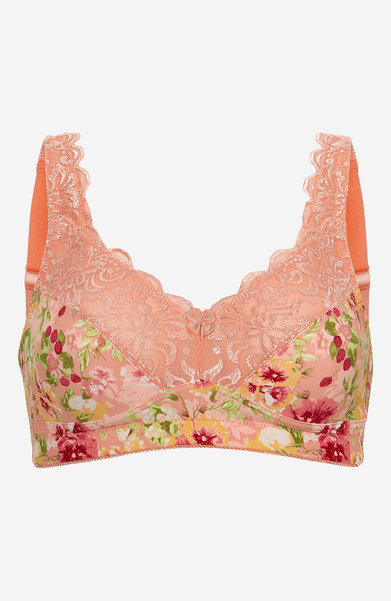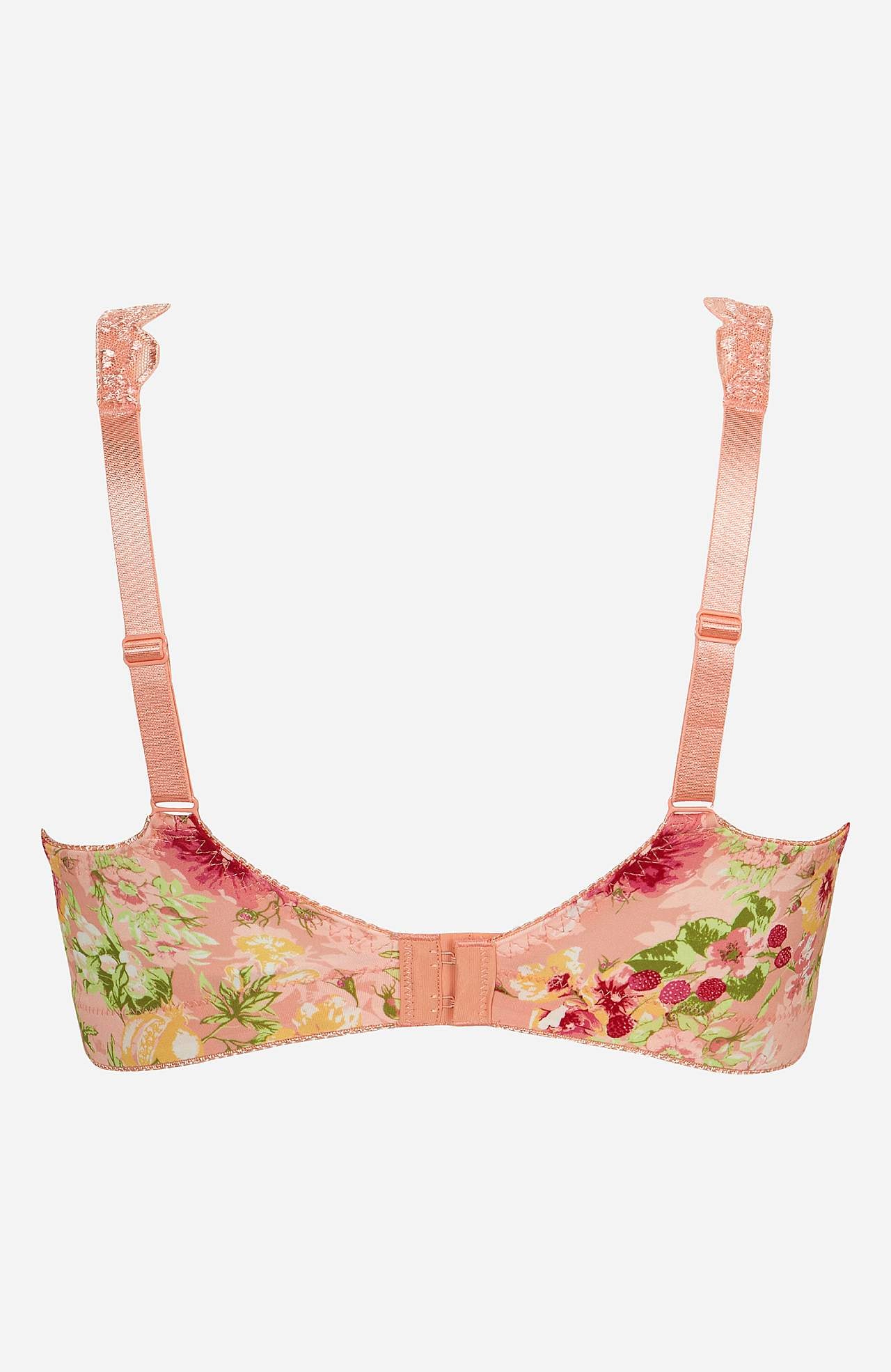 Fason bez fiszbiny z piękną i miękką koronką. Miseczki podszyte bawełną i które daje dobre wsparcie biustu. Regulowany pasek na ramieniu. Kokardka z przodu. 2-rzędowe zapięcie na guziki z tyłu, 3-rzędowe w większych rozmiarach.
