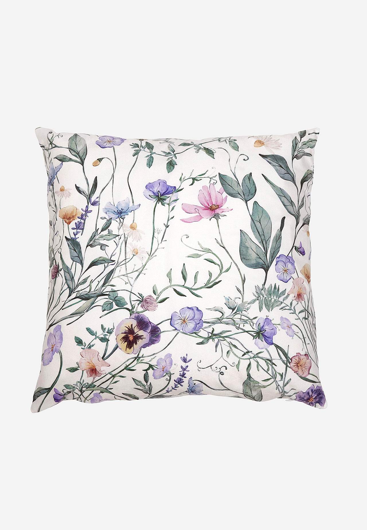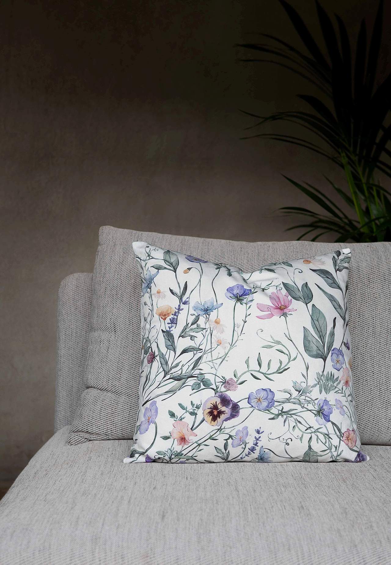 Poszewka na poduszkę z romantycznymi kwiatami, płatkiem i wijącymi się nóżkami. Miękka aksamitna tkanina z poliestru. Ten sam wzór z przodu i z tyłu. Boczny zamek błyskawiczny. Rozmiar: 45x45 cm.