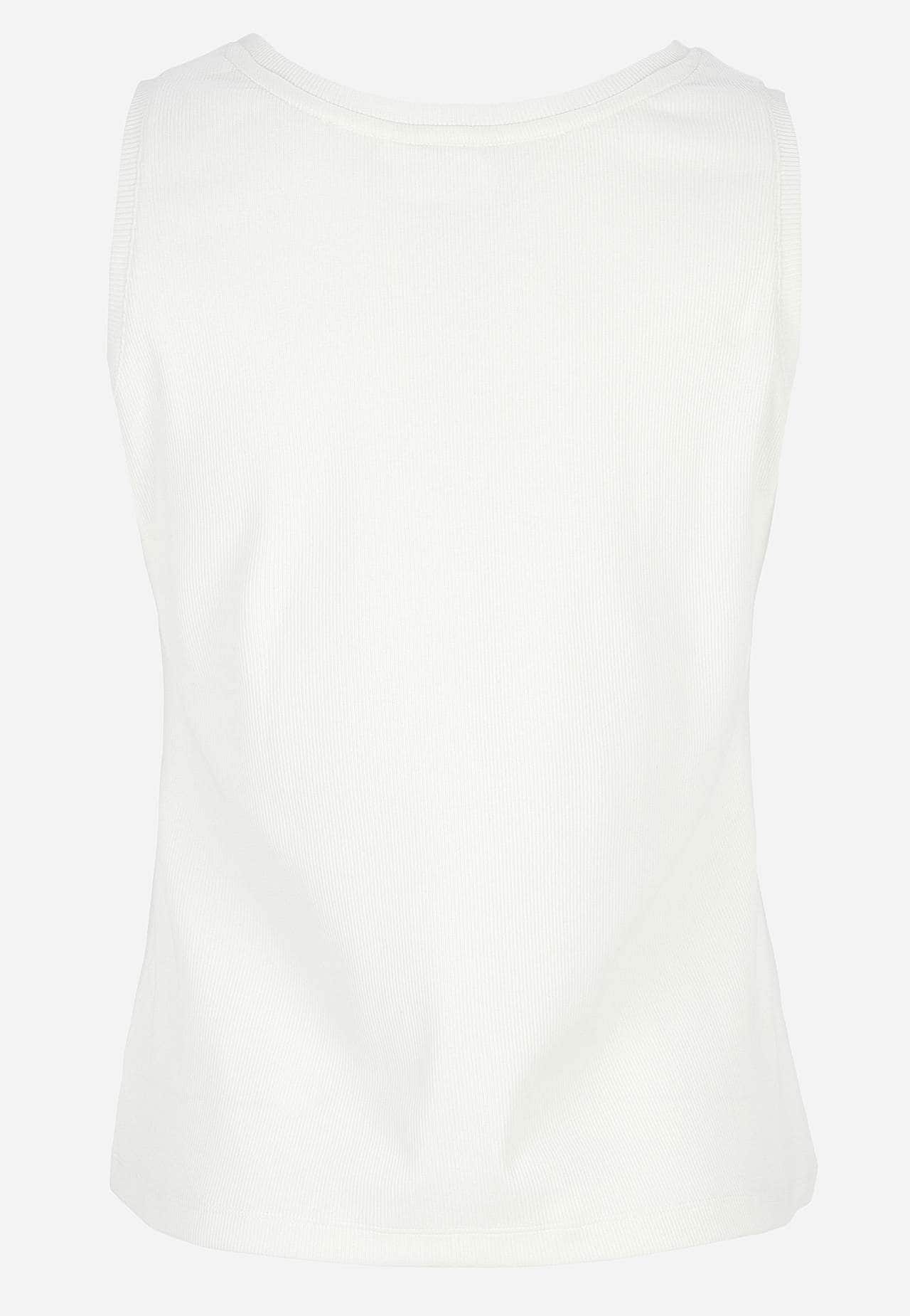 Koszulka bez rękawów z prążkowanym wykończeniem i okrągłym dekoltem – podstawowy element garderoby. Elastyczny i wygodny dżersej. Rugularny fason. Ekologiczna bawełna. Zaokrąglona szyja z lamówką. Lamówka w pachach. Prosty brzeg. Długość od ramion w zależności od rozmiaru ok. 58-74 cm.