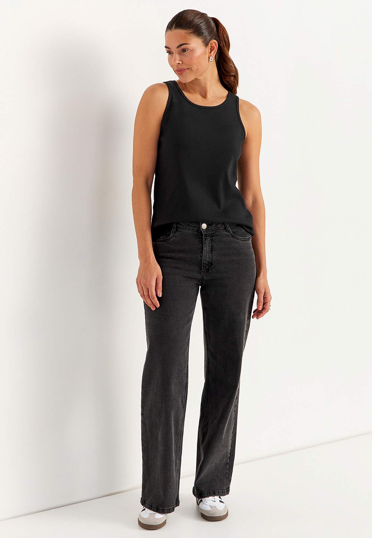 Koszulka bez rękawów z prążkowanym wykończeniem i okrągłym dekoltem – podstawowy element garderoby. Elastyczny i wygodny dżersej. Rugularny fason. Ekologiczna bawełna. Zaokrąglona szyja z lamówką. Lamówka w pachach. Prosty brzeg. Długość od ramion w zależności od rozmiaru ok. 58-74 cm.