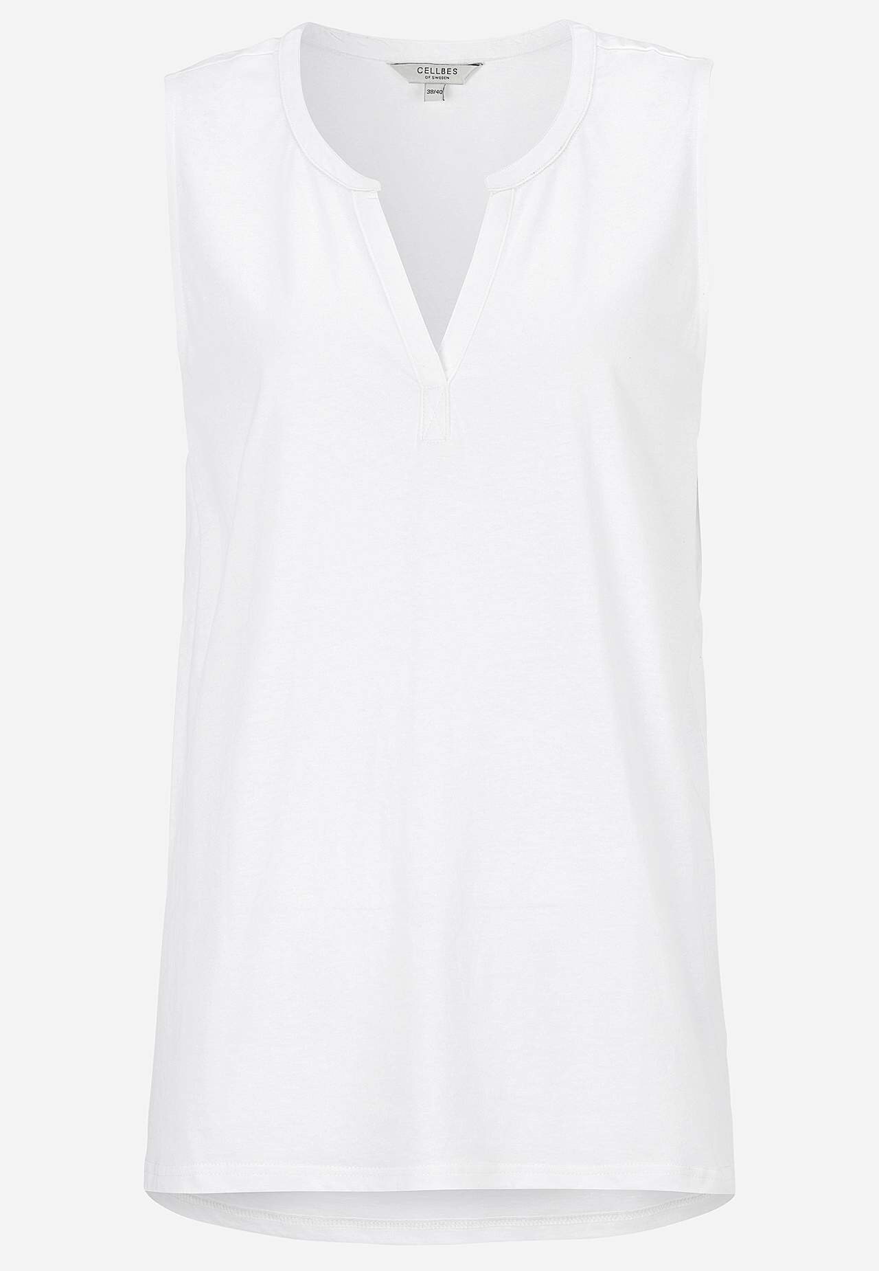 Superwygodny i przewiewny top z miękkiego dżerseju bawełnianego. Lekko wyprofilowany fason. Okrągły dekolt z wycięciem w kształcie litery v. Lekko zaokrąglony brzeg. Długość od ramion w zależności od rozmiaru ok. 68-78 cm.