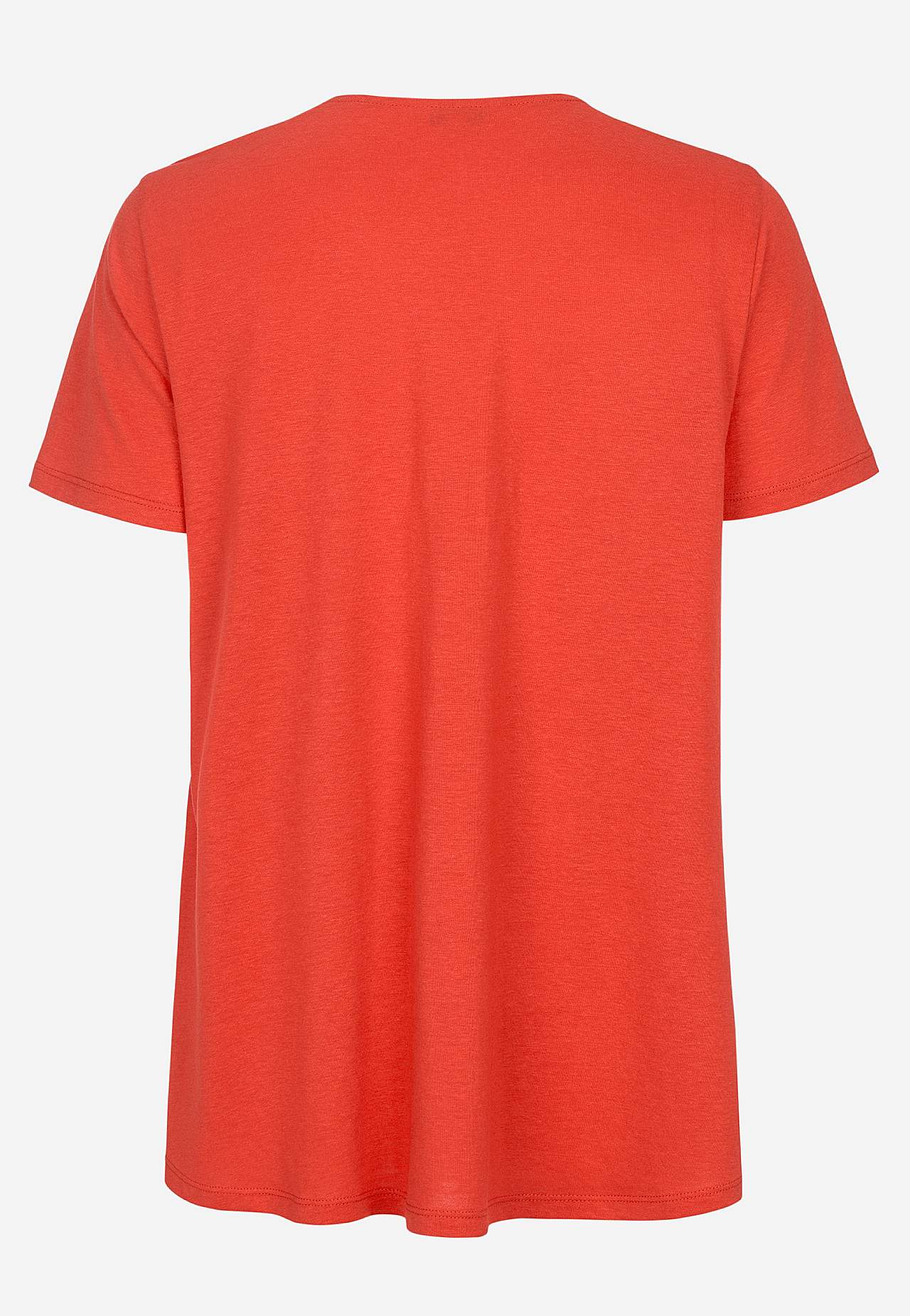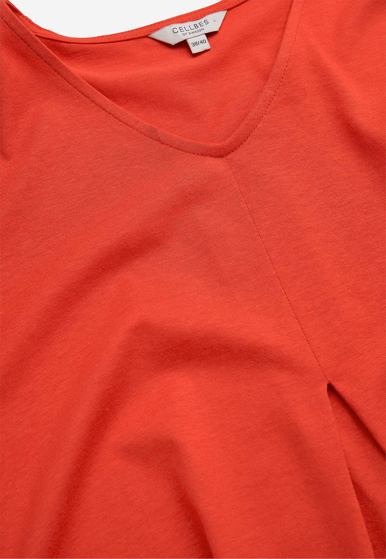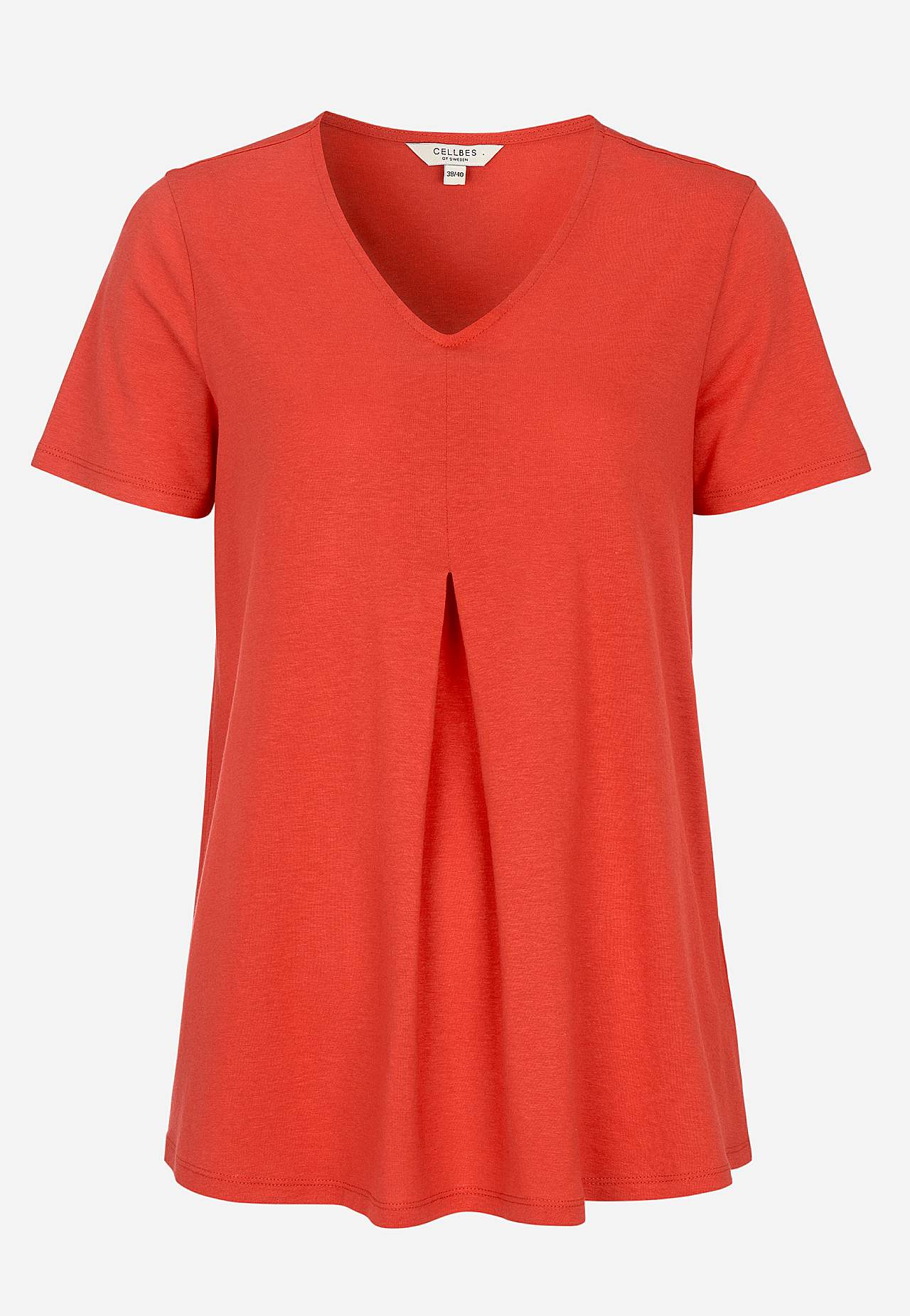 Top z dżerseju z przyjemnie miękkiej mieszanki bawełny i modalu. Rozszerzany na dole luźny fason ze zaokrąglonym brzegiem. Z dekoltem w serek. Twarzowa plisa prosta nad biustem. Krótkie rękawy. Długość od ramion w zależności od rozmiaru ok. 69-84 cm.