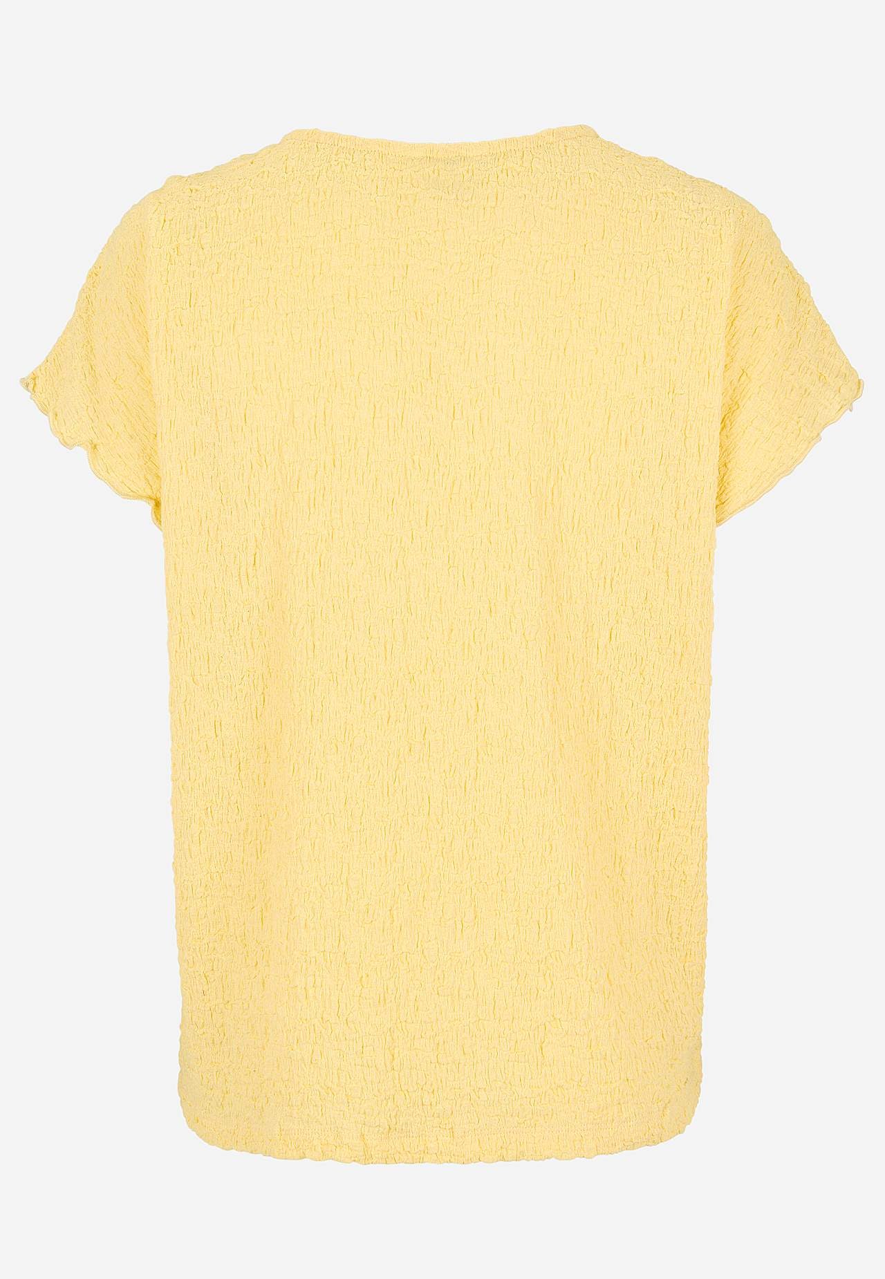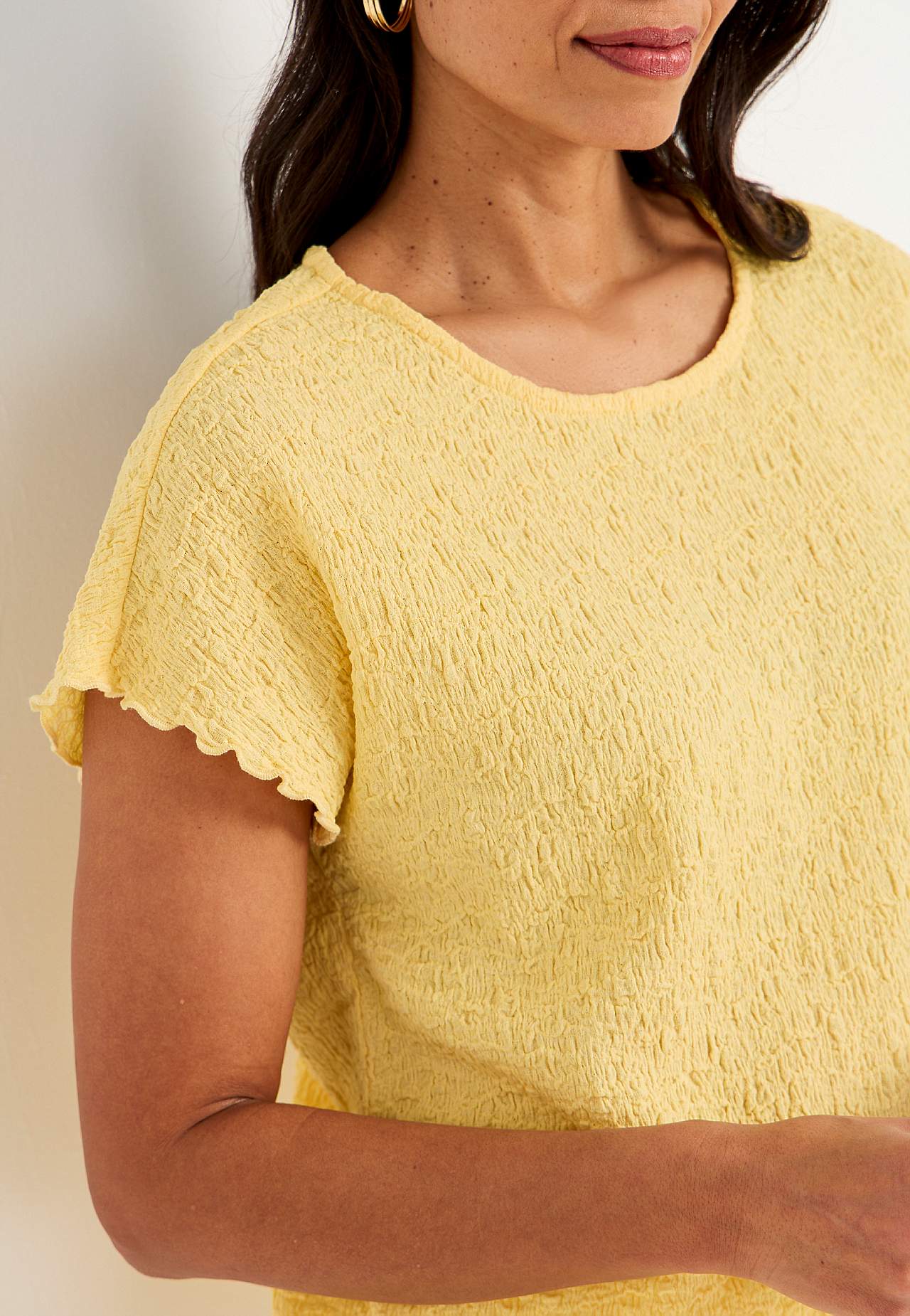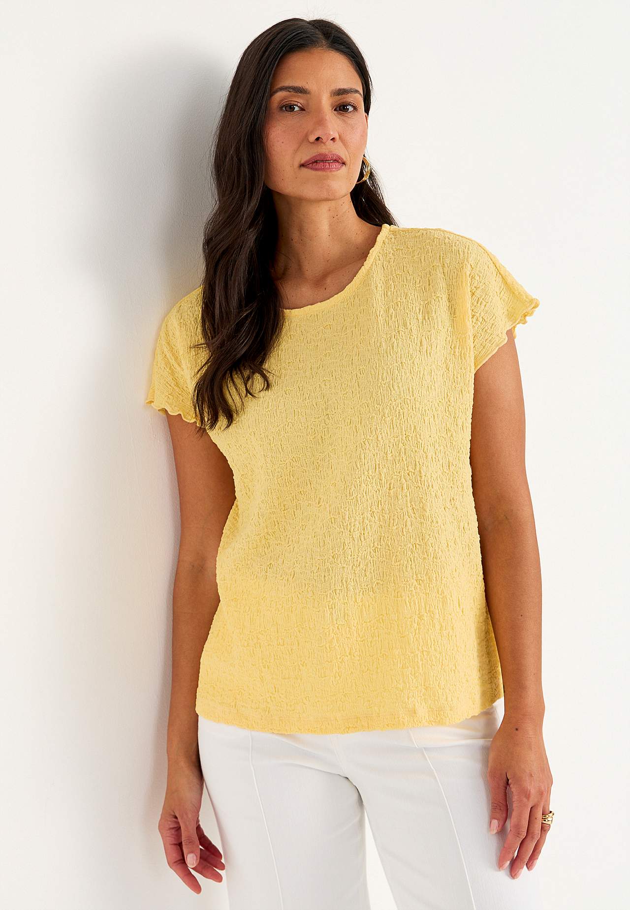 Top z wygodnej i elastycznej mieszanki bawełny ze strukturą. Rugularny fason. Zaokrąglona szyja. Krótkie kapturkowe rękawy z końcami rękawa falistymi i wykończonymi overlockiem. Prosty brzeg. Długość z tyłu zależna od rozmiaru, ok. 62-73 cm.