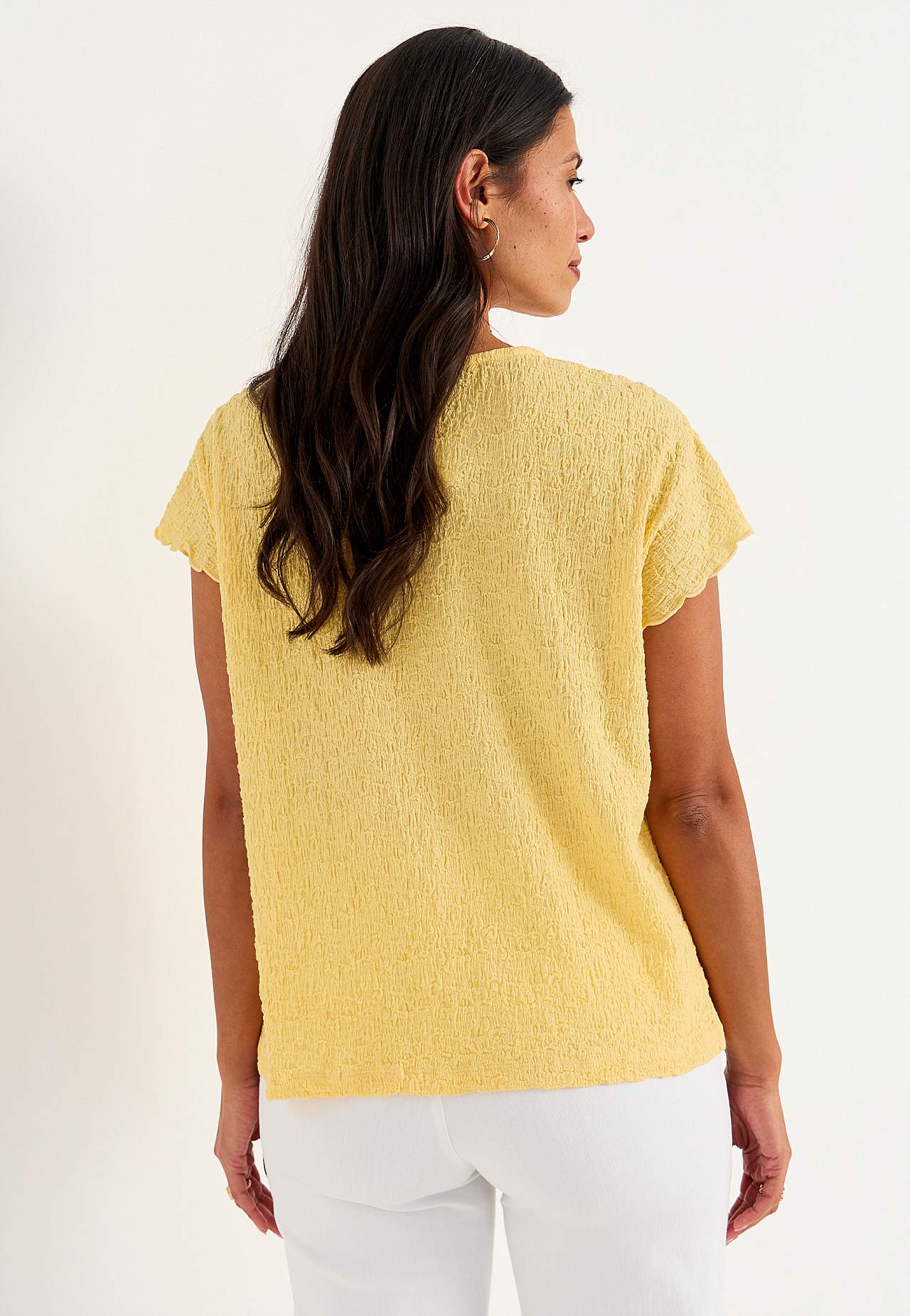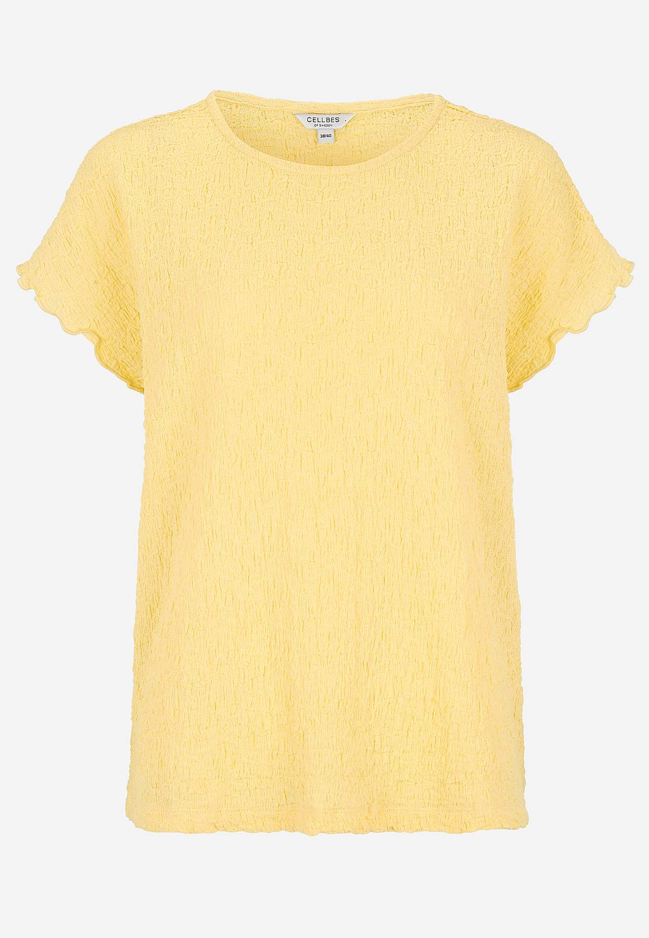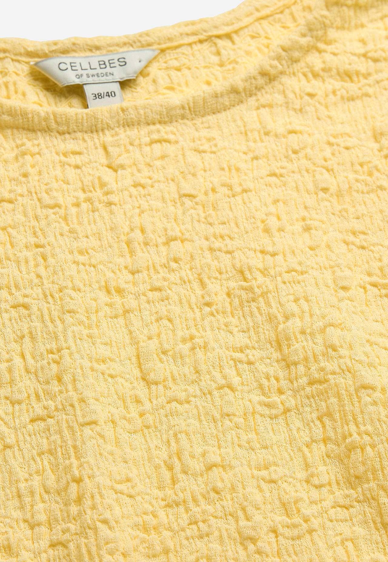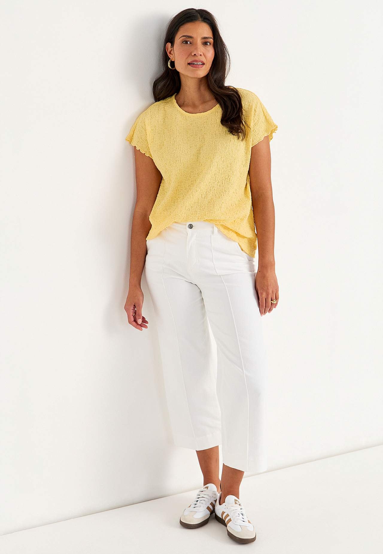 Top z wygodnej i elastycznej mieszanki bawełny ze strukturą. Rugularny fason. Zaokrąglona szyja. Krótkie kapturkowe rękawy z końcami rękawa falistymi i wykończonymi overlockiem. Prosty brzeg. Długość z tyłu zależna od rozmiaru, ok. 62-73 cm.