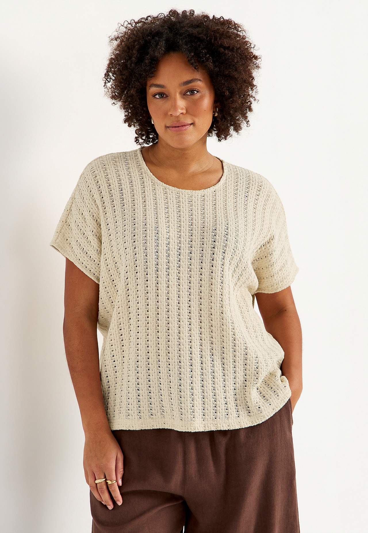 Dzianinowy i przewiewny top z dżerseju z imponującym ażurowym wzorem. Fajnie się nosi na bluzce lub podkoszulku. Luźny fason. Zaokrąglony dekolt. Krótkie kapturkowe rękawy. Prosty brzeg. Długość od ramion w zależności od rozmiaru ok. 60-71 cm.