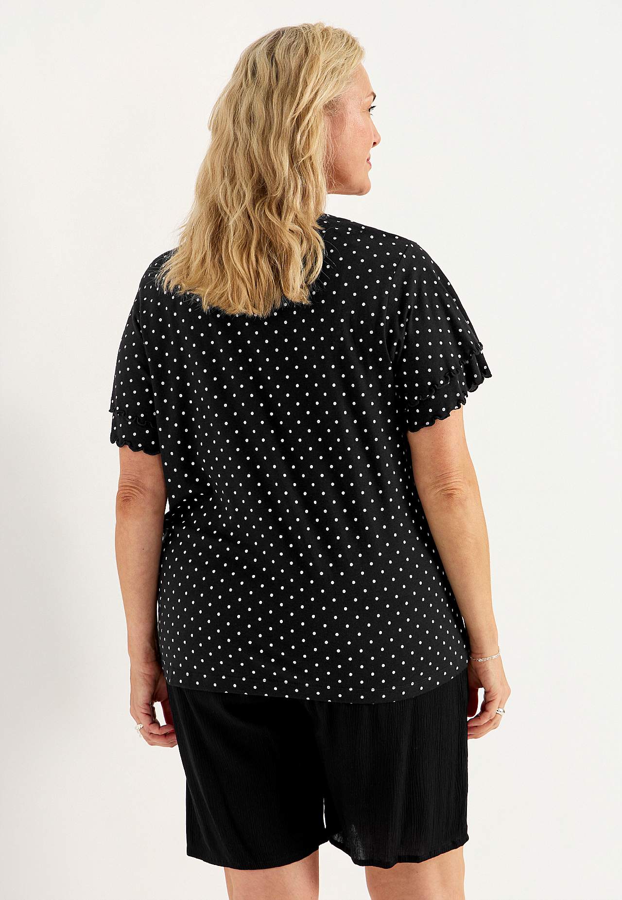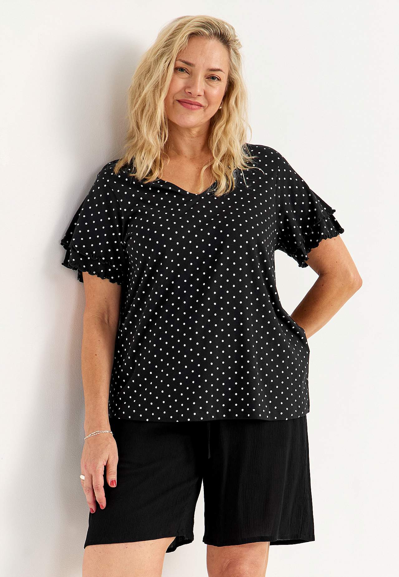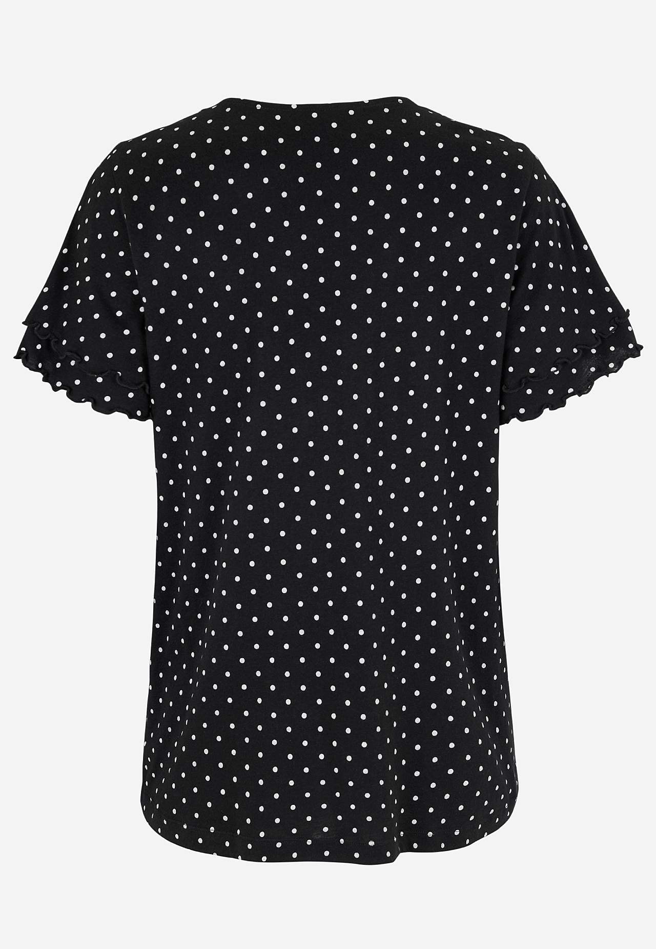 Top z kobiecymi rękawami motylkami. Miękki dżersej z mieszanki bawełny i wiskozy. Fason lekko w kształcie litery a. Dekolt z dekoltem w serek. Krótkie rękawy motylki z podwójną warstwą i wykończonymi overlockiem i dekoracyjnymi szyciami. Lekko zaokrąglony brzeg. Długość z tyłu zależna od rozmiaru, ok. 65-73 cm.