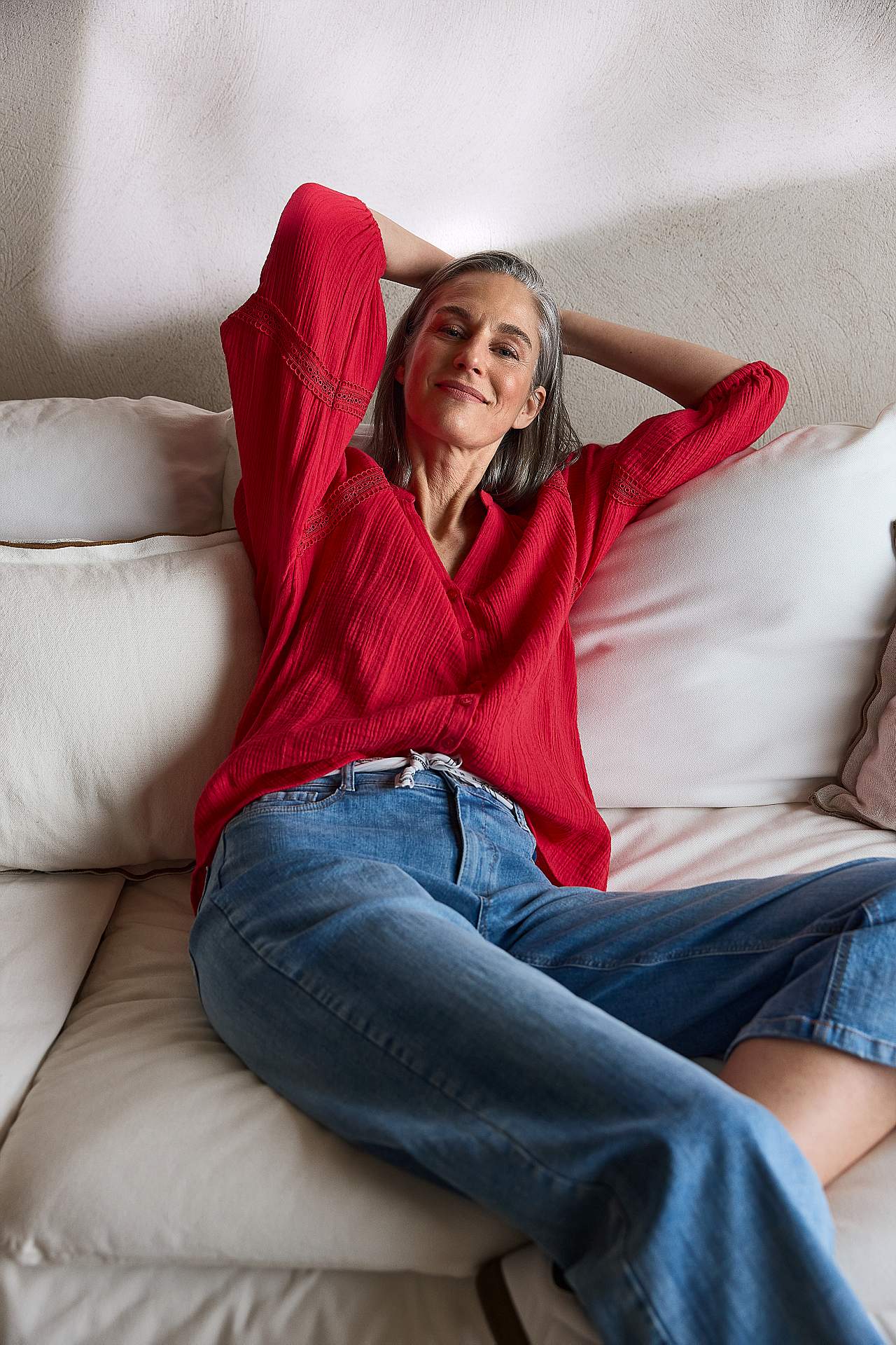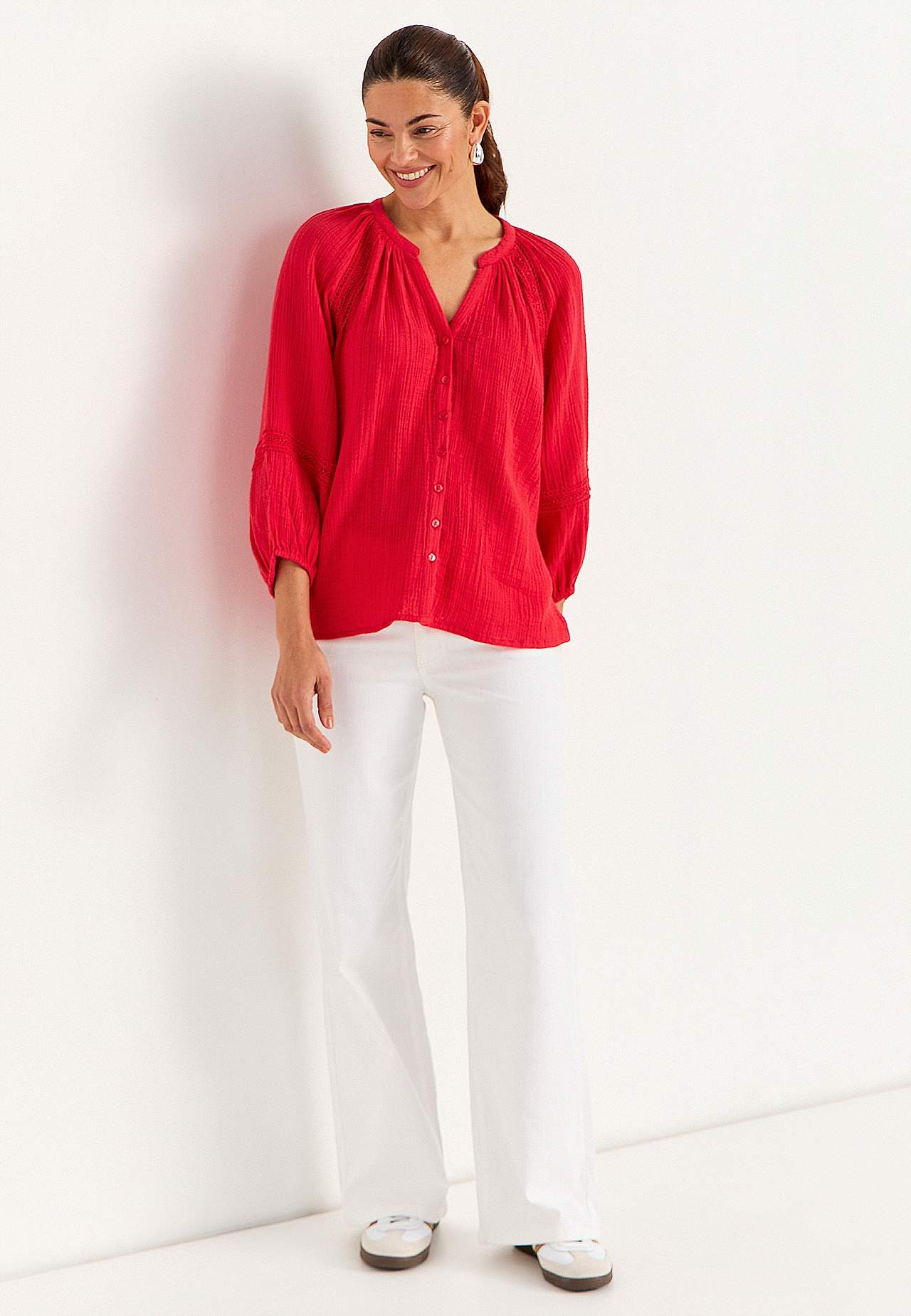 Przewiewna bluzka z miłymi koronkowymi lamówkami na rękawach. Tkany materiał z przyjemnego muślinu bawełnianego ze strukturą. Luźny fason. Zaokrąglona szyja z małą wycięciem pod szyją w serek. Zapięcie na guzik z przodu. Szerokie reglanowe rękawy o długości 3/4 z bufą i gumką na mankietach. Delikatna, szczegółowa koronka wz... Czytaj więcej