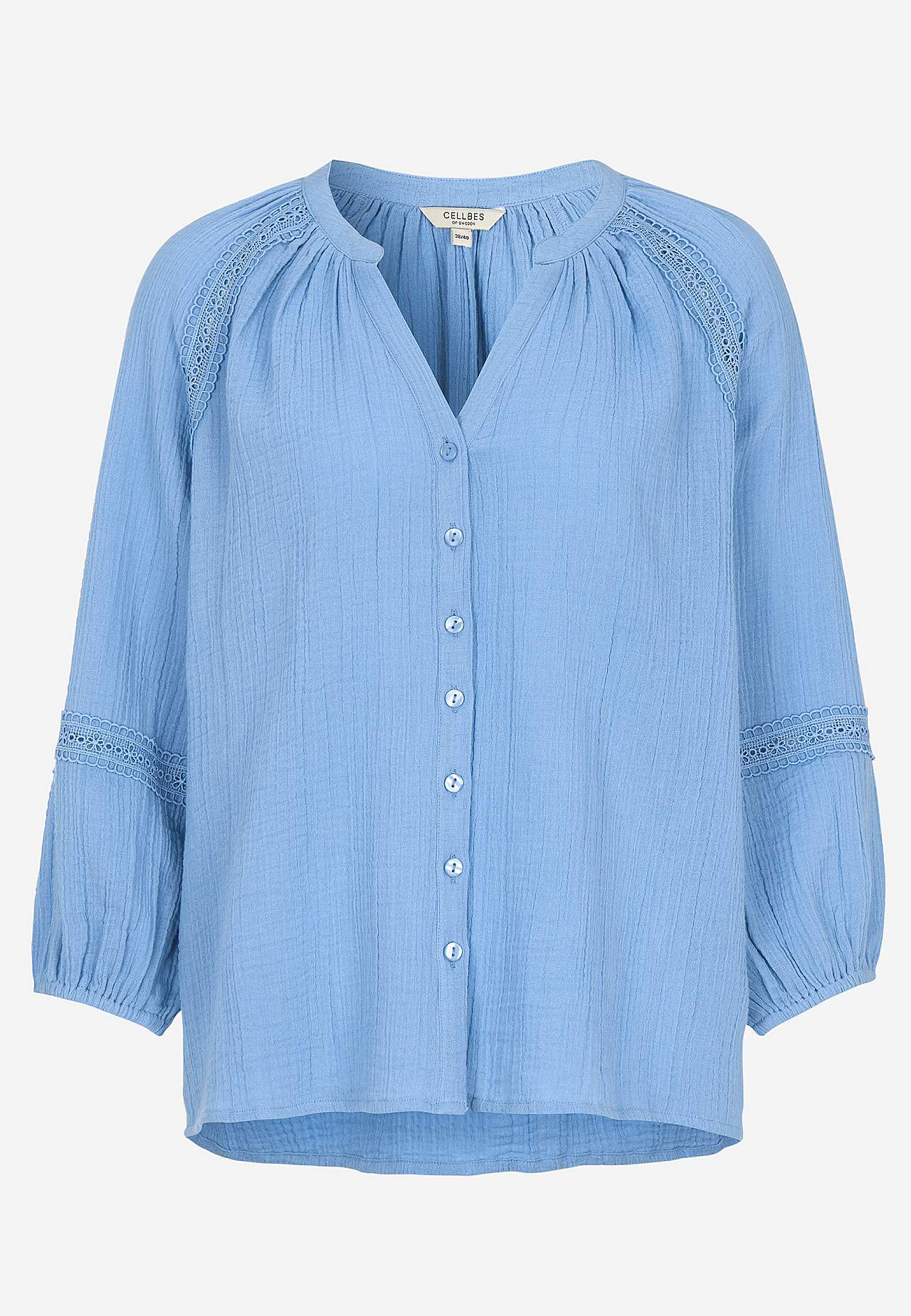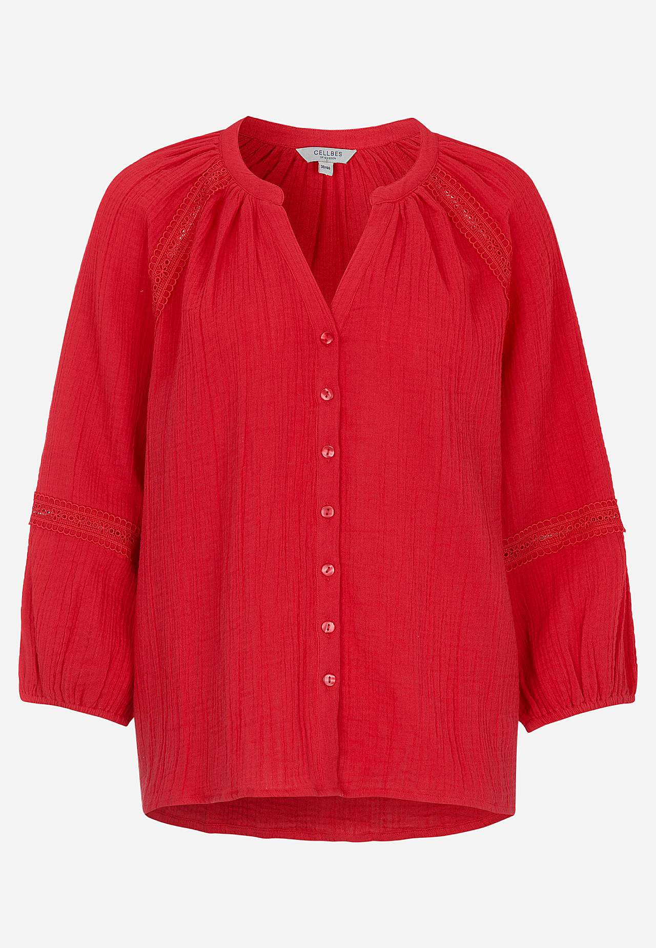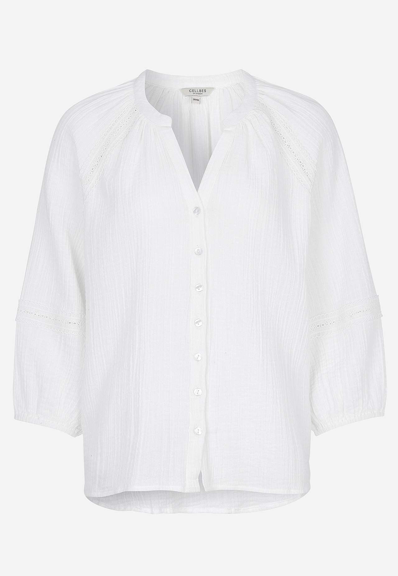 Przewiewna bluzka z miłymi koronkowymi lamówkami na rękawach. Tkany materiał z przyjemnego muślinu bawełnianego ze strukturą. Luźny fason. Zaokrąglona szyja z małą wycięciem pod szyją w serek. Zapięcie na guzik z przodu. Szerokie reglanowe rękawy o długości 3/4 z bufą i gumką na mankietach. Delikatna, szczegółowa koronka wz... Czytaj więcej