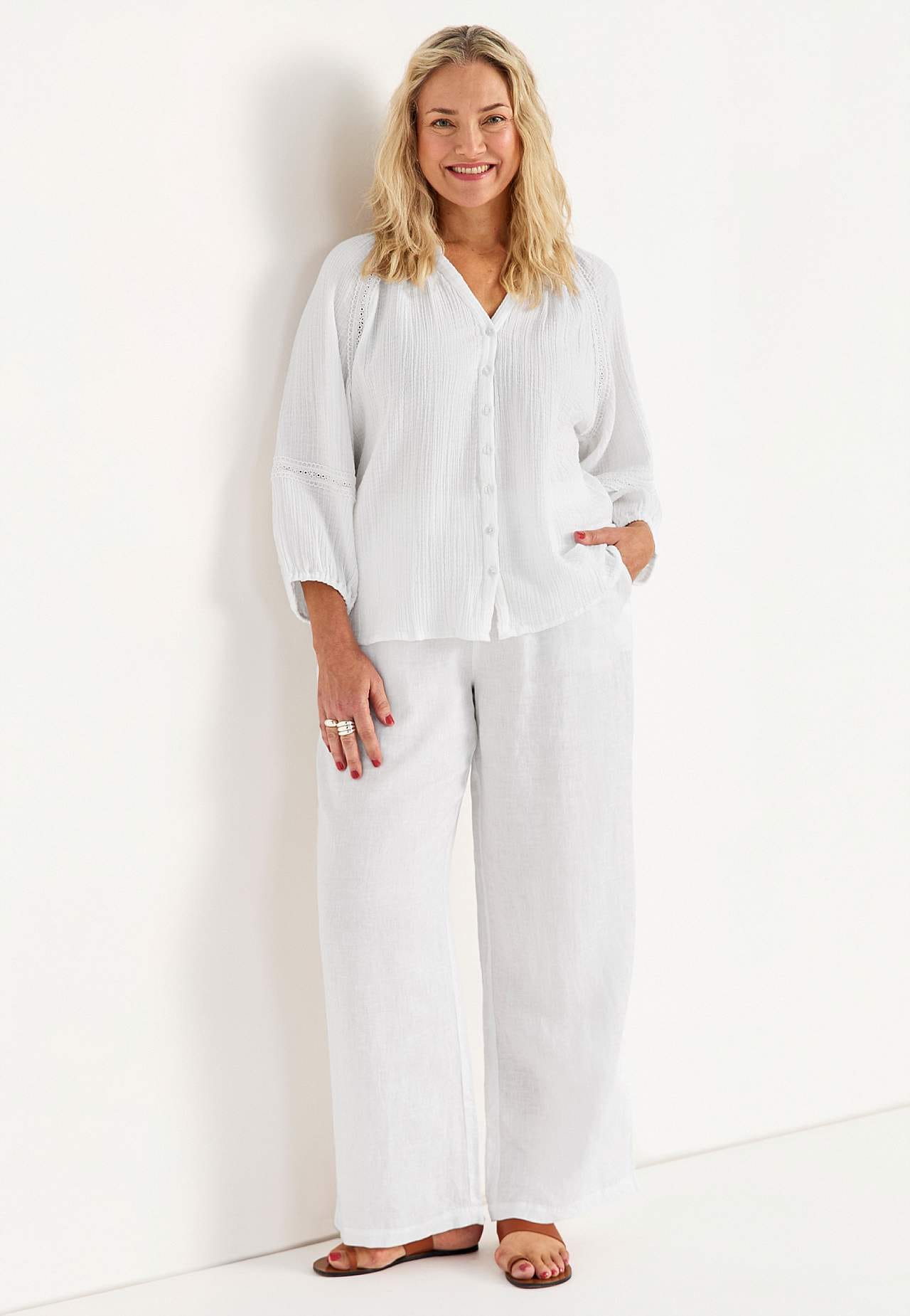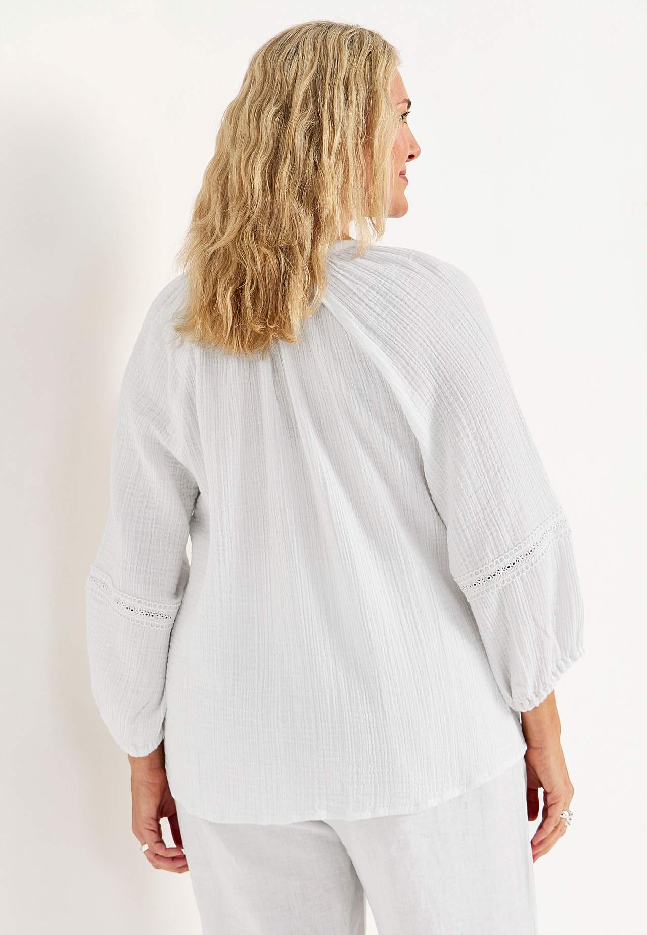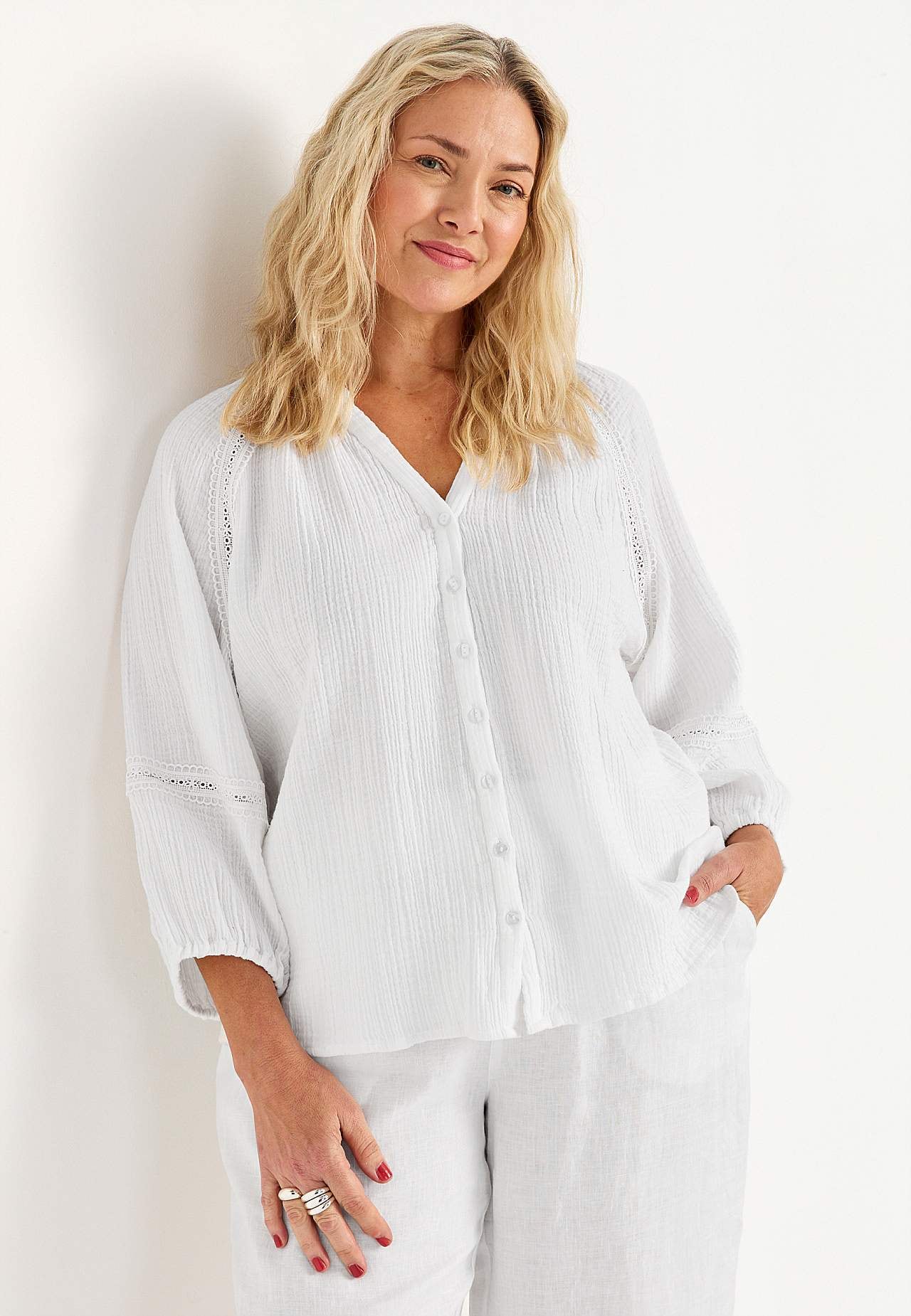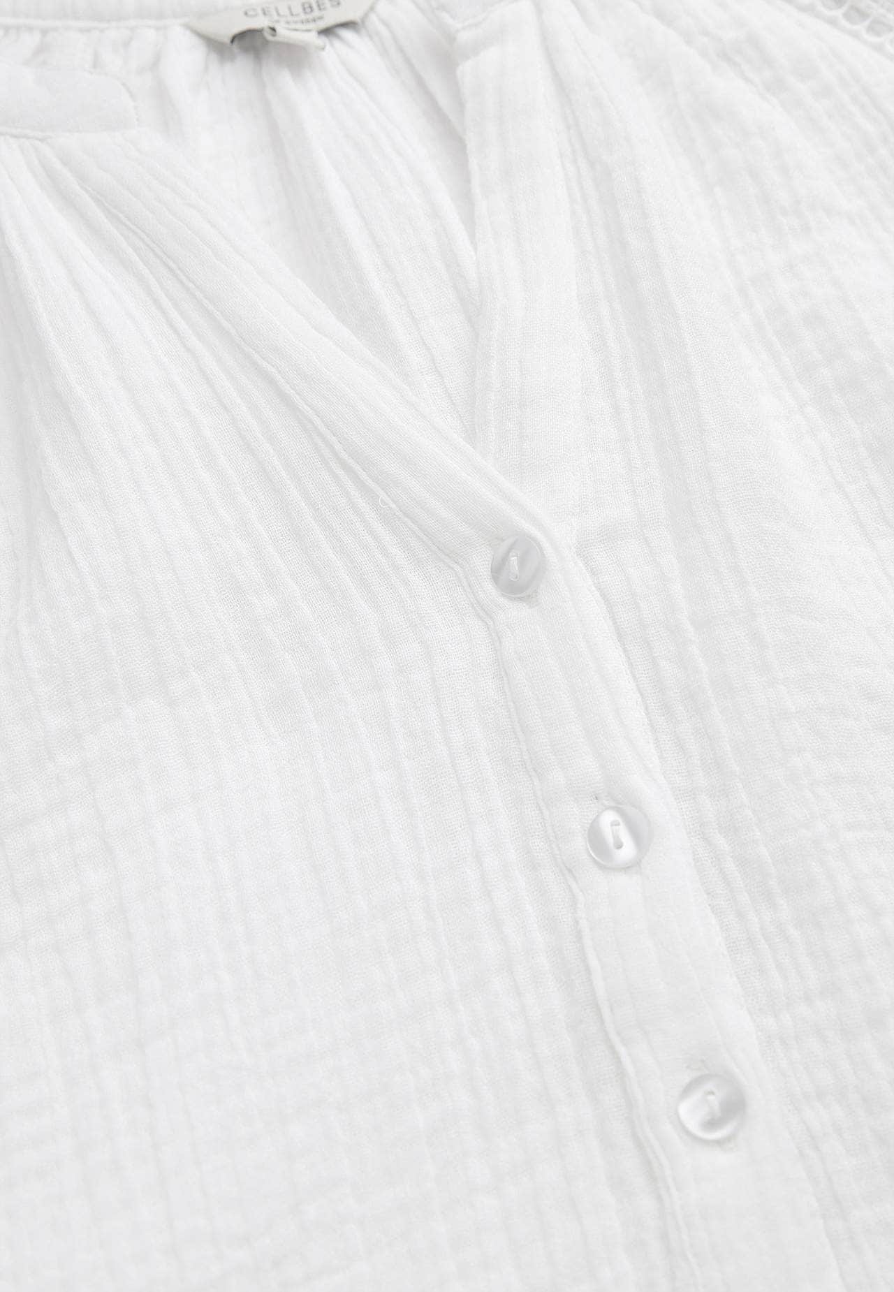 Przewiewna bluzka z miłymi koronkowymi lamówkami na rękawach. Tkany materiał z przyjemnego muślinu bawełnianego ze strukturą. Luźny fason. Zaokrąglona szyja z małą wycięciem pod szyją w serek. Zapięcie na guzik z przodu. Szerokie reglanowe rękawy o długości 3/4 z bufą i gumką na mankietach. Delikatna, szczegółowa koronka wz... Czytaj więcej