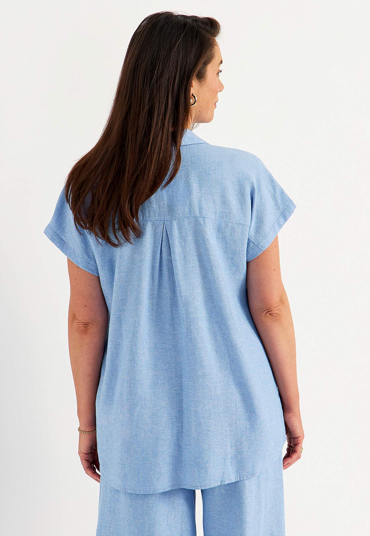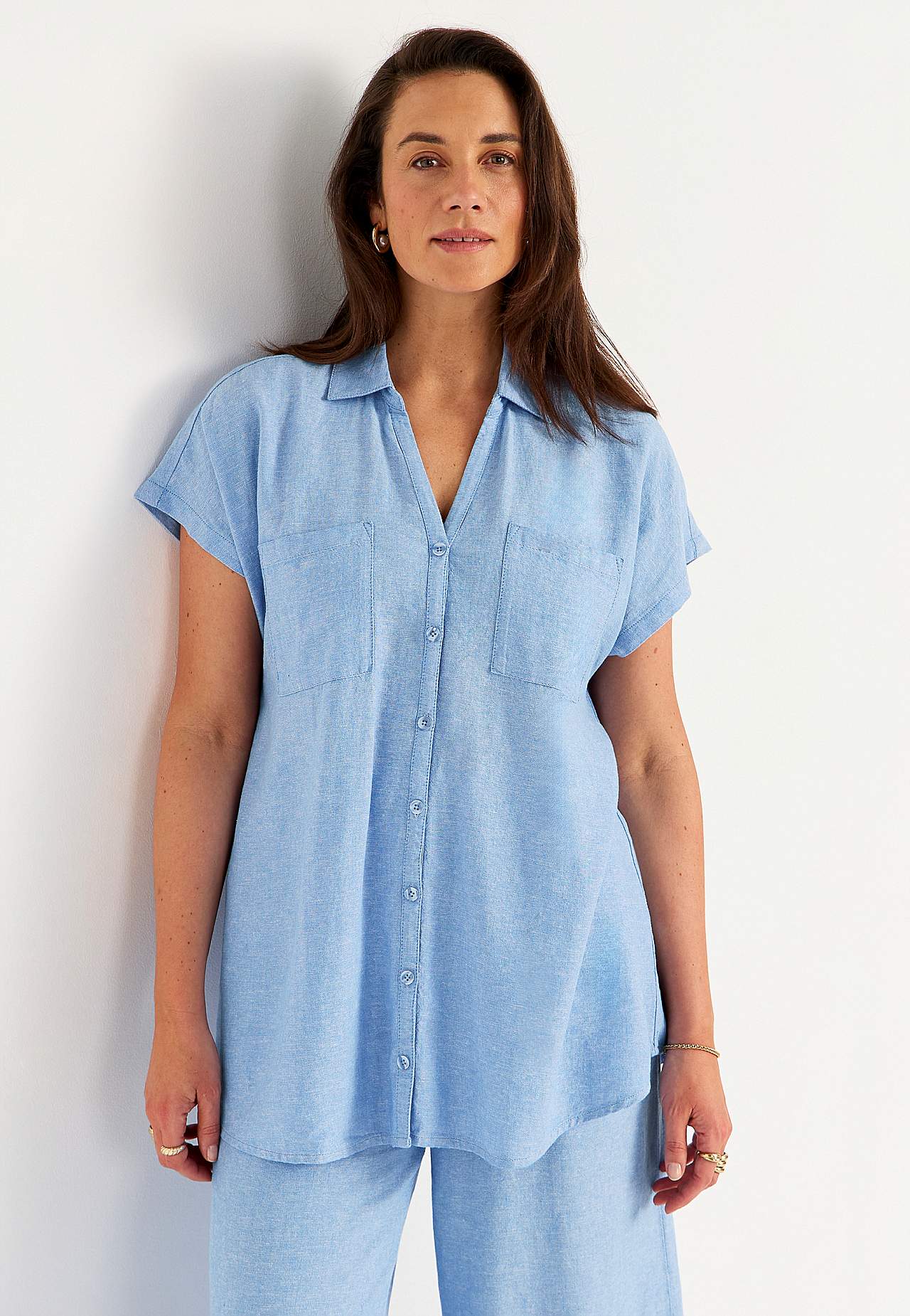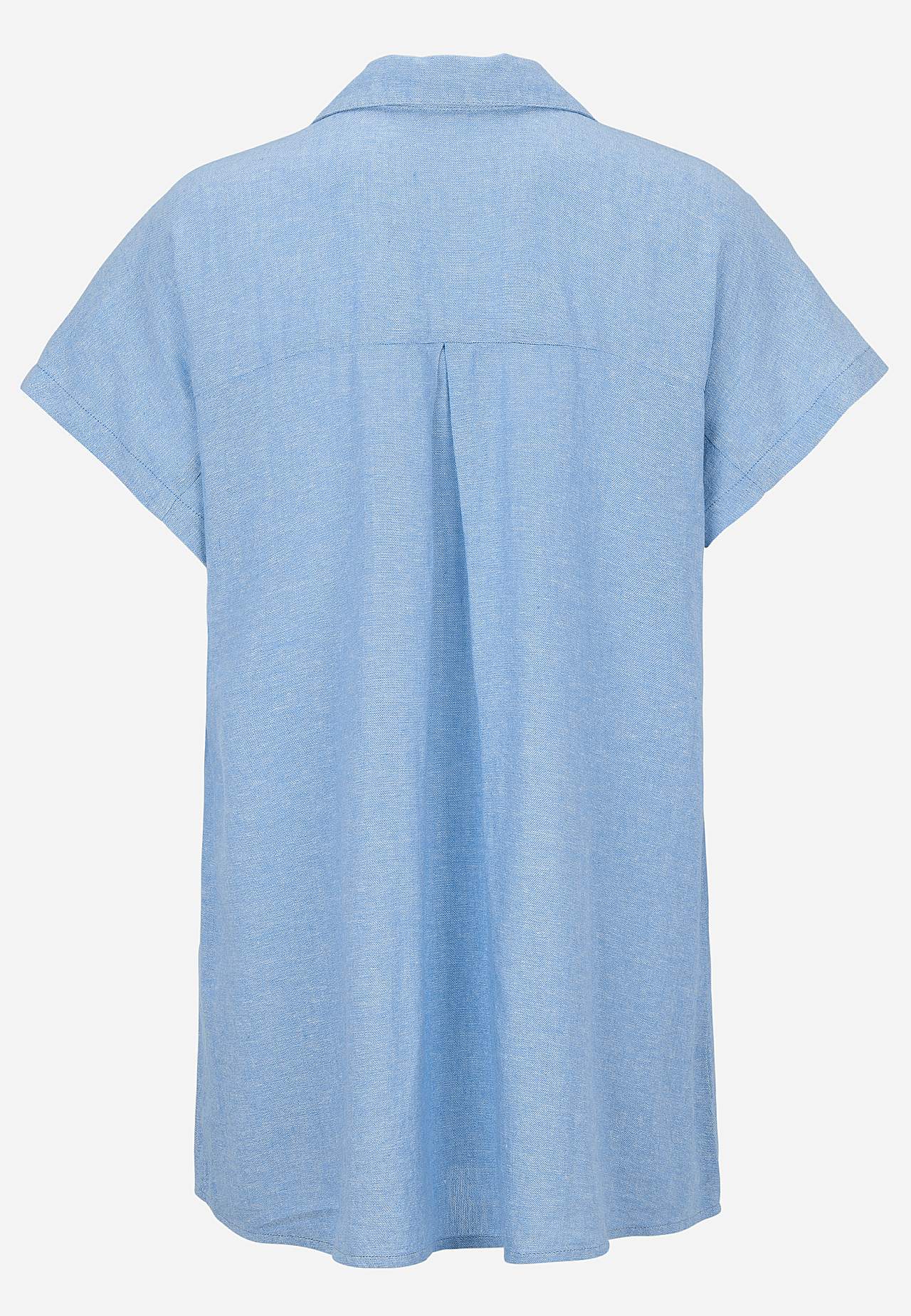 Tkana długa koszula z przewiewnego mieszanki lnu i wiskozy. Miękki i nieco grubszy materiał z naturalną strukturą. Swobodny fason. Kieszenie na piersi. Karczek z tyłu z dekoracyjną zakładką. Zaokrąglony brzeg. Długość od ramion w zależności od rozmiaru ok. 77-84 cm.