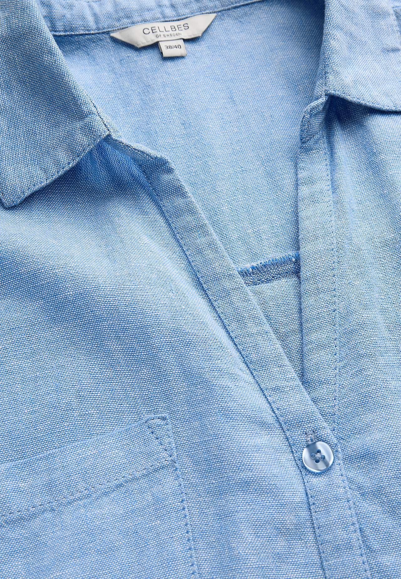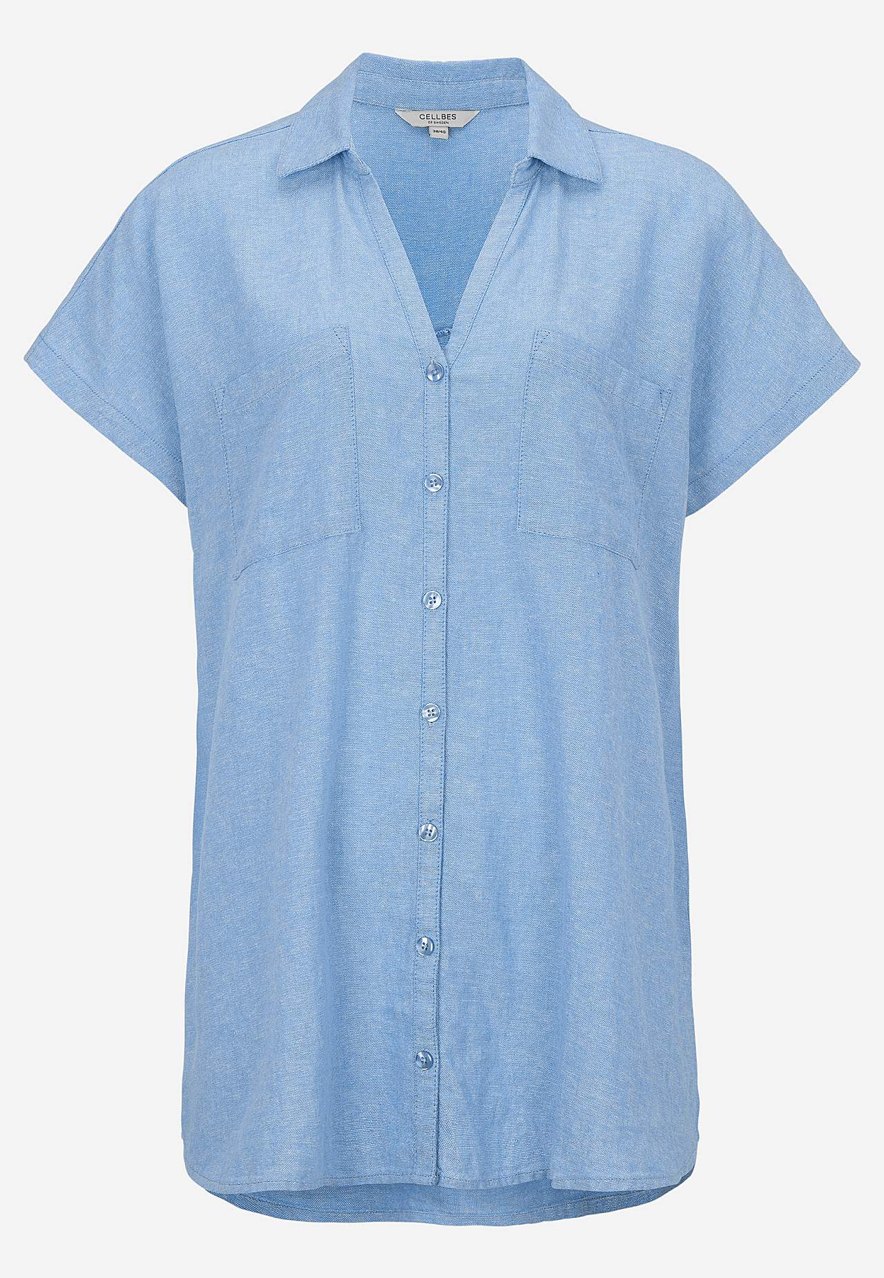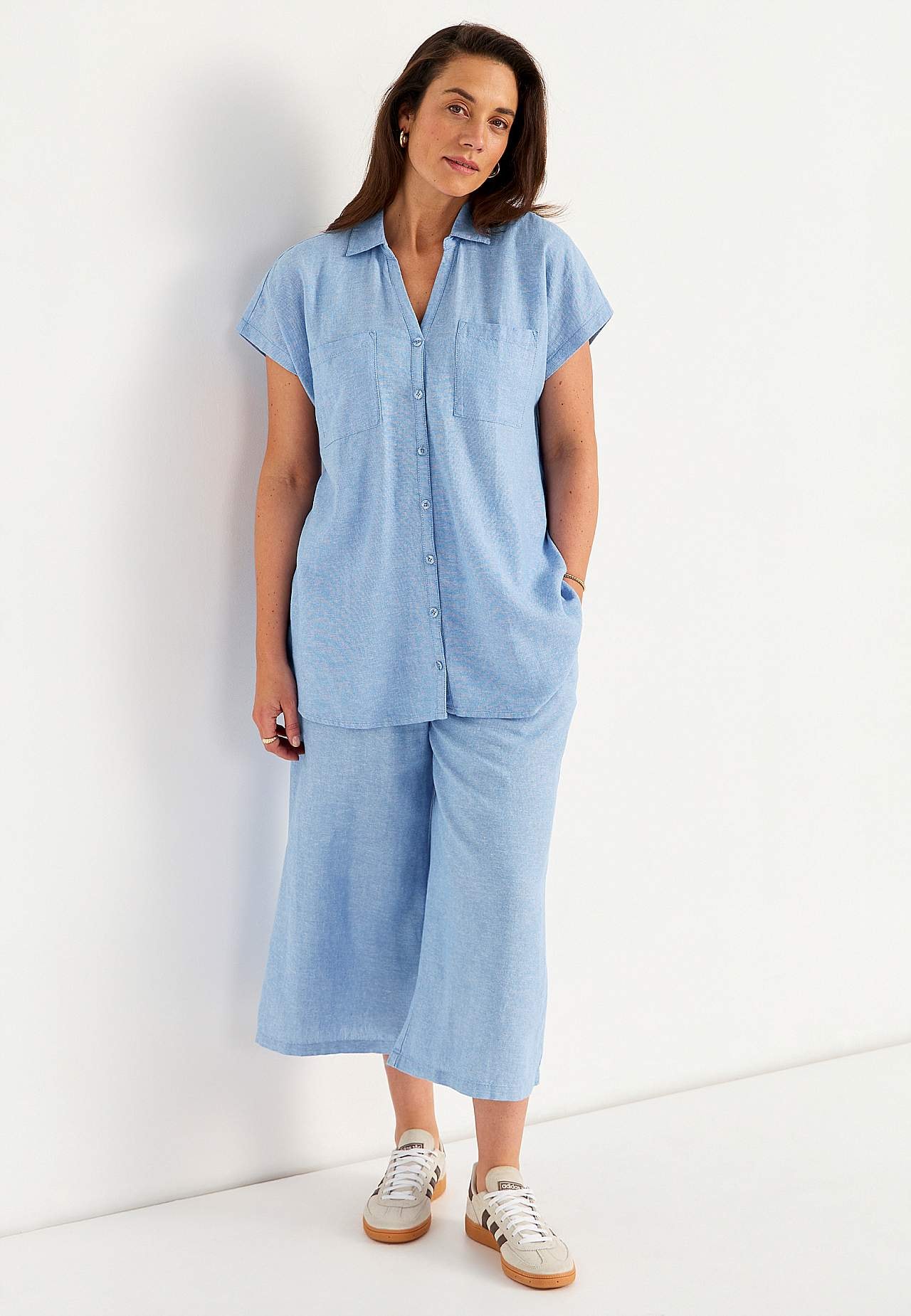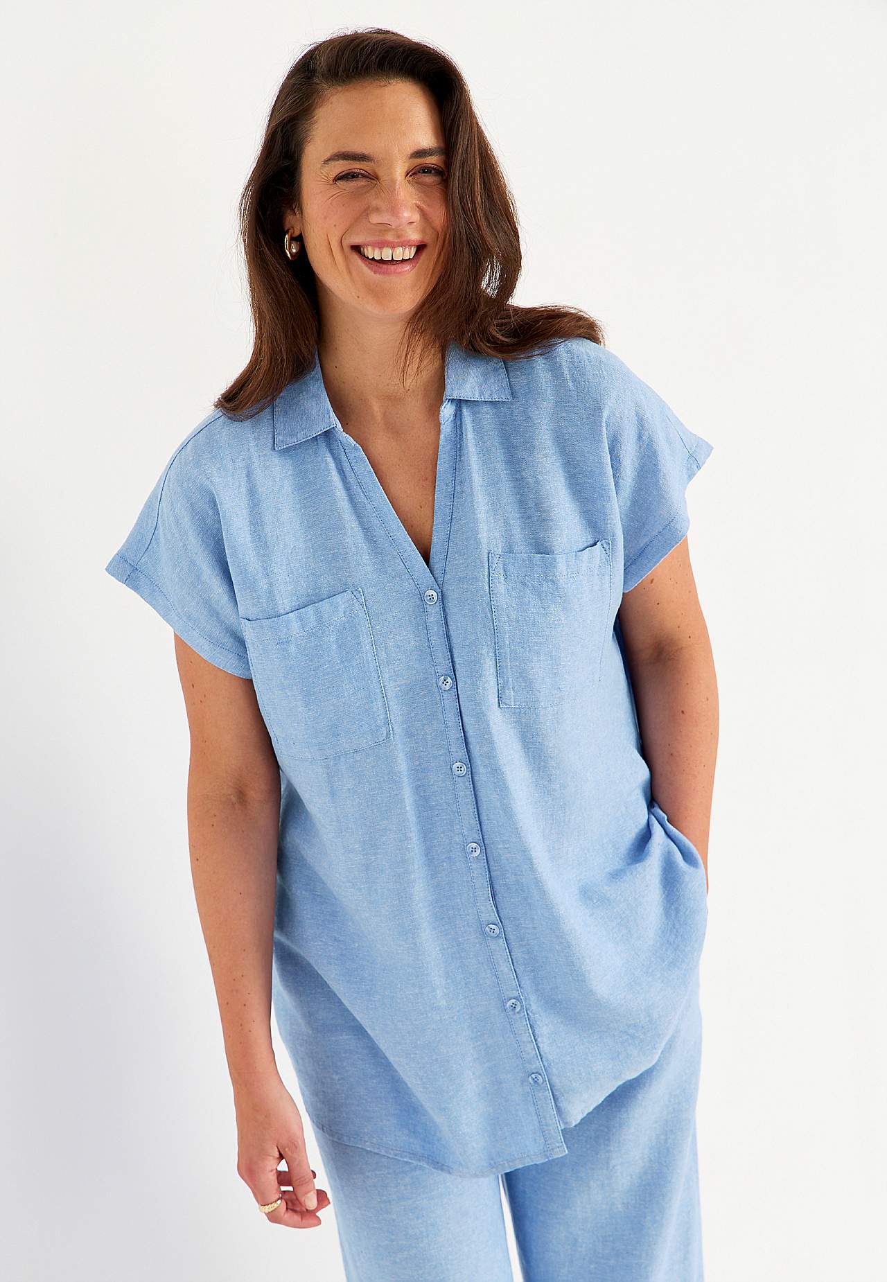 Tkana długa koszula z przewiewnego mieszanki lnu i wiskozy. Miękki i nieco grubszy materiał z naturalną strukturą. Swobodny fason. Kieszenie na piersi. Karczek z tyłu z dekoracyjną zakładką. Zaokrąglony brzeg. Długość od ramion w zależności od rozmiaru ok. 77-84 cm.