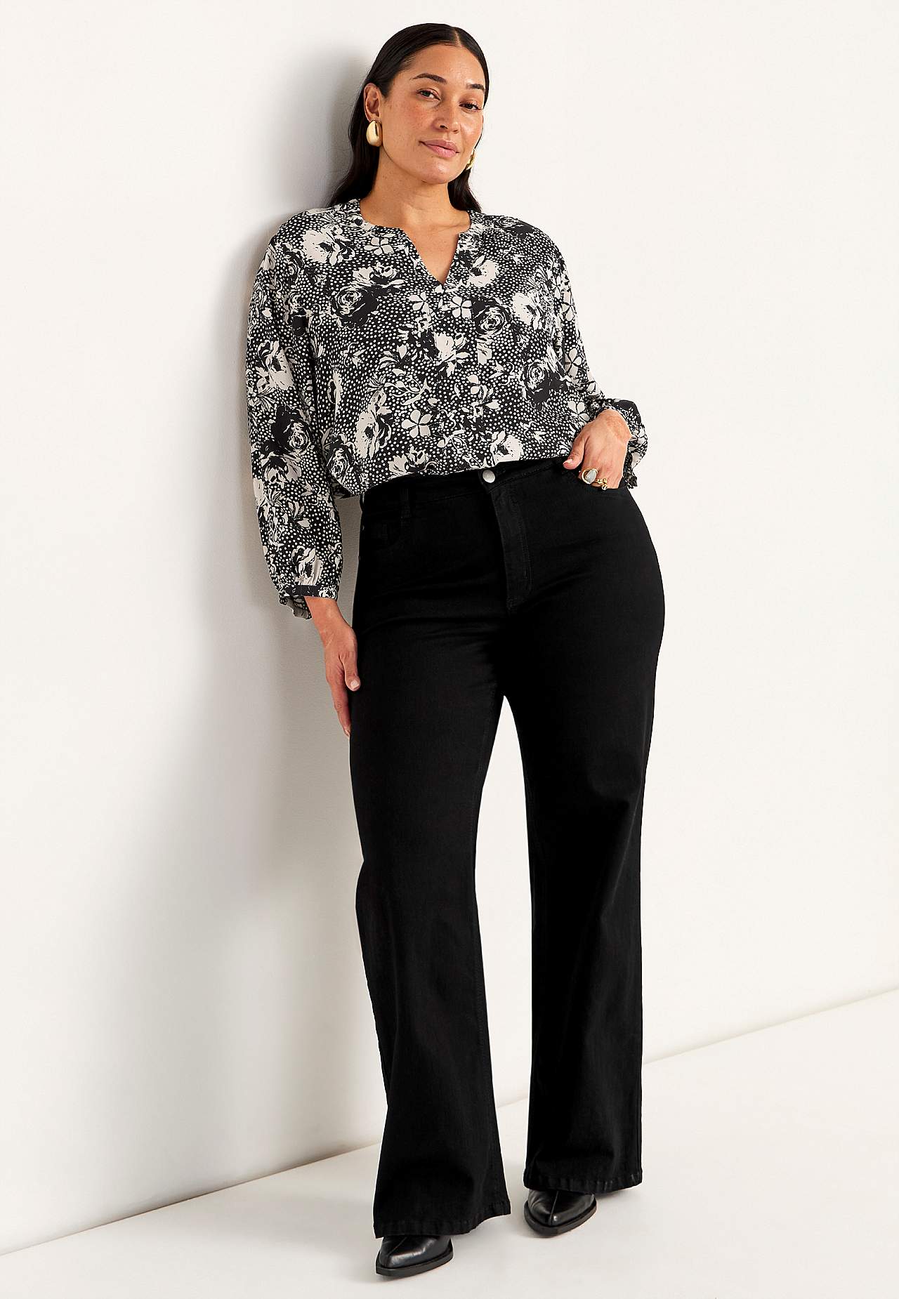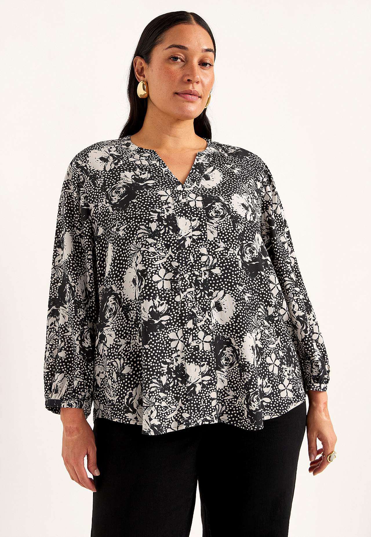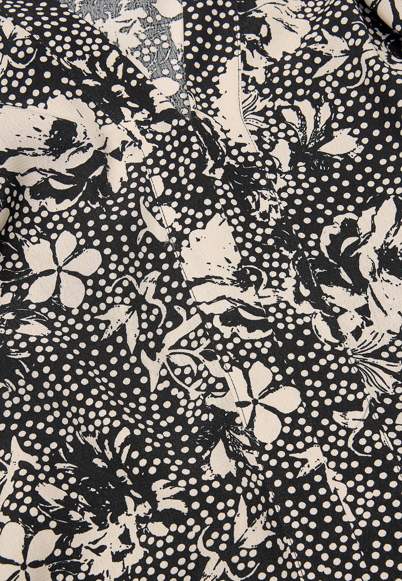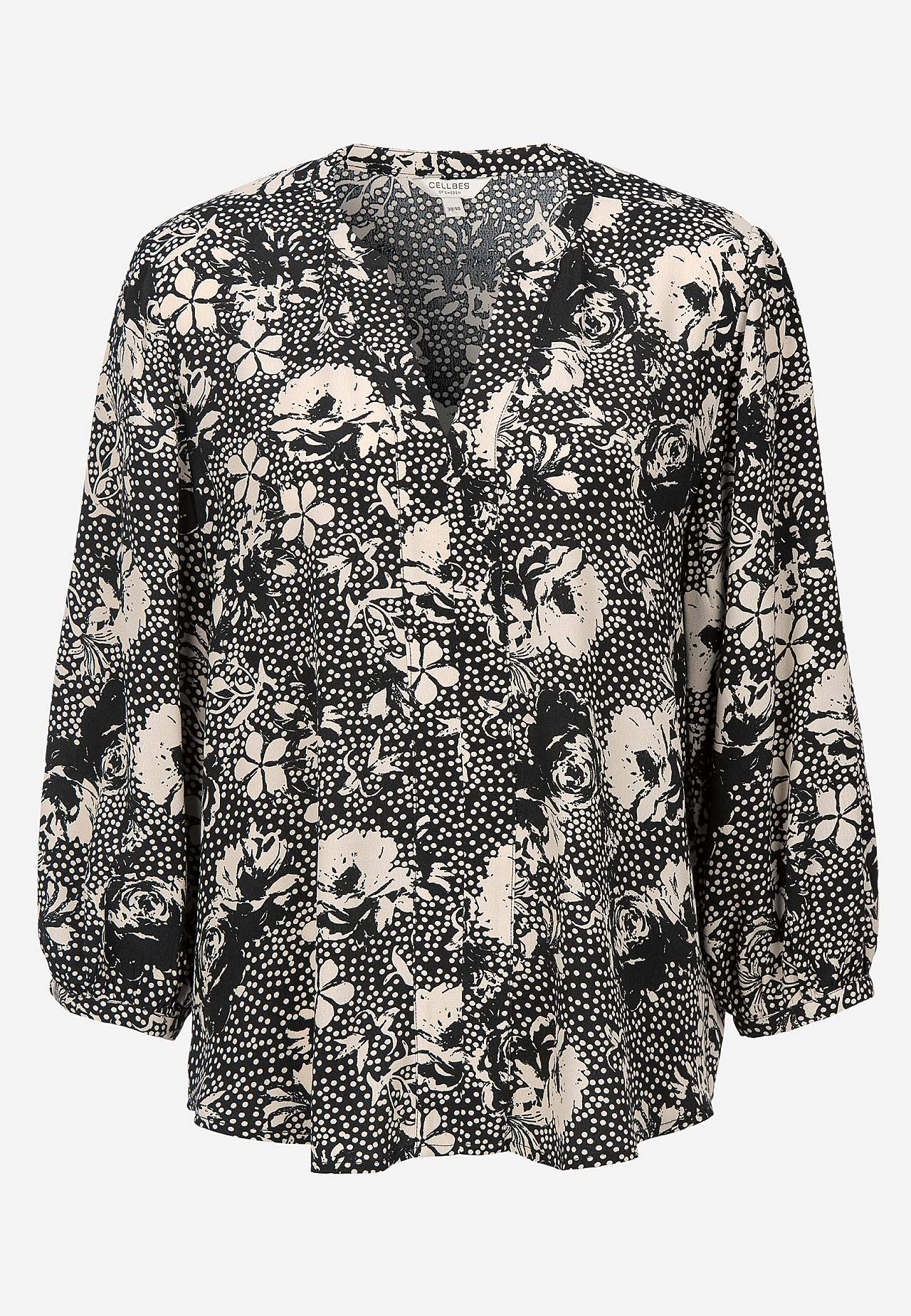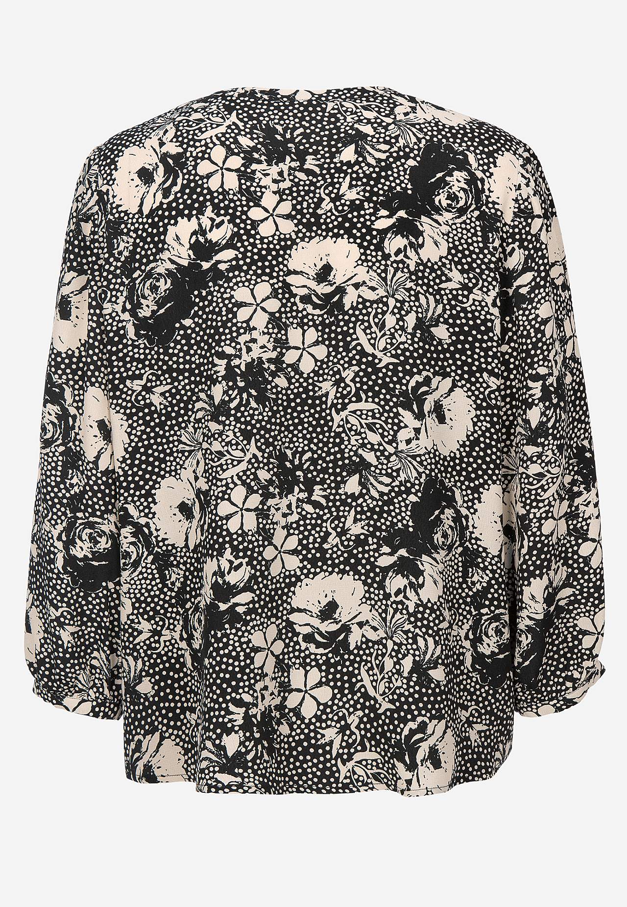 Tkana bluzka z gładkiej i miękkiej jakości. Rugularny fason. Fason lekko w kształcie litery a. Szyja z dekoltem w serek. Zaokrąglony brzeg. Długość od ramion w zależności od rozmiaru ok. 61-79 cm.