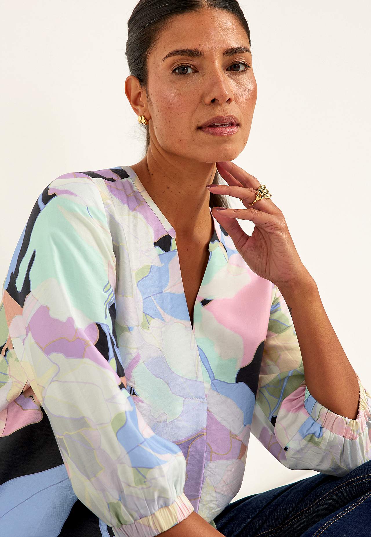 Bluzka z wiskozy z lekko błyszczącą tkaniną z teksturą. Miłe drapowanie i chłodzące uczucie. Rugularny fason ze szerszą spodnią stroną. Dekolt w serek ze zakładką z przodu. Zaokrąglony brzeg nieco dłuższy z tyłu. Długość od ramion w zależności od rozmiaru ok. 64-78 cm.