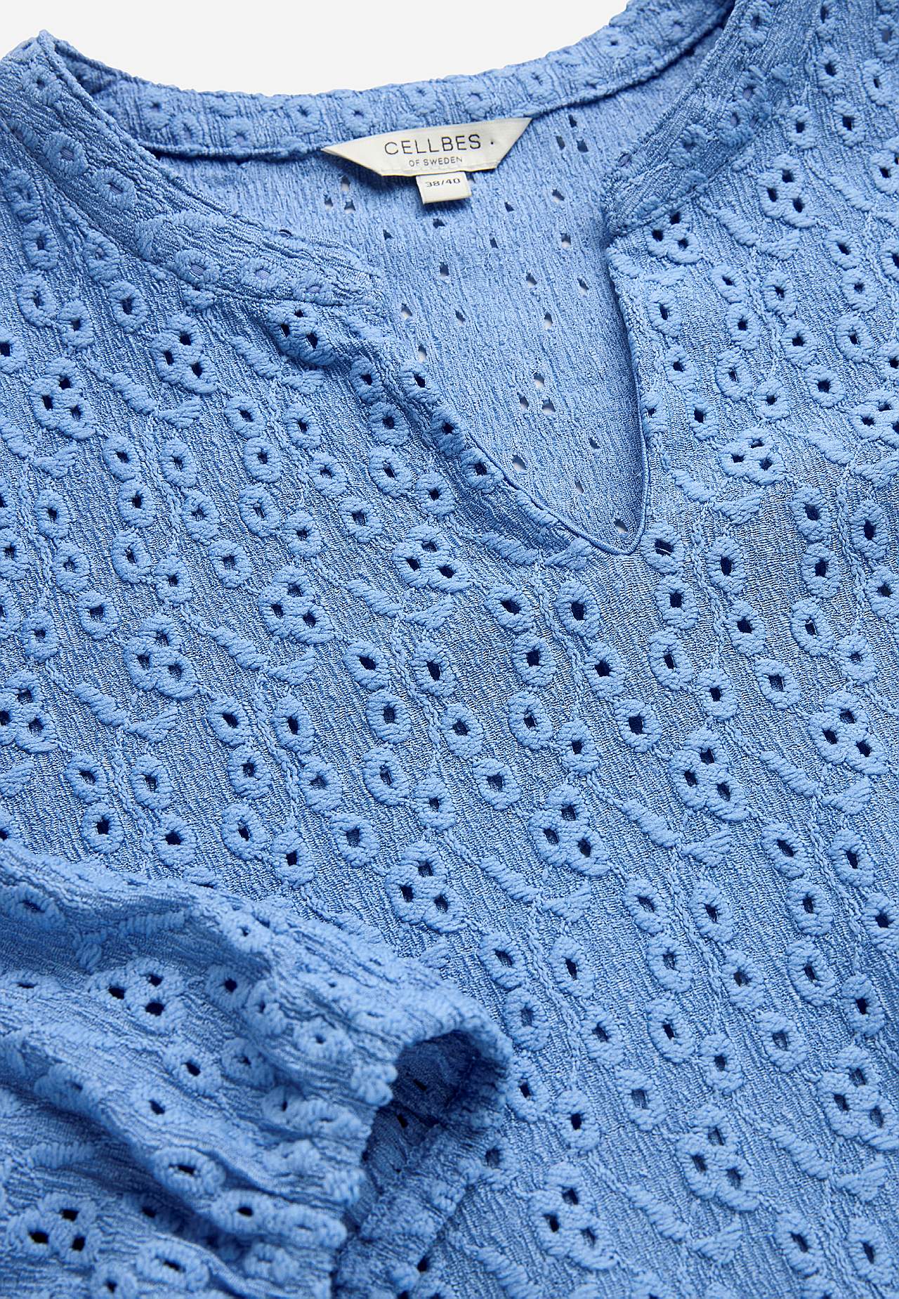 O strukturze wzrorzystej i elastyczny top z haftem angielskim. Rugularny i lekko wyprofilowany fason. Zaokrąglona szyja z wycięciem w kształcie litery v z przodu. Szerokie rękawy długość 3/4 z gumą na mankietach. Lekko zaokrąglony brzeg. Długość z tyłu zależna od rozmiaru, ok. 61-75 cm.