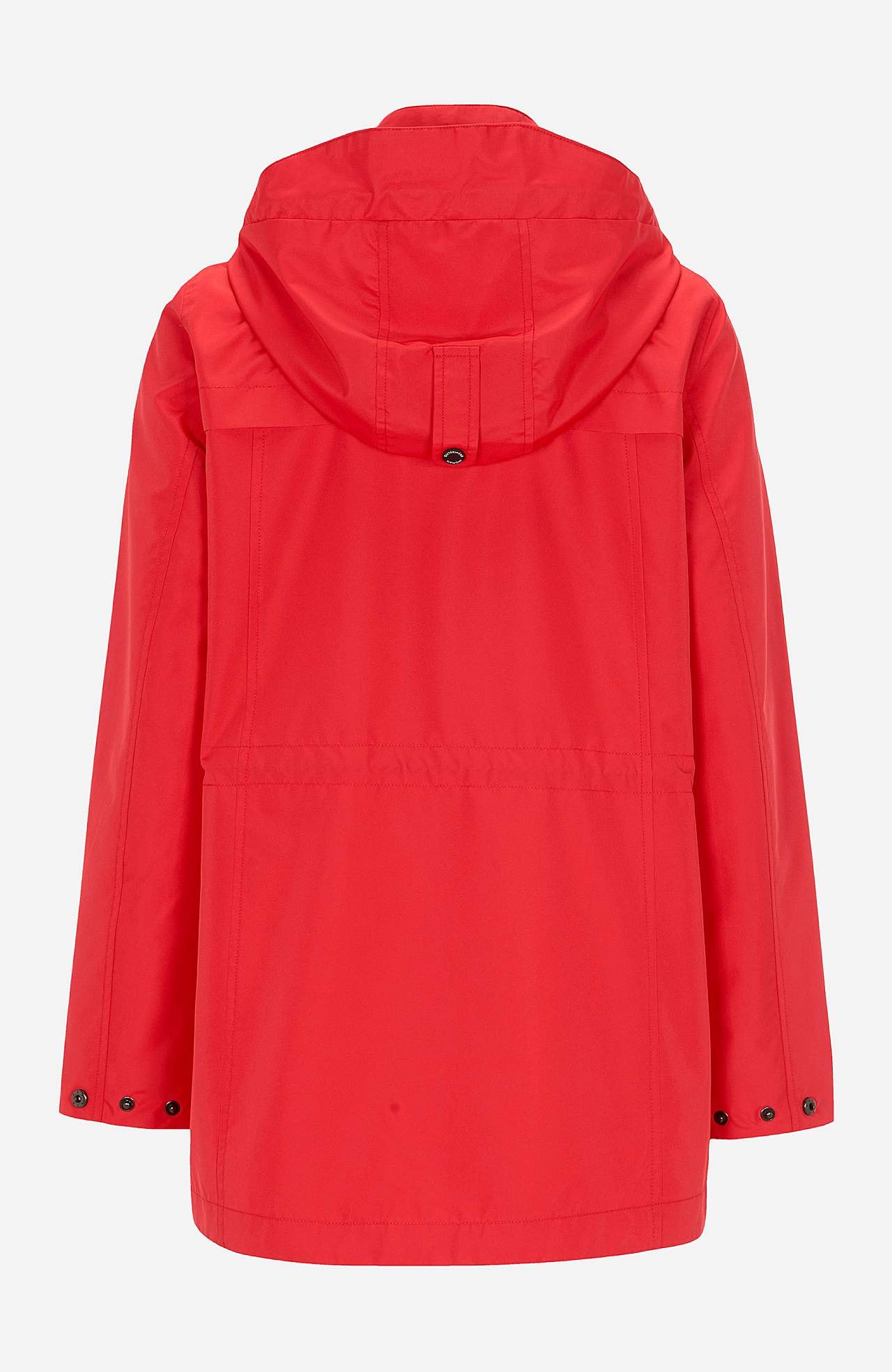 Wiatroszczelna kurtka z odczepialnym kapturem i regulowaną talią. Suwak dwukierunkowy z rozcięciem zapinanym na guziki i zatrzaskami. Ślepe kieszonki z przodu ze zapięciem. Proste rękawy. Podszewka całkiem podszyty. Kieszeń wewnętrzna ze zapięciem na rzepy. Długość z tyłu zależna od rozmiaru, ok. 76-88 cm.