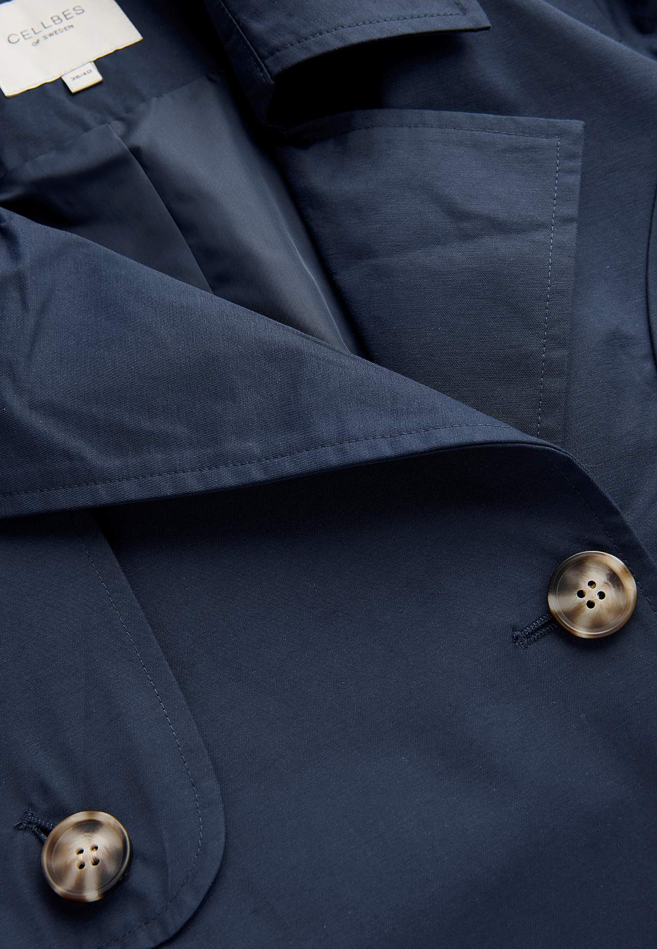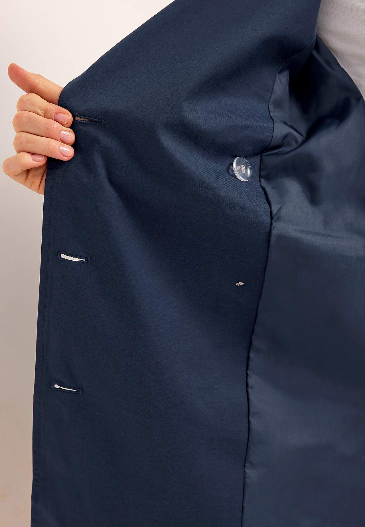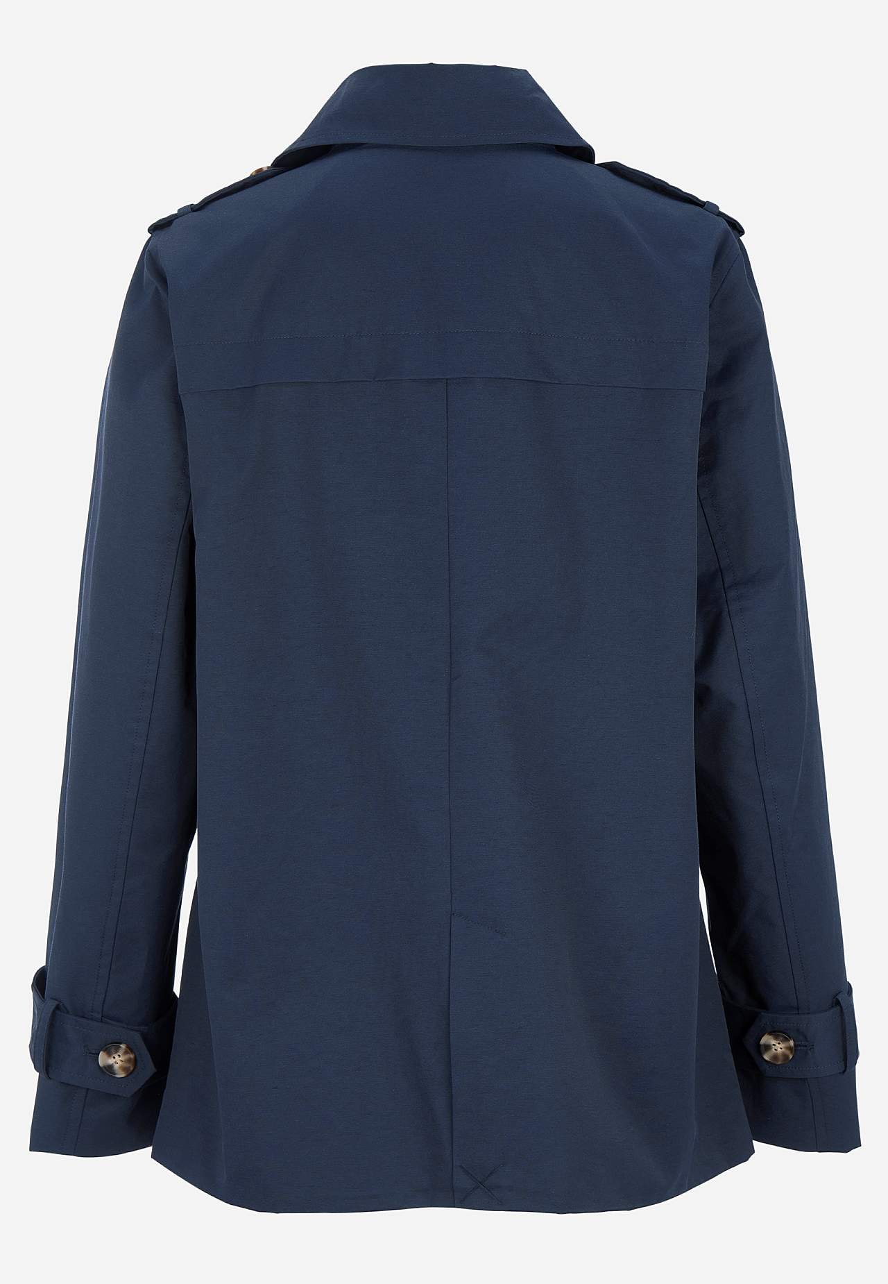 Trencz dwurzędowy i całkiem podszyty z kołnierzem. Stylowy płaszcz wiosenny, idealny również na jesień. Długość z tyłu zależna od rozmiaru, ok. 73-85 cm.