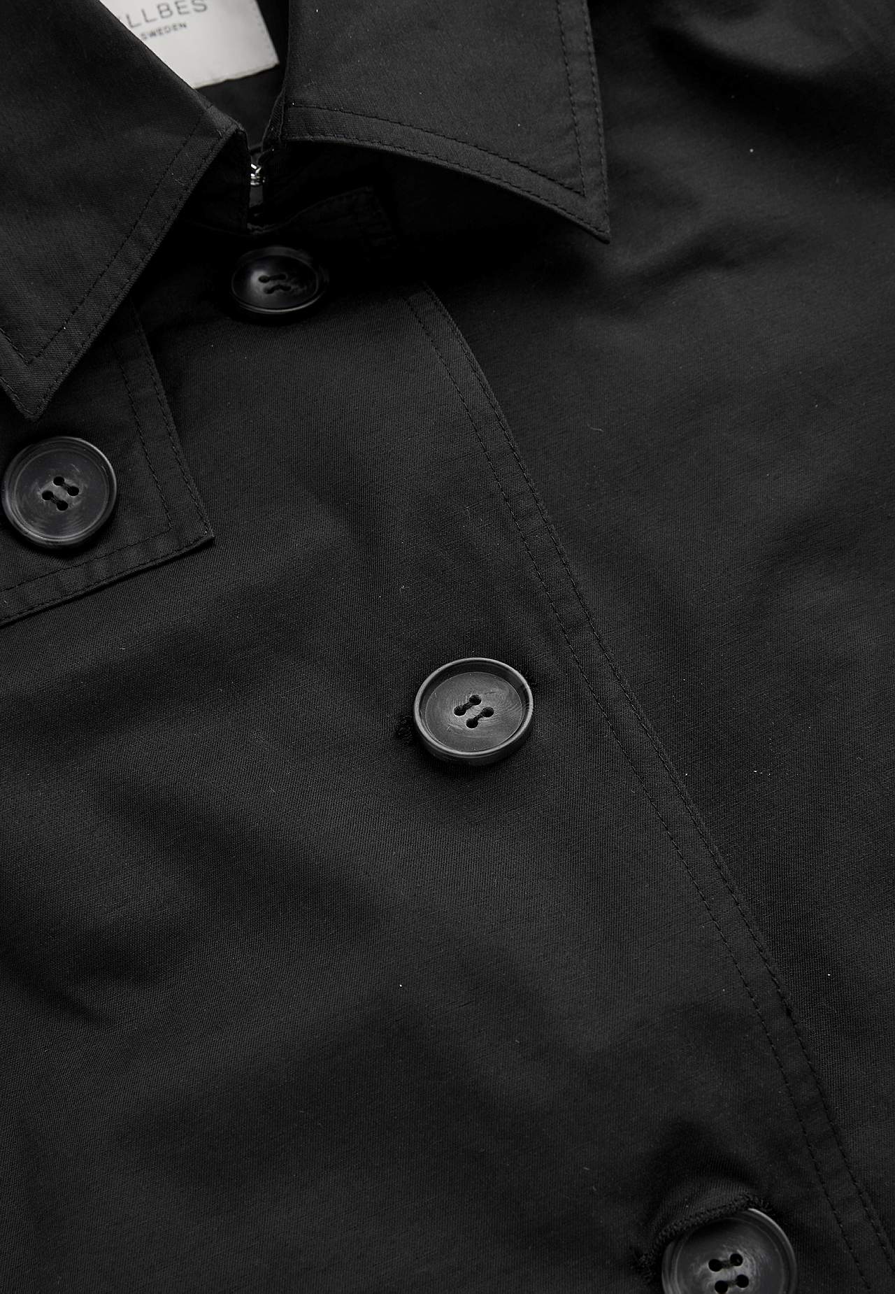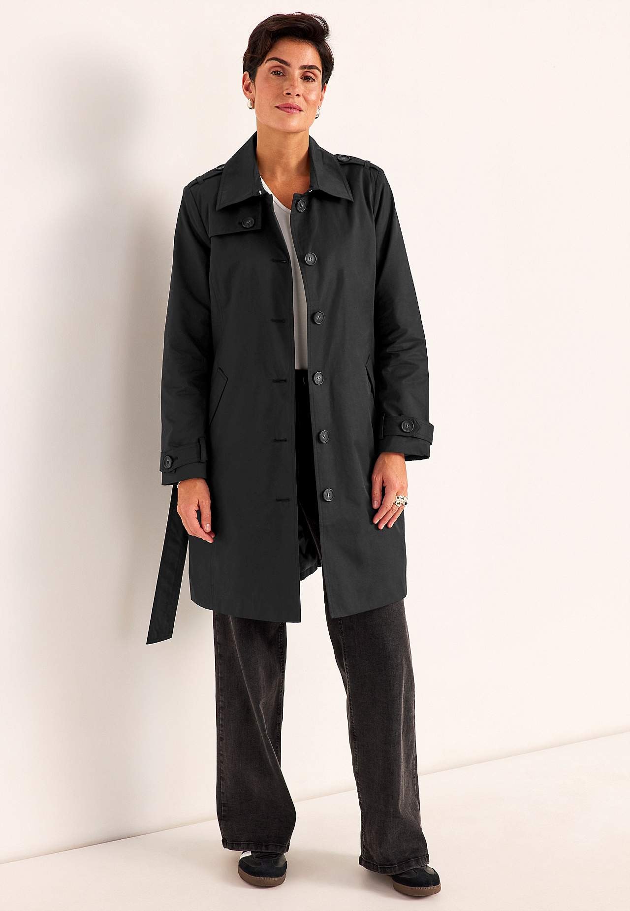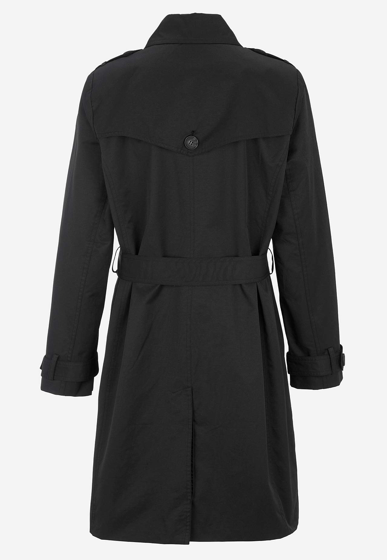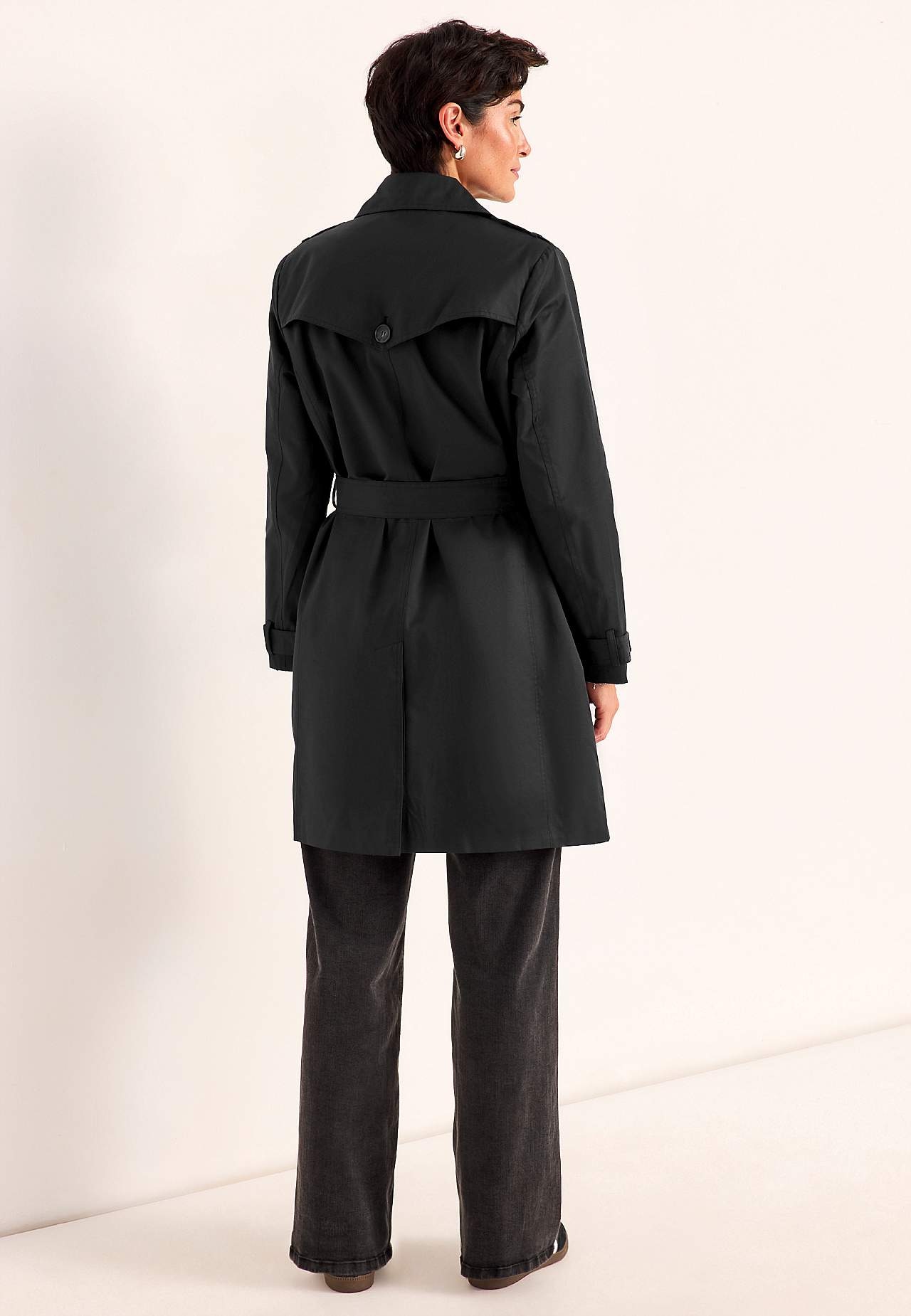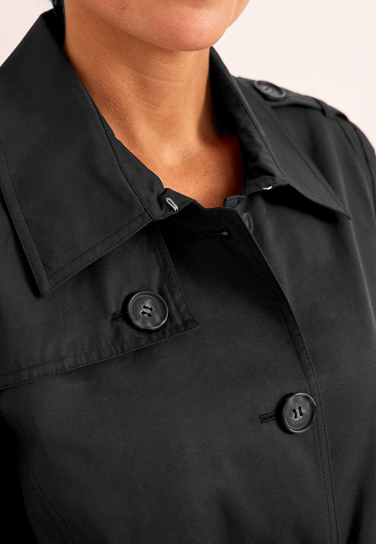 Trencz wodoodporny i całkiem podszyty. Małe ochraniacze na ramiona wewnątrz. Ślepe kieszonki na szwach bocznych. Kieszeń wewnętrzna. Prosty brzeg z rozcięciem z tyłu i dwoma guzikami. Długość od ramion w zależności od rozmiaru ok. 97-111 cm.