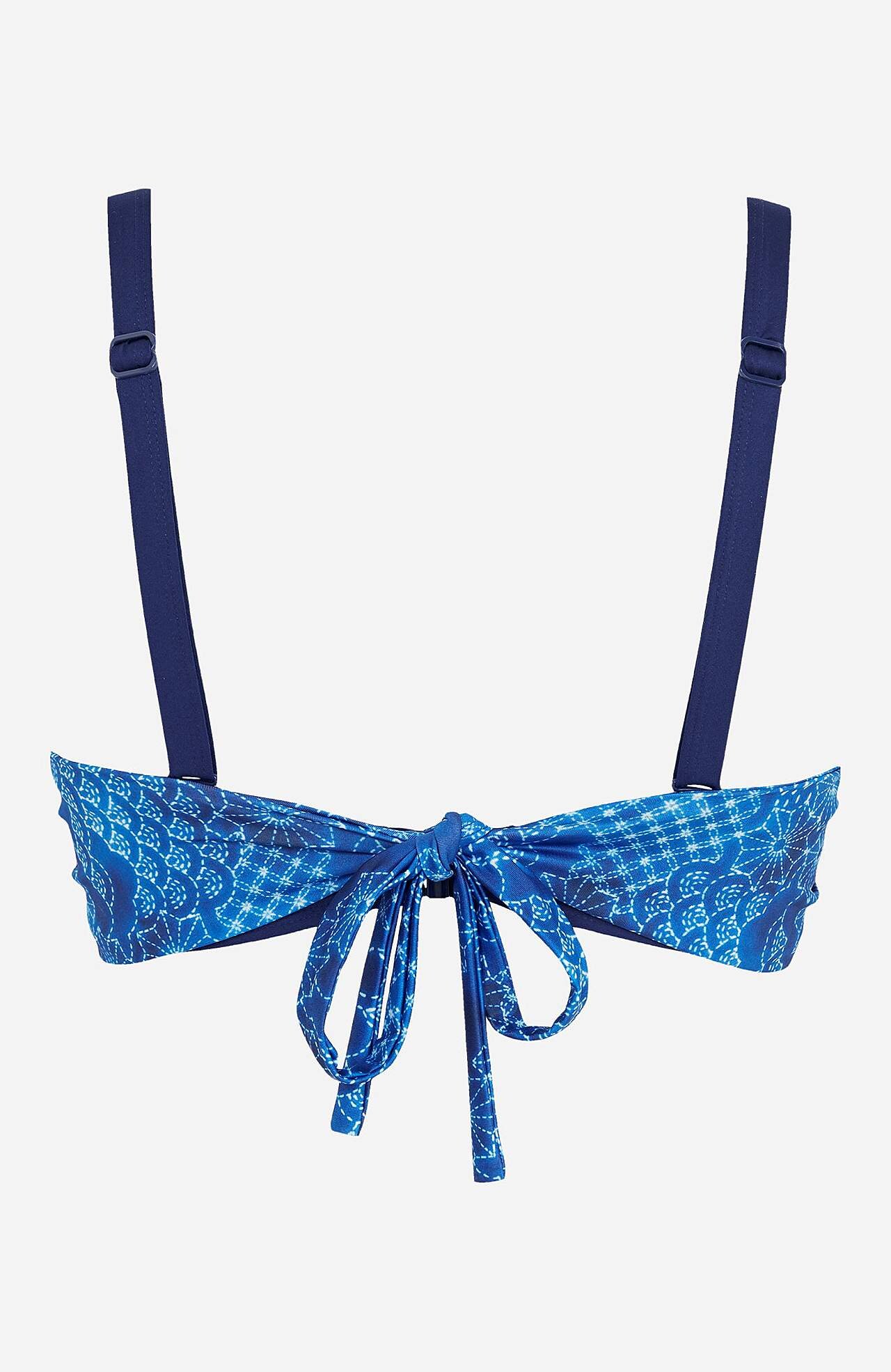 Fiszbiny i wyściełane miseczki. Wiele funkcji. Odpinane, regulowane ramiączka, które można zapiąć na krzyż na plecach. Szeroka taśma do wiązania na szyi lub na plecach. Z tyłu plastikowe zapięcie. Produkt uszyty z przetworzonego poliestru.