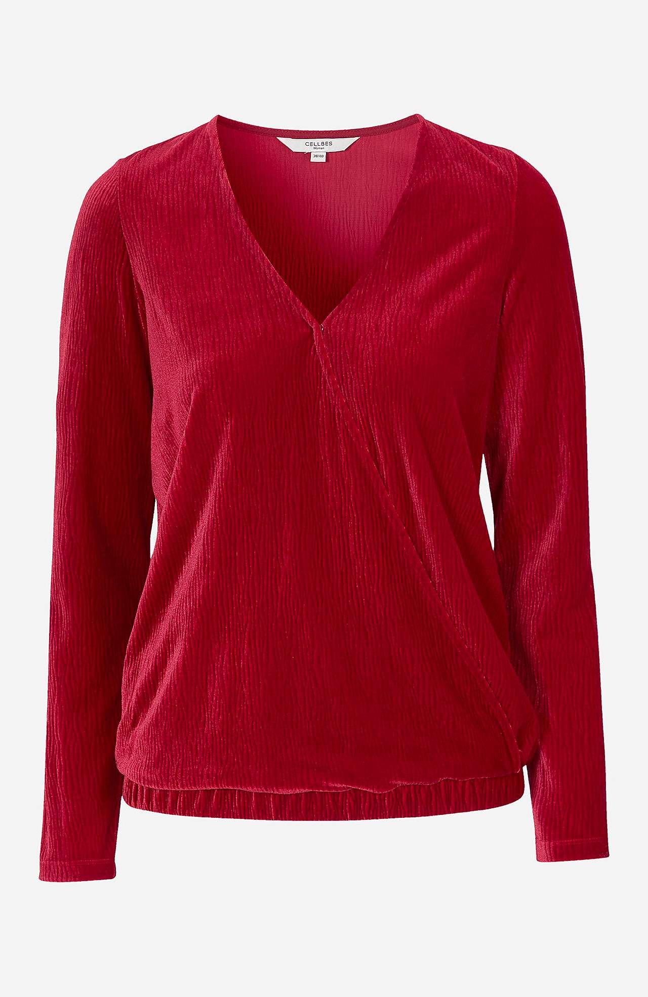 Top zawiązywany z plisowanego aksamitnego trykotu. Szyja w kształcie V ze zakrytym guzikiem na piersiach. Krój z mankietem na dolnej części i ładnym i długim rękawem. Długość od ramion w zależności od rozmiaru ok. 61-75 cm.