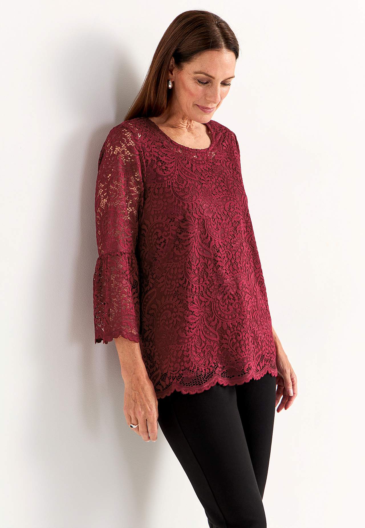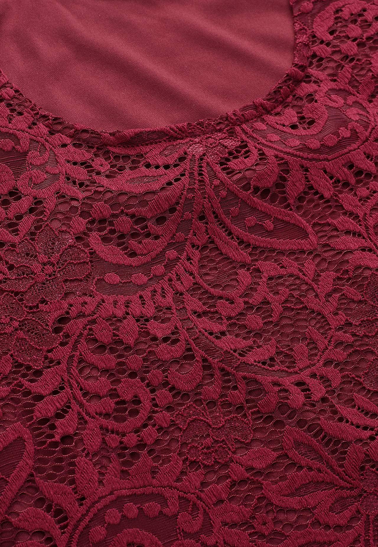 Podszyty top z elastyczną koronkową tkaniną. Lekki design w linie. Okrągły dekolt. Niepodszyty rękaw trąbkowy o długości 3/4 z falistymi krawędziami. Falisty i lekko zaokrąglony brzeg. Długość od ramion w zależności od rozmiaru ok. 76-83 cm.