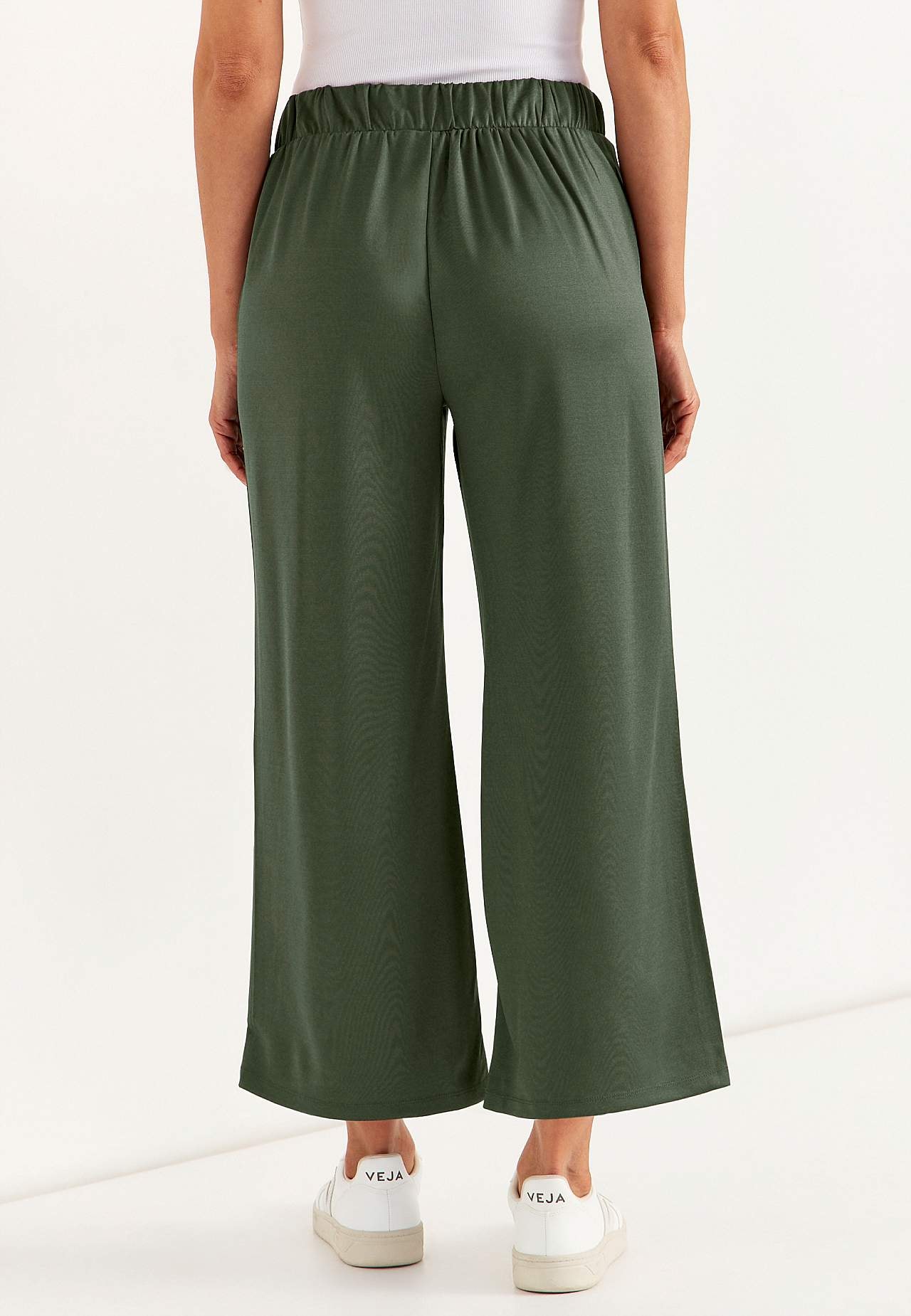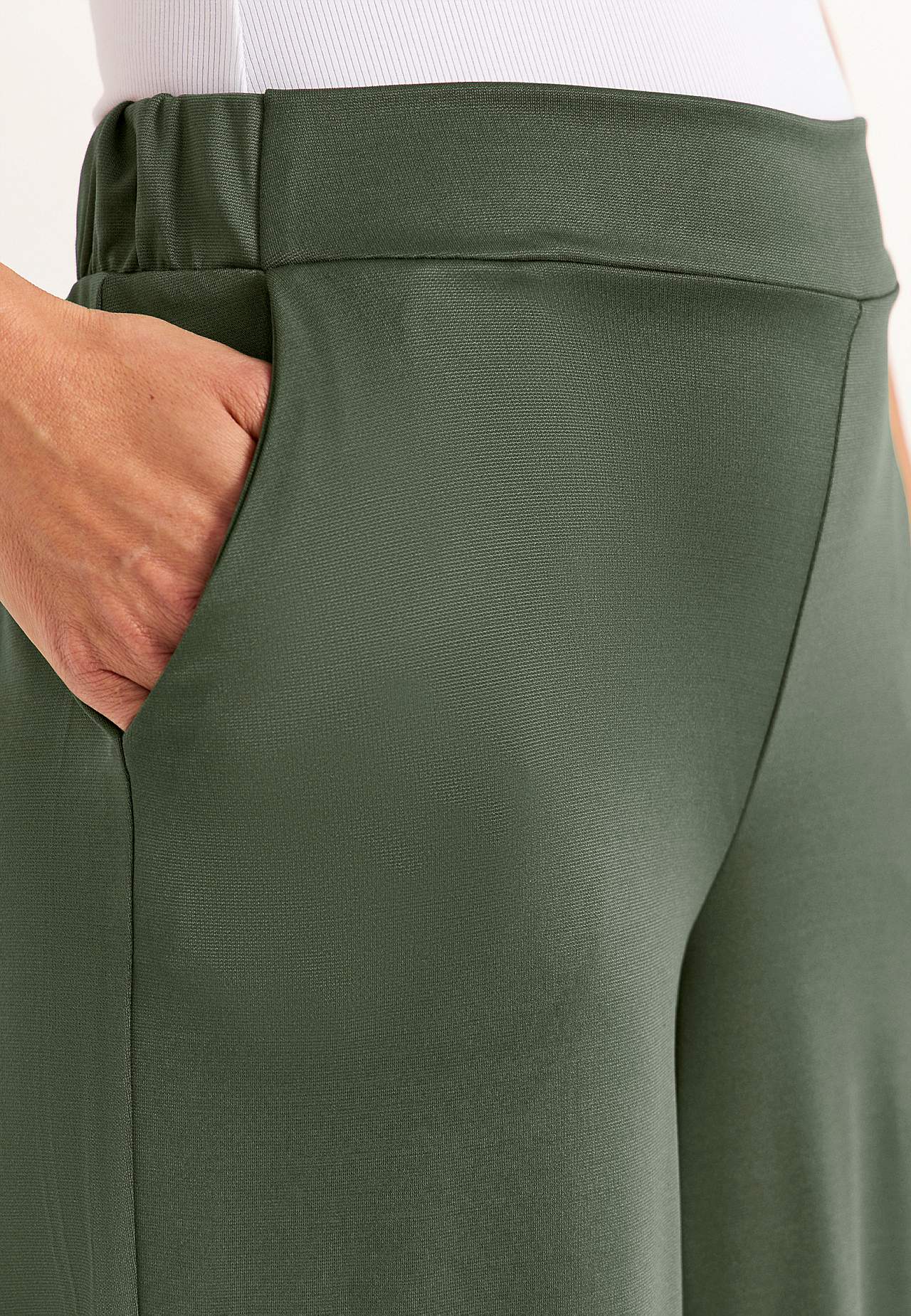 Spodnie do kostki ze szerokimi nogawkami. Gładki dżersej ze stretchem i miłym połyskiem. Szeroki pas z krytą gumką z tyłu. Boczne kieszenie. Długość wewnętrzna nogawki ok. 62 cm we wszystkich rozmiarach. Głębokość z przodu różni się w zależności od rozmiaru: około 26-37 cm.