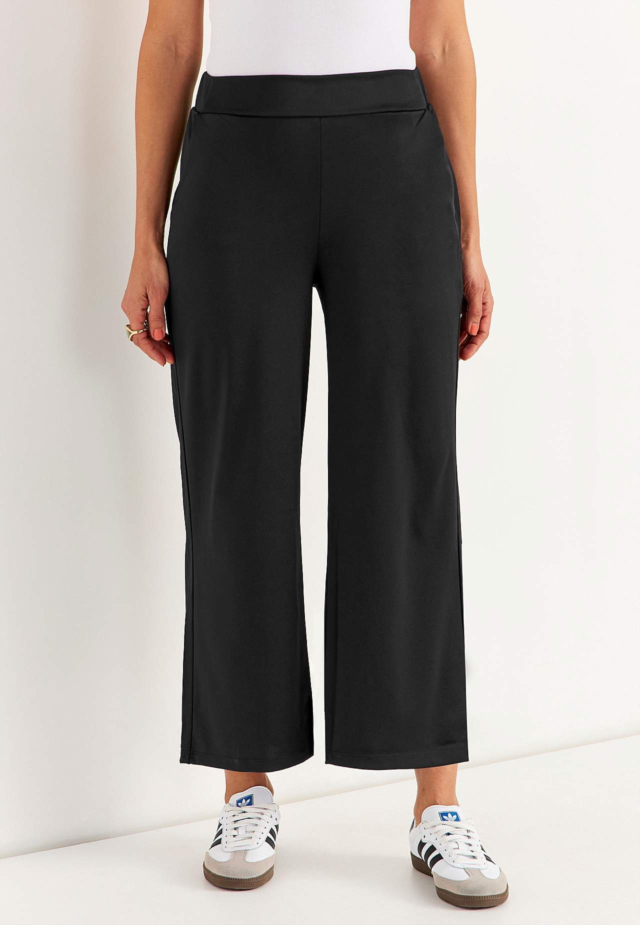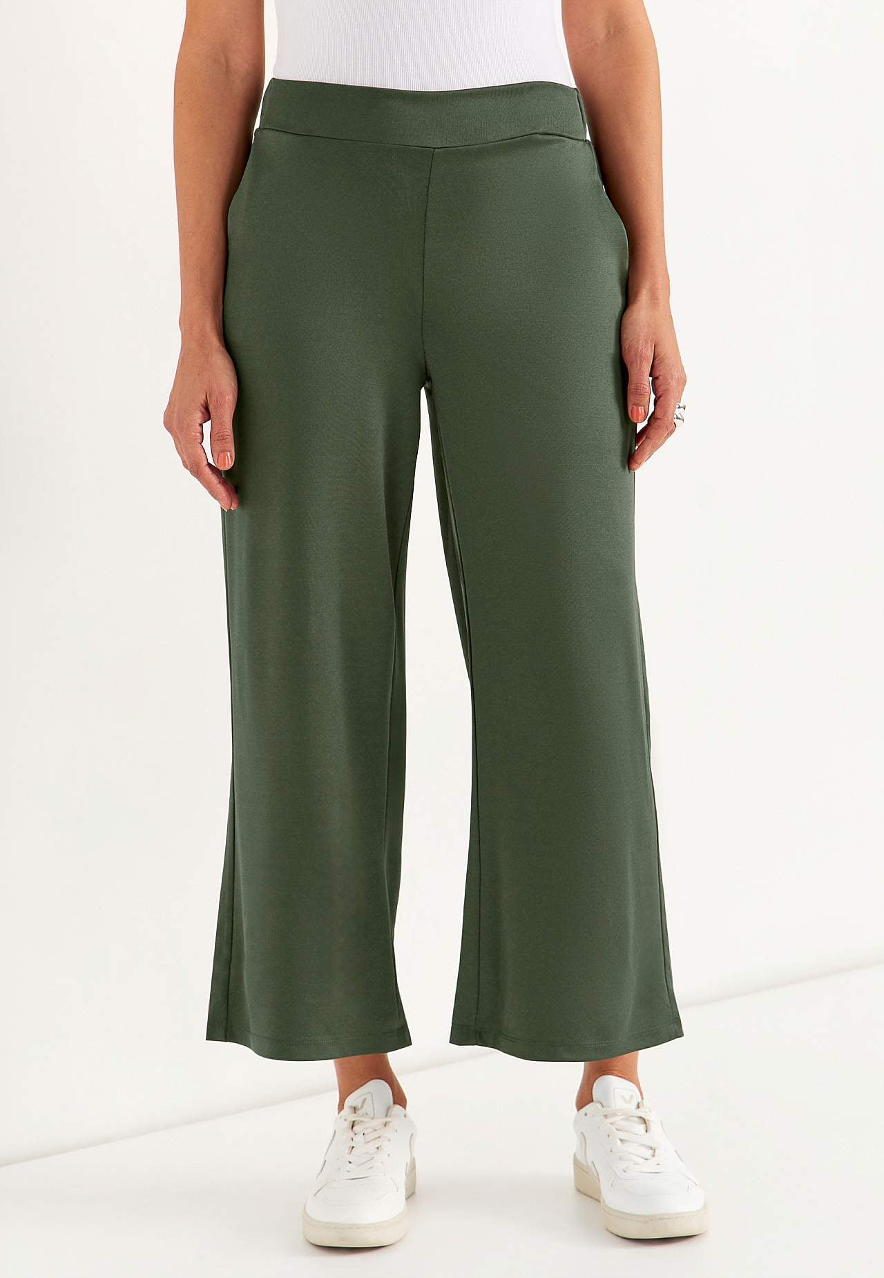 Spodnie do kostki ze szerokimi nogawkami. Gładki dżersej ze stretchem i miłym połyskiem. Szeroki pas z krytą gumką z tyłu. Boczne kieszenie. Długość wewnętrzna nogawki ok. 62 cm we wszystkich rozmiarach. Głębokość z przodu różni się w zależności od rozmiaru: około 26-37 cm.