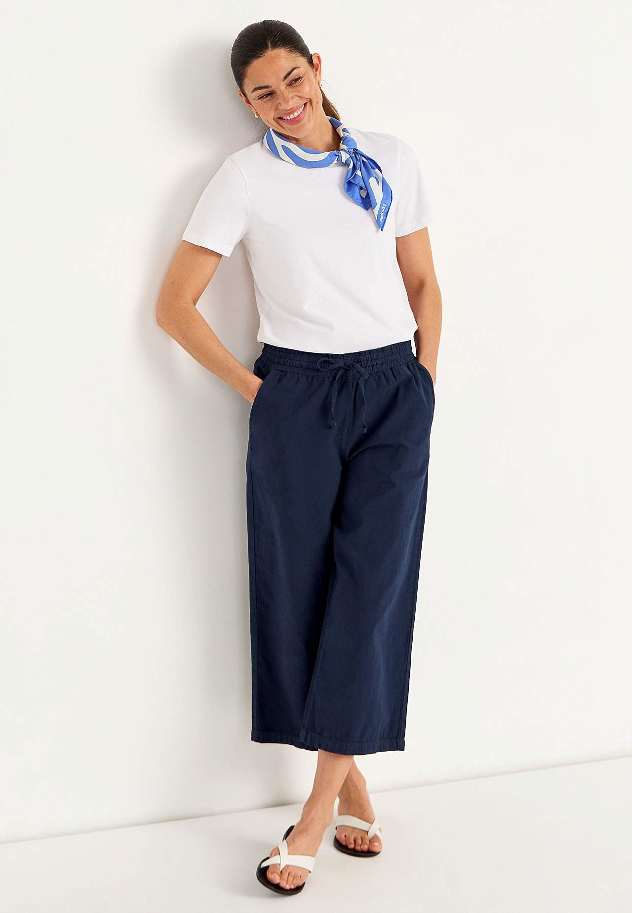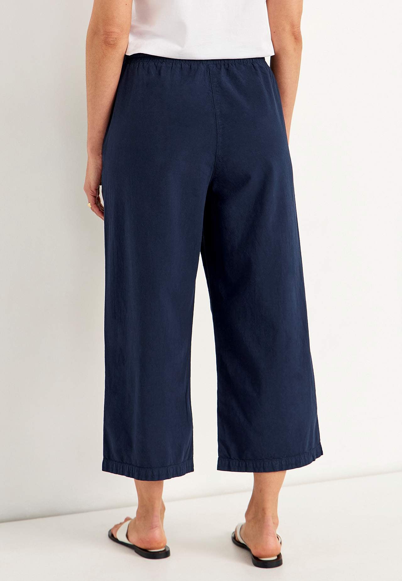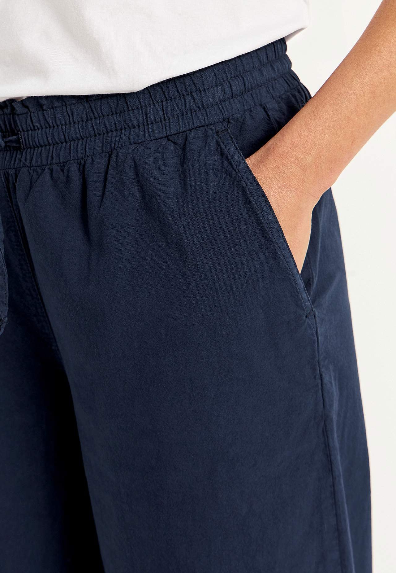 Luźne spódnicospodnie. Tkany materiał z giętkiej bawełny z efektem sprania z naturalnym dotykiem. Luźny fason. Wygodna i elastyczna talia z ściąganym sznurkiem. Ukośne przednie kieszenie. Szerokie i proste nogawki. Długość wewnętrzna nogawki ok. 57 cm we wszystkich rozmiarach. Głębokość z przodu różni się w zależności od ro... Czytaj więcej