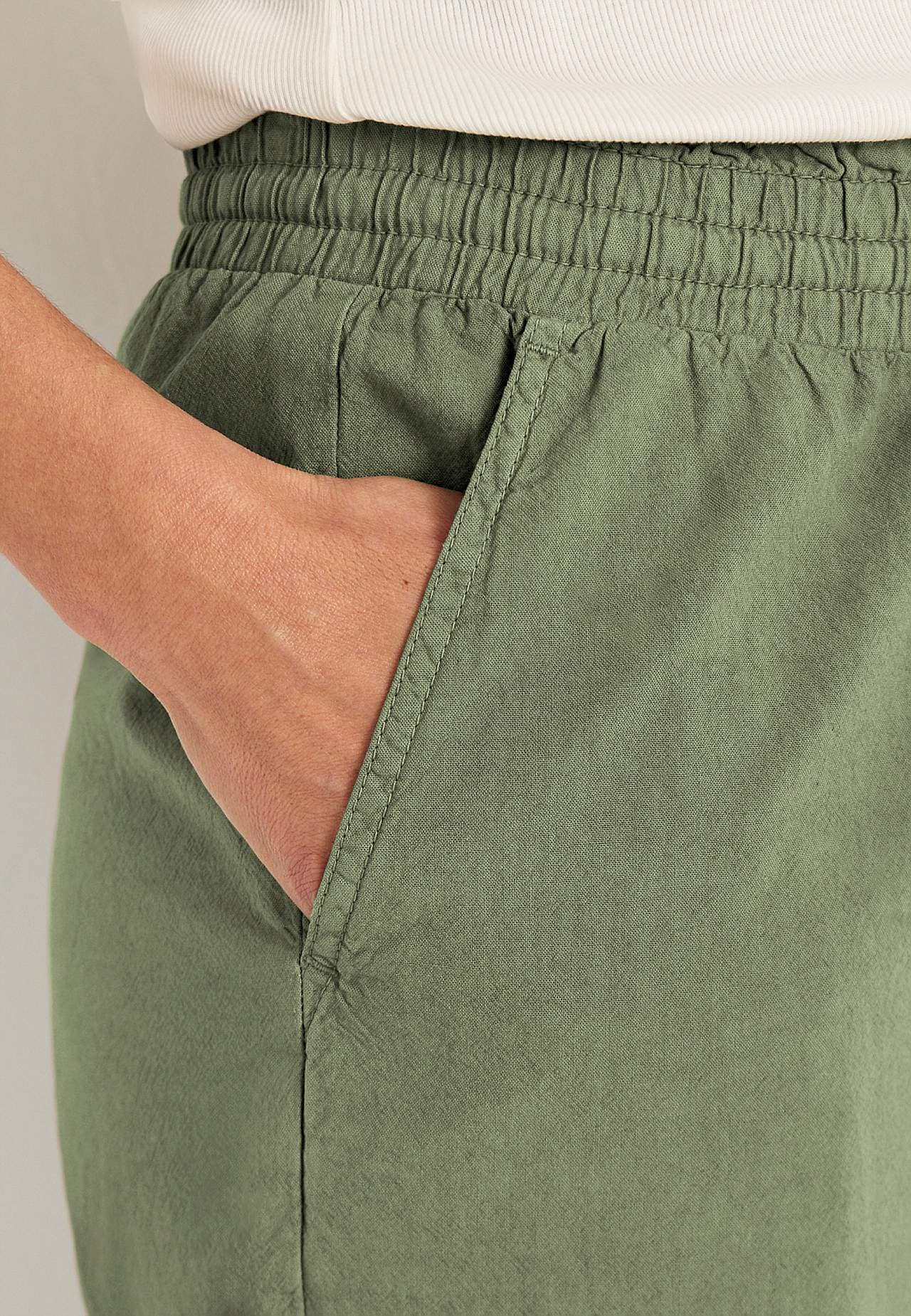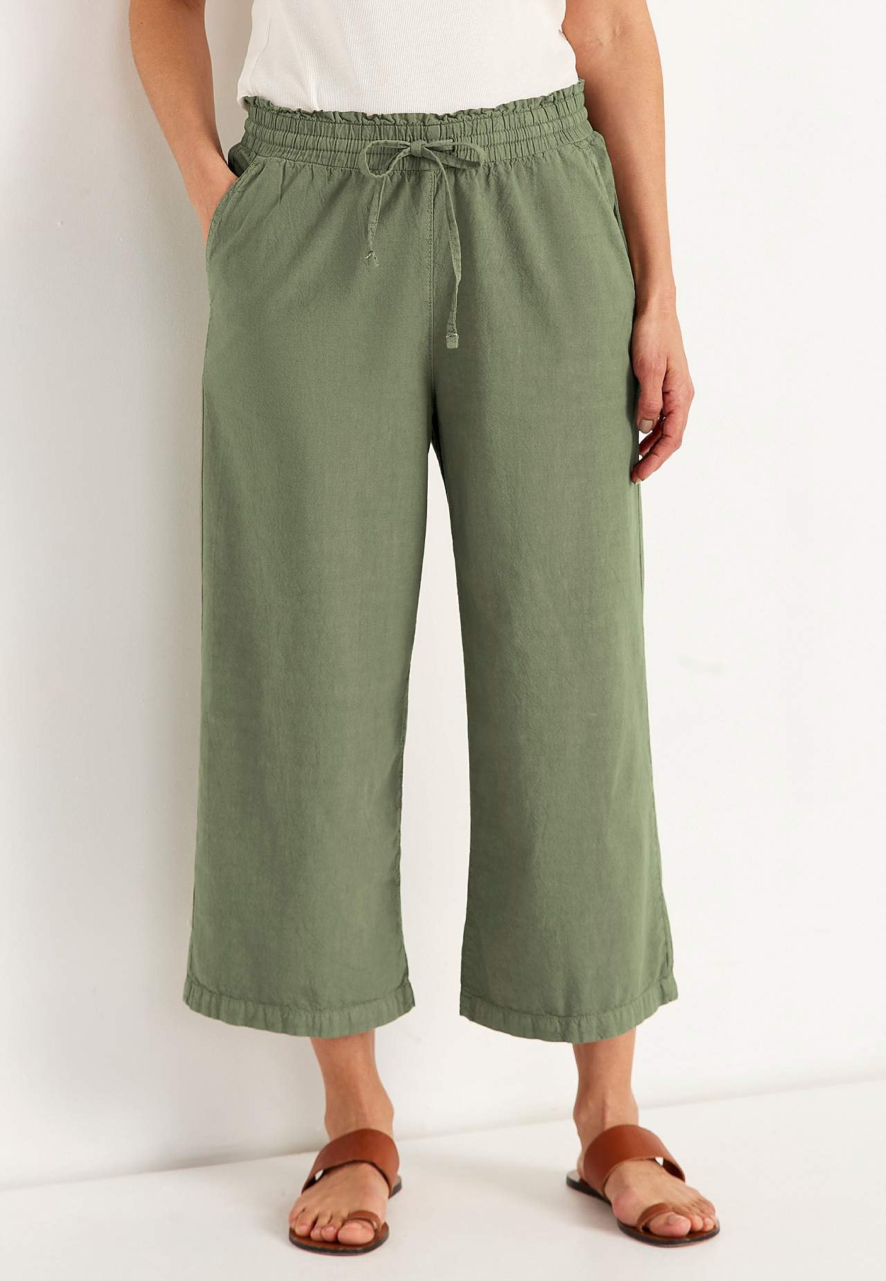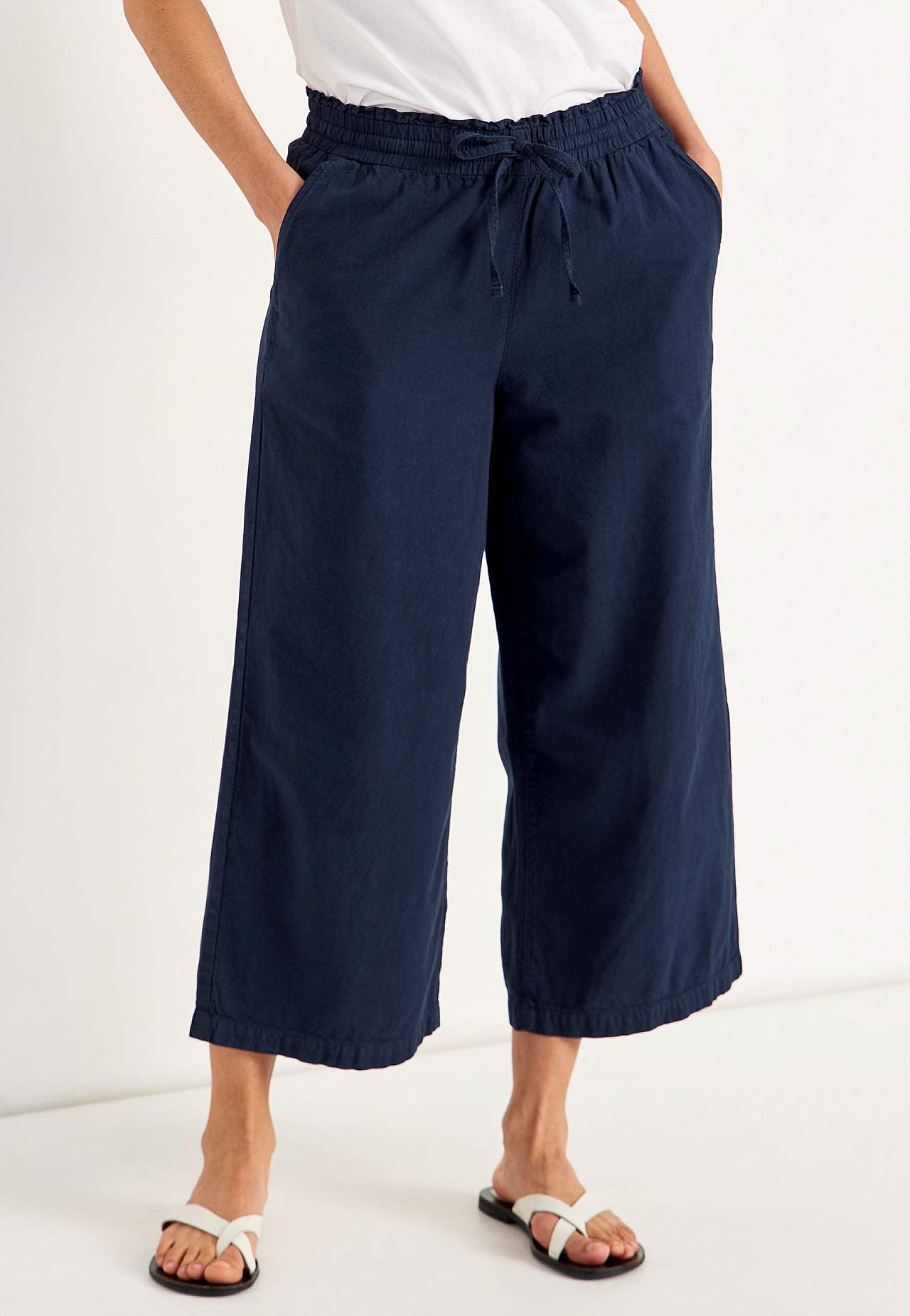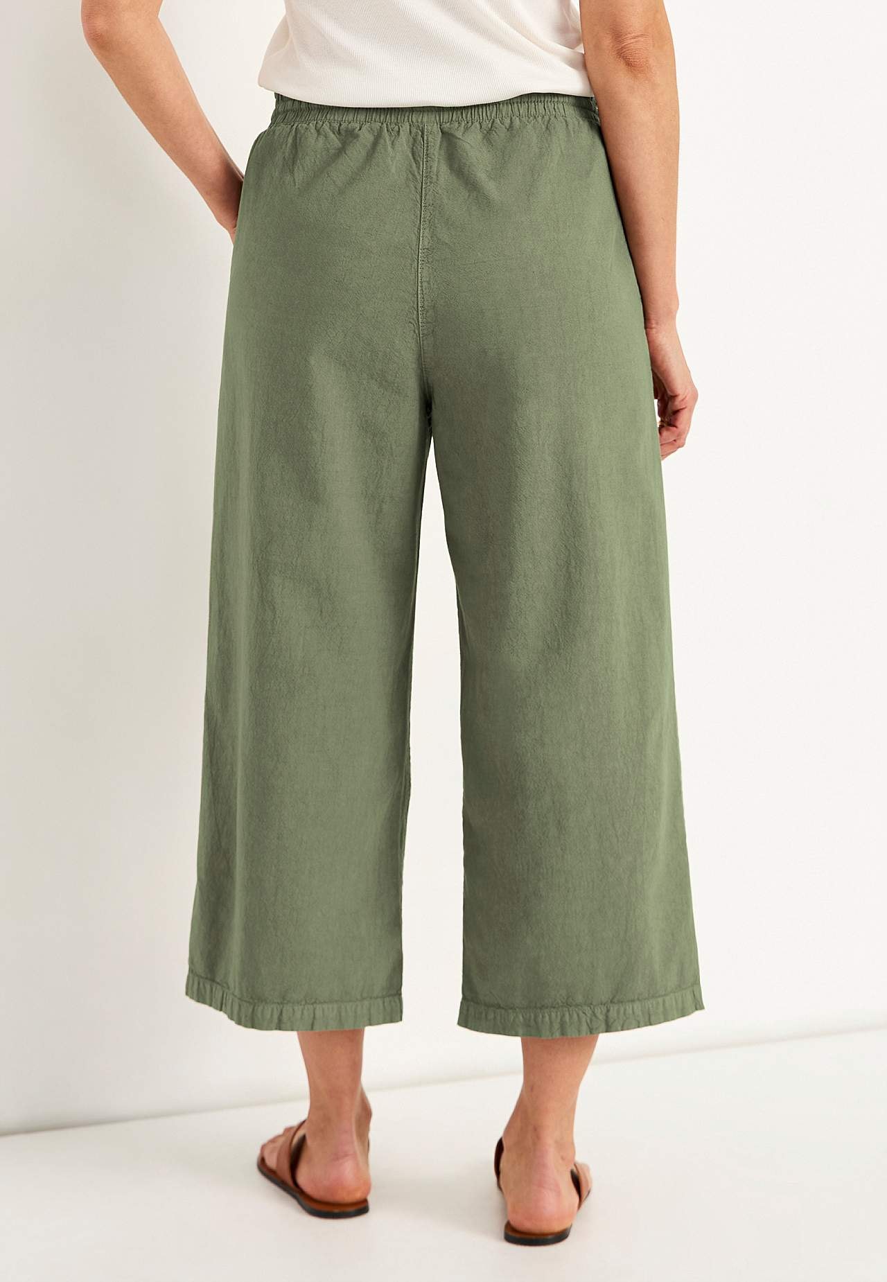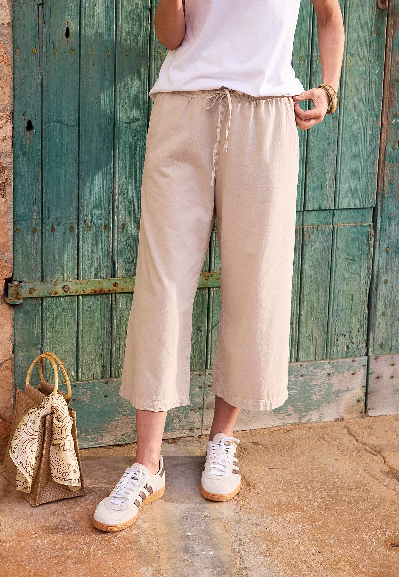 Luźne spódnicospodnie. Tkany materiał z giętkiej bawełny z efektem sprania z naturalnym dotykiem. Luźny fason. Wygodna i elastyczna talia z ściąganym sznurkiem. Ukośne przednie kieszenie. Szerokie i proste nogawki. Długość wewnętrzna nogawki ok. 57 cm we wszystkich rozmiarach. Głębokość z przodu różni się w zależności od ro... Czytaj więcej