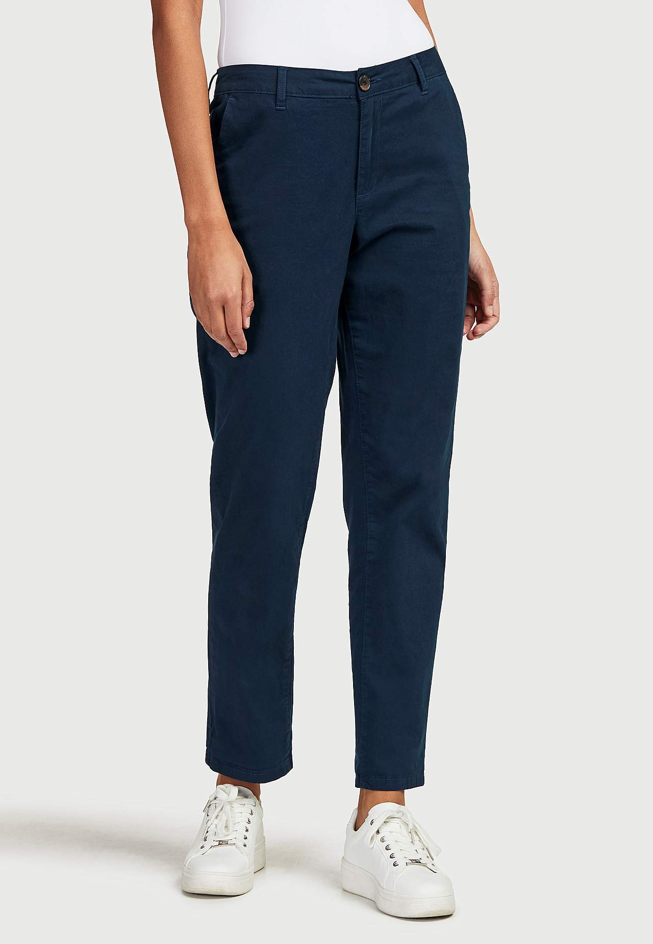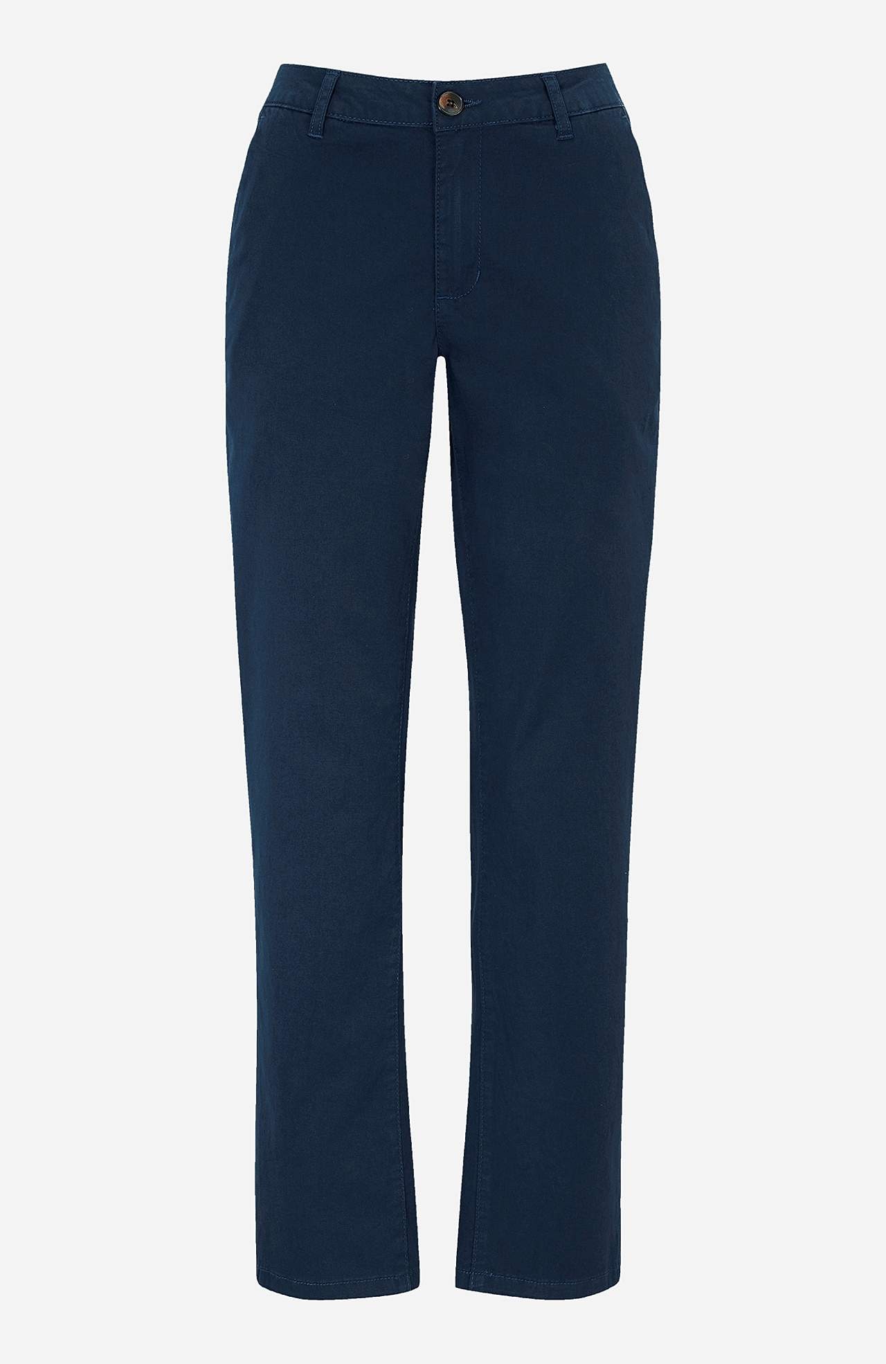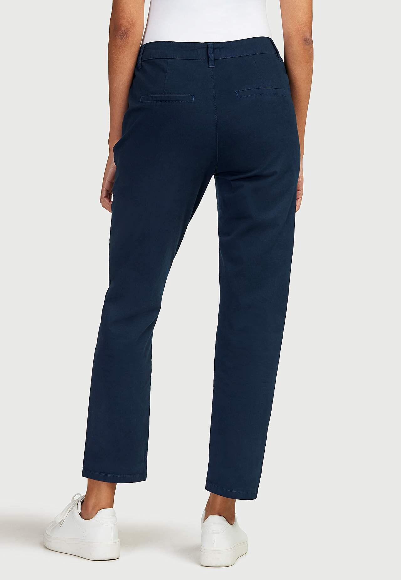 Wygodne chinosy z nogawkami do kostek. Regularna talia z prostym designem. Kieszenie po boku i ozdobne kieszenie z tyłu. Długość wewnętrzna nogawki w zależności od rozmiaru ok. 73-76 cm.