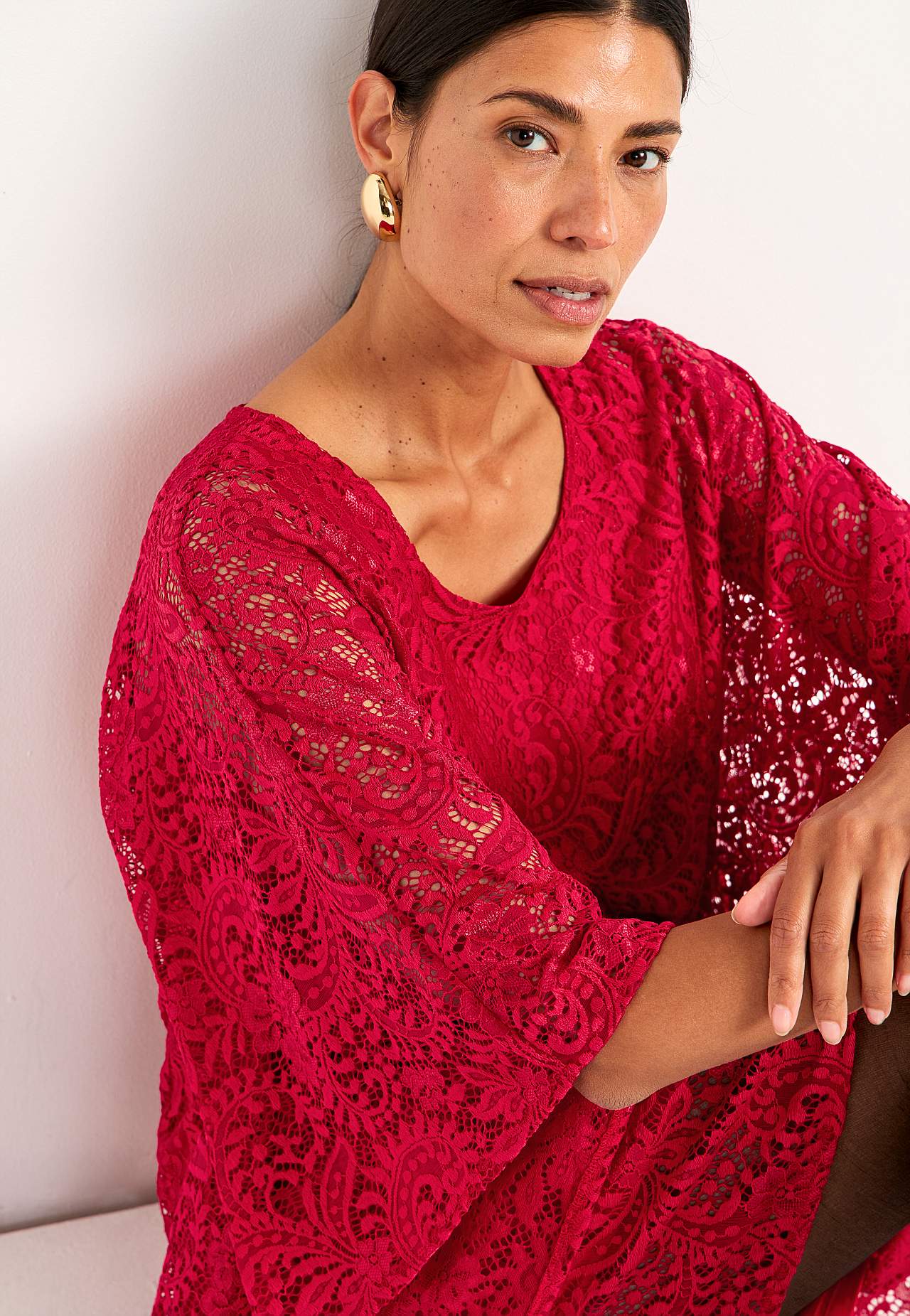 Przewiewny model kaftanowy ze stretchem. Elastyczny podszewka z dżerseju z oncisły fasonem. Fason ze zaokrągloną szyją. Szerokie, półdługie i niepodszyte rękawy. Długość z tyłu zależna od rozmiaru, ok. 94-106 cm.