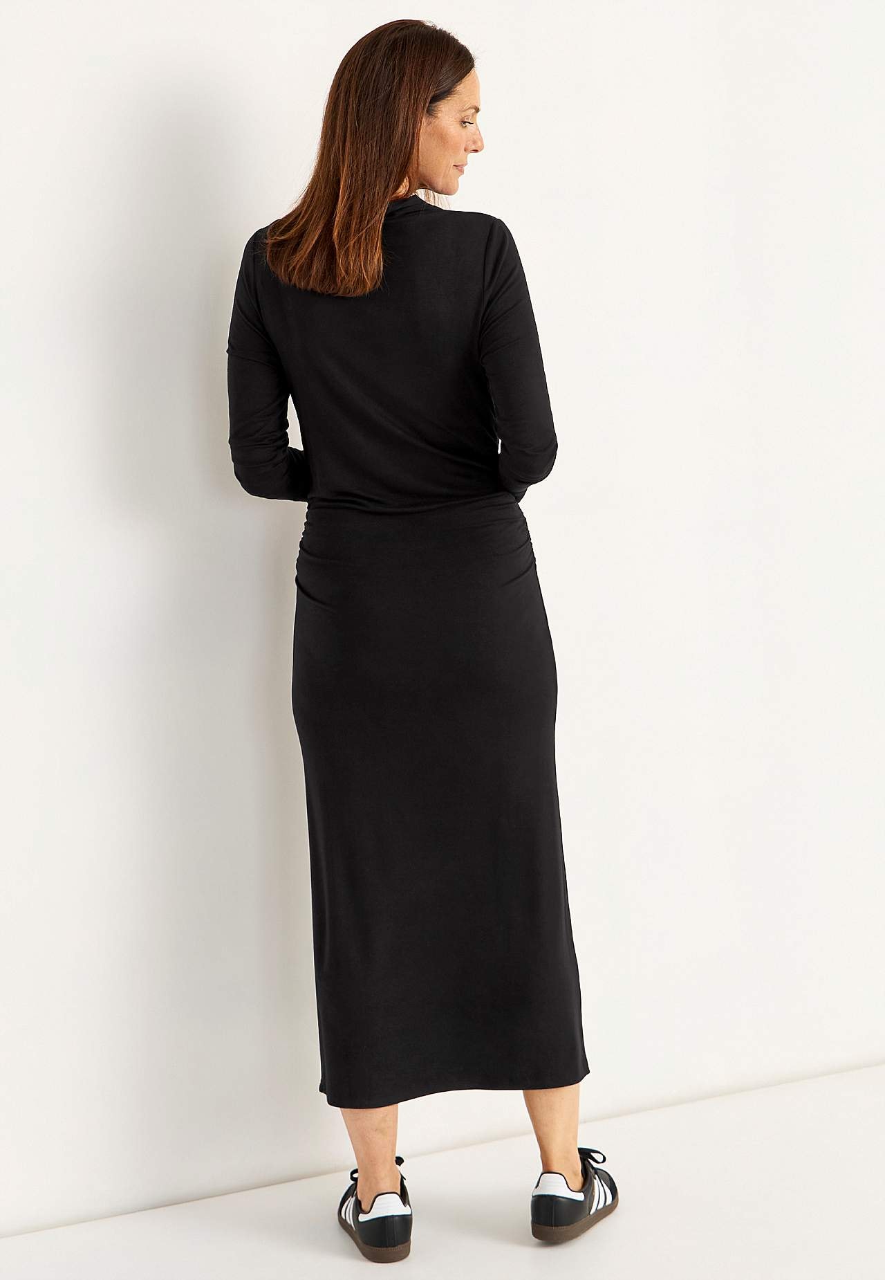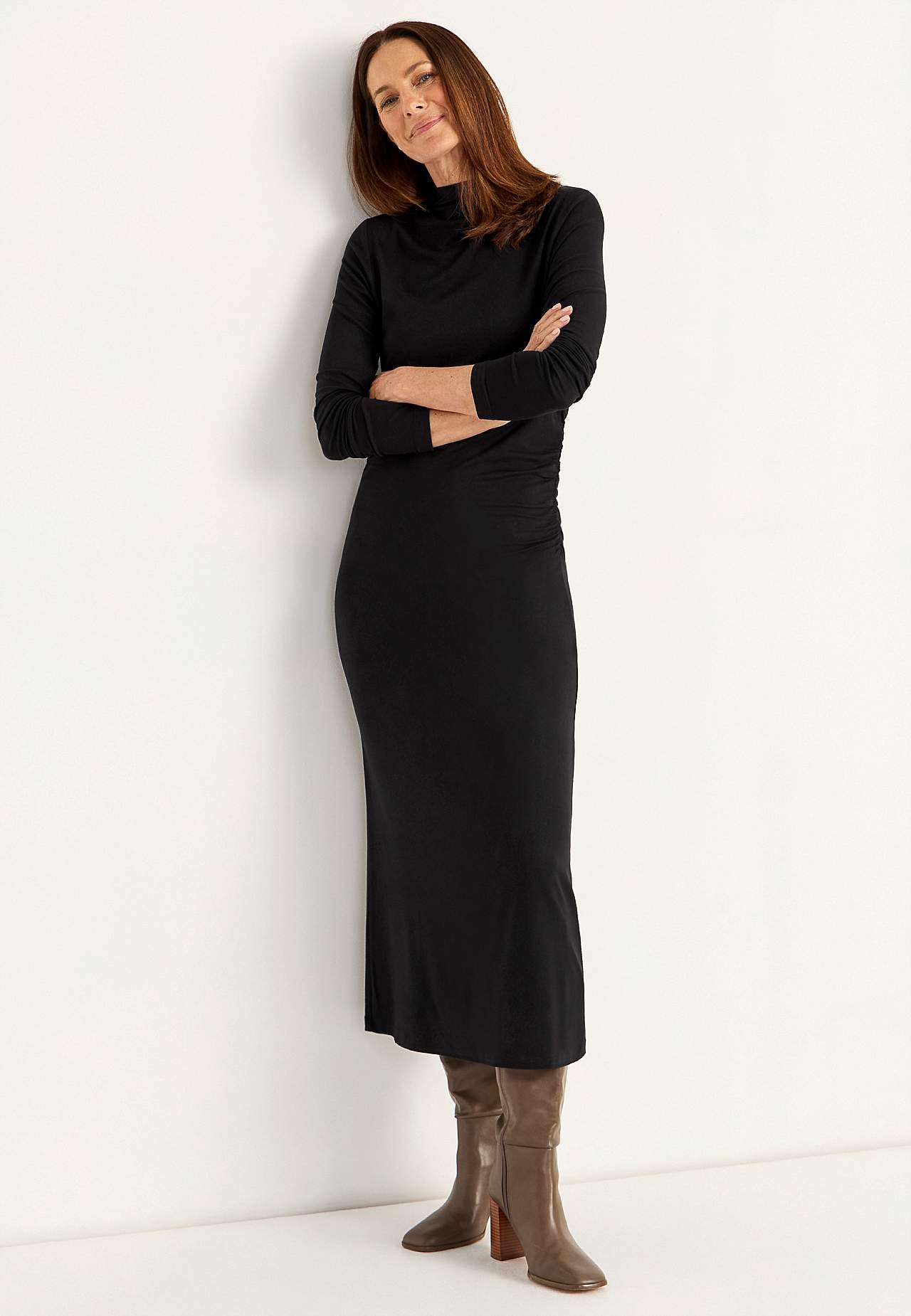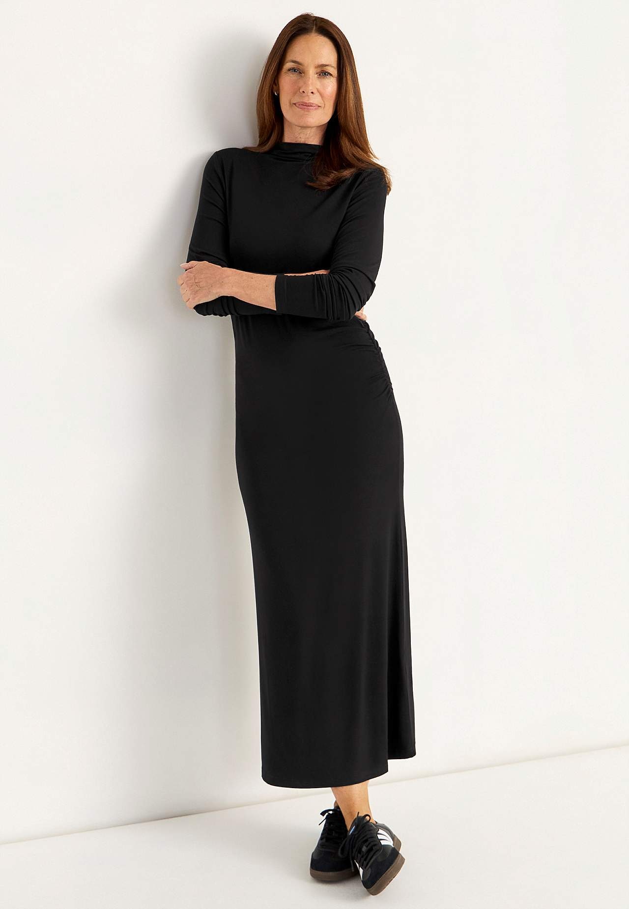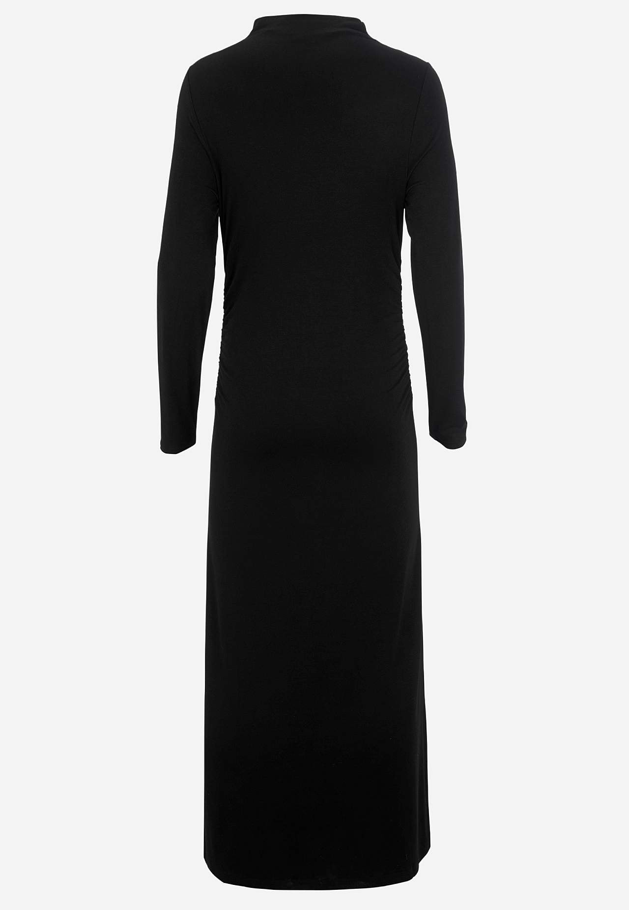 Sukienka ze zachwycająco miękkiej wiskozy ze stretchem z przylegającą. Obcisły fason. Gumka wszyta w boczne szwy na wysokości talii. Lekko luźna spodnia strona. Wygodny półgolf. Wąskie i długie rękawy. Brzeg o prostym kroju. Długość od ramion z tyłu w zależności od rozmiaru ok. 127-129 cm.