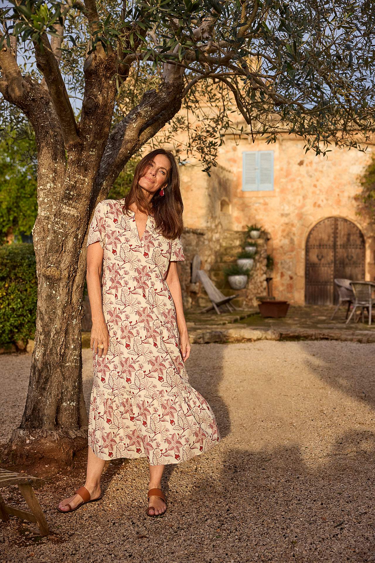 Sukienka z miłej jakości bawełny. Okrągły dekolt z otwarciem w kształcie V. Krótkie rękawy. Skrojony szew na talii. Spodnia strona rozszerzany krój z falbanami. Szyta halka z miękkiej bawełny. Doskonałe na co dzień jak i na wystawne okazje. Długość od ramion w zależności od rozmiaru ok. 124-136 cm.