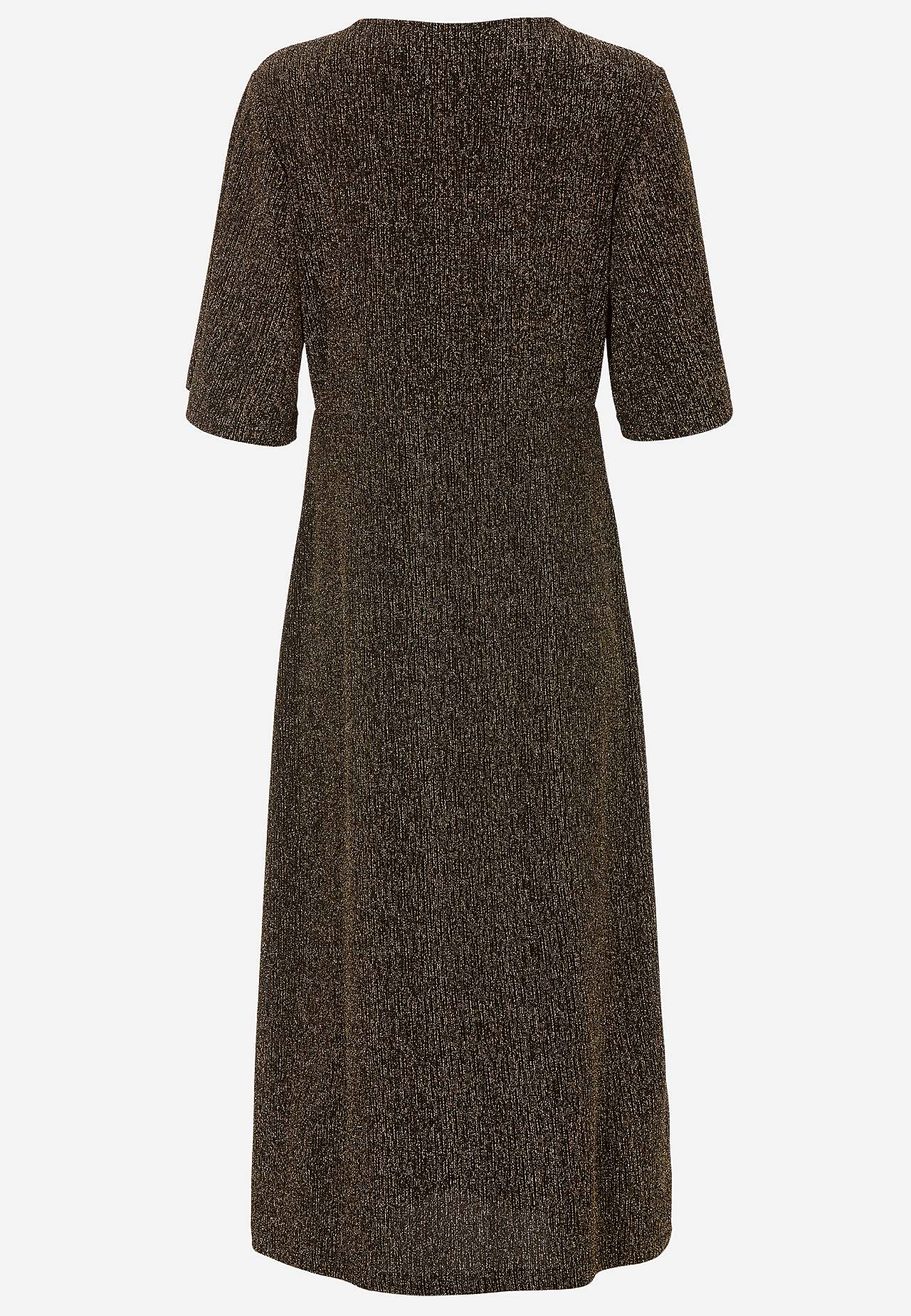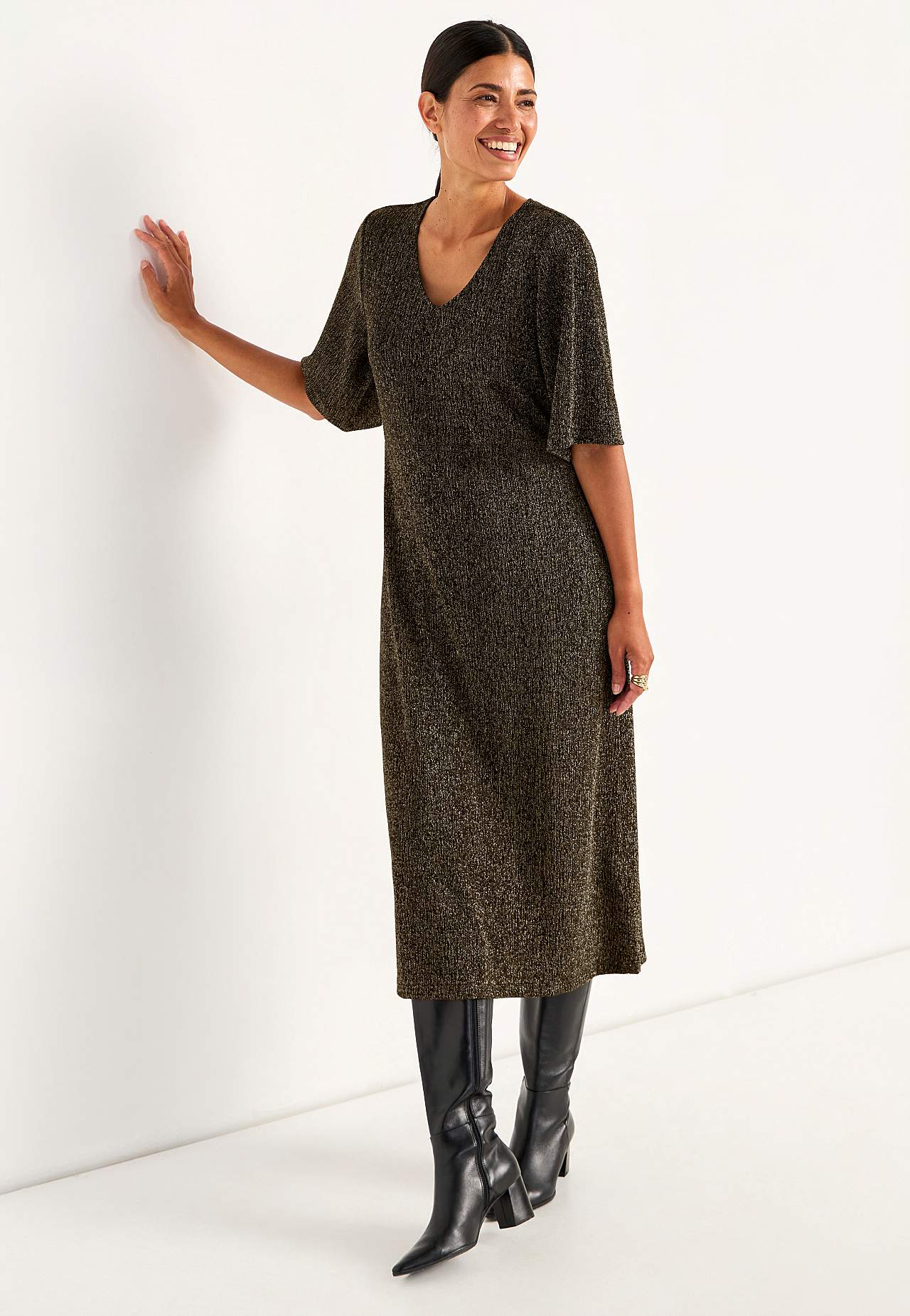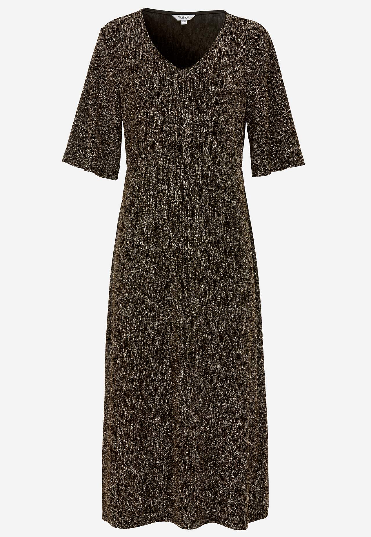 Błyszcząca dżersejowa sukienka idealna na uroczystości. Rozszerzany na dole fason ze szwem w talii. Miękki i elastyczny materiał z błyszczącymi nitkami. Szyja z dekoltem w serek. Krótkie i szerokie rękawy. Prosty brzeg. Długość od ramienia ok. 121 cm we wszystkich rozmiarach.