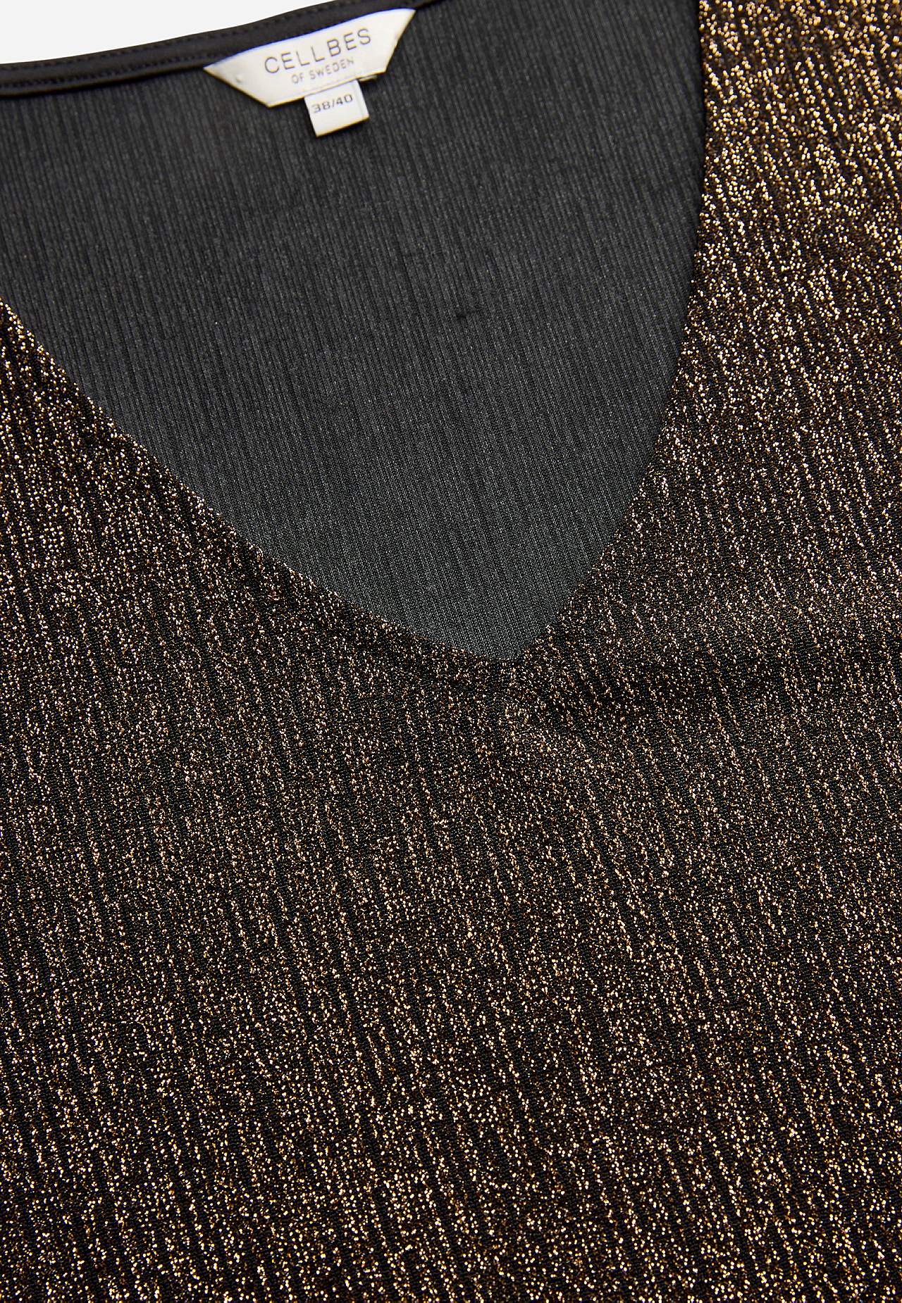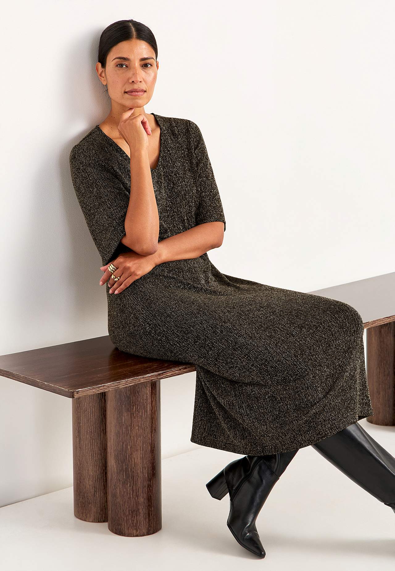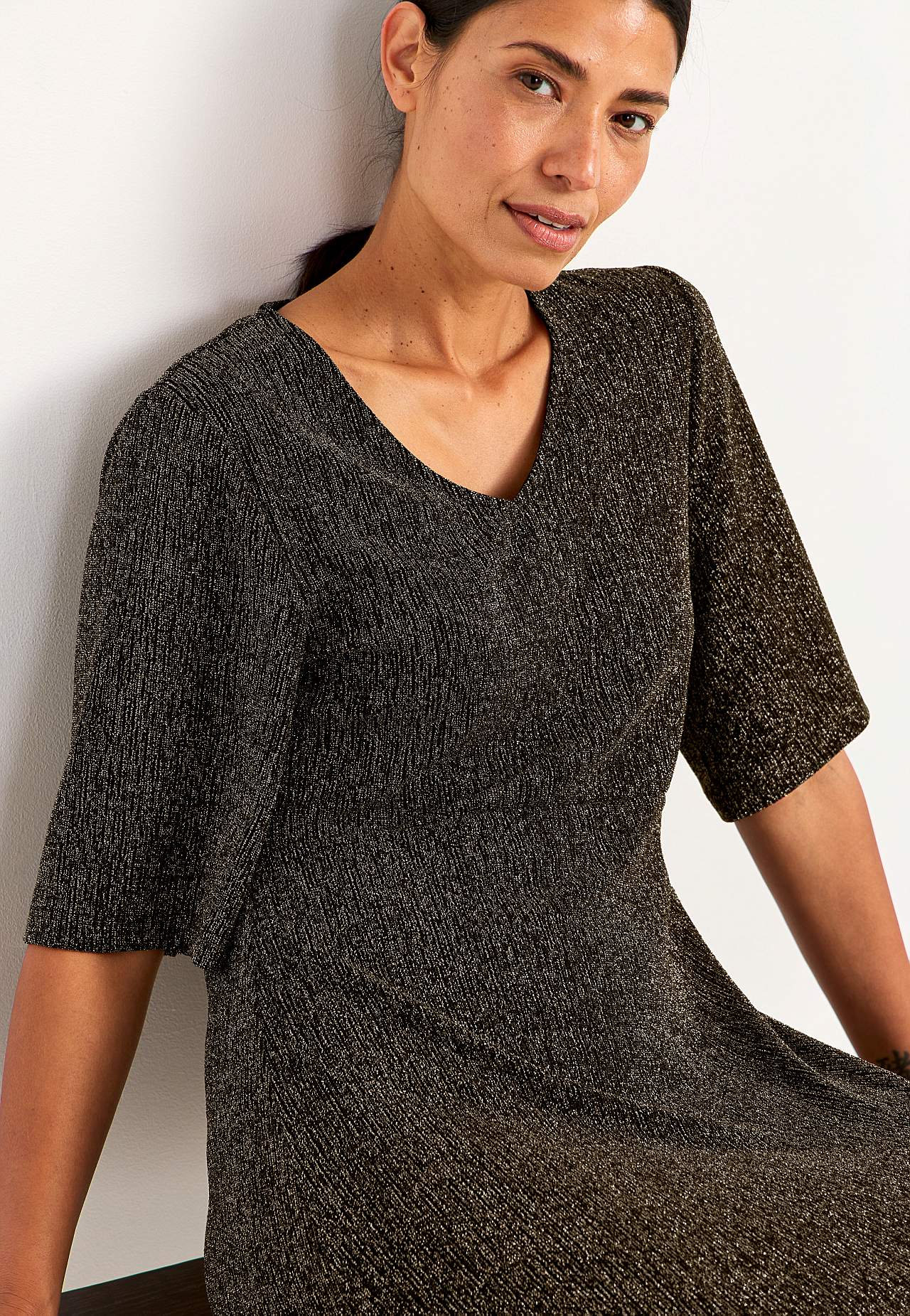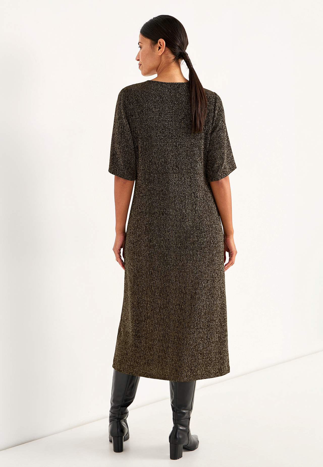 Błyszcząca dżersejowa sukienka idealna na uroczystości. Rozszerzany na dole fason ze szwem w talii. Miękki i elastyczny materiał z błyszczącymi nitkami. Szyja z dekoltem w serek. Krótkie i szerokie rękawy. Prosty brzeg. Długość od ramienia ok. 121 cm we wszystkich rozmiarach.