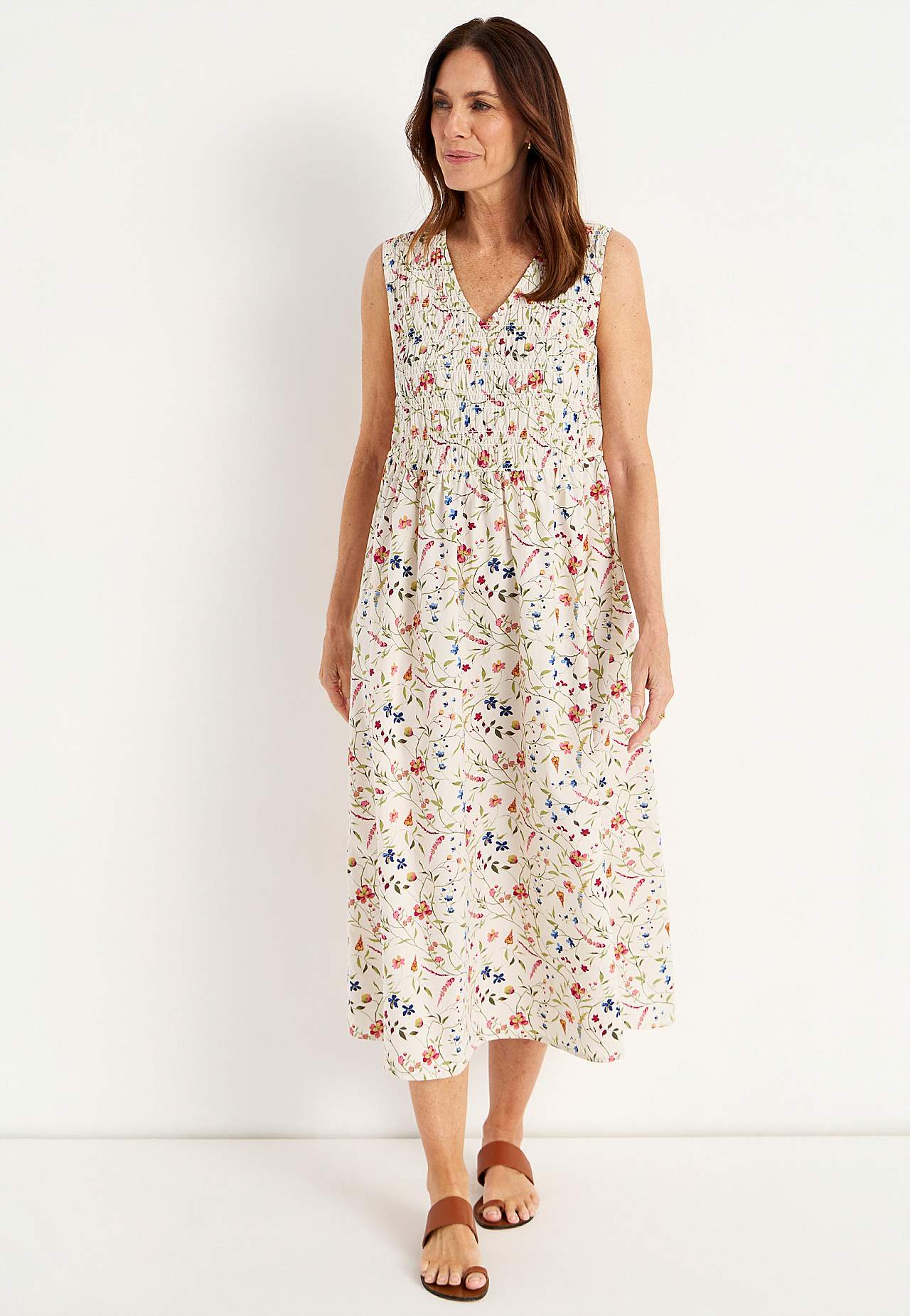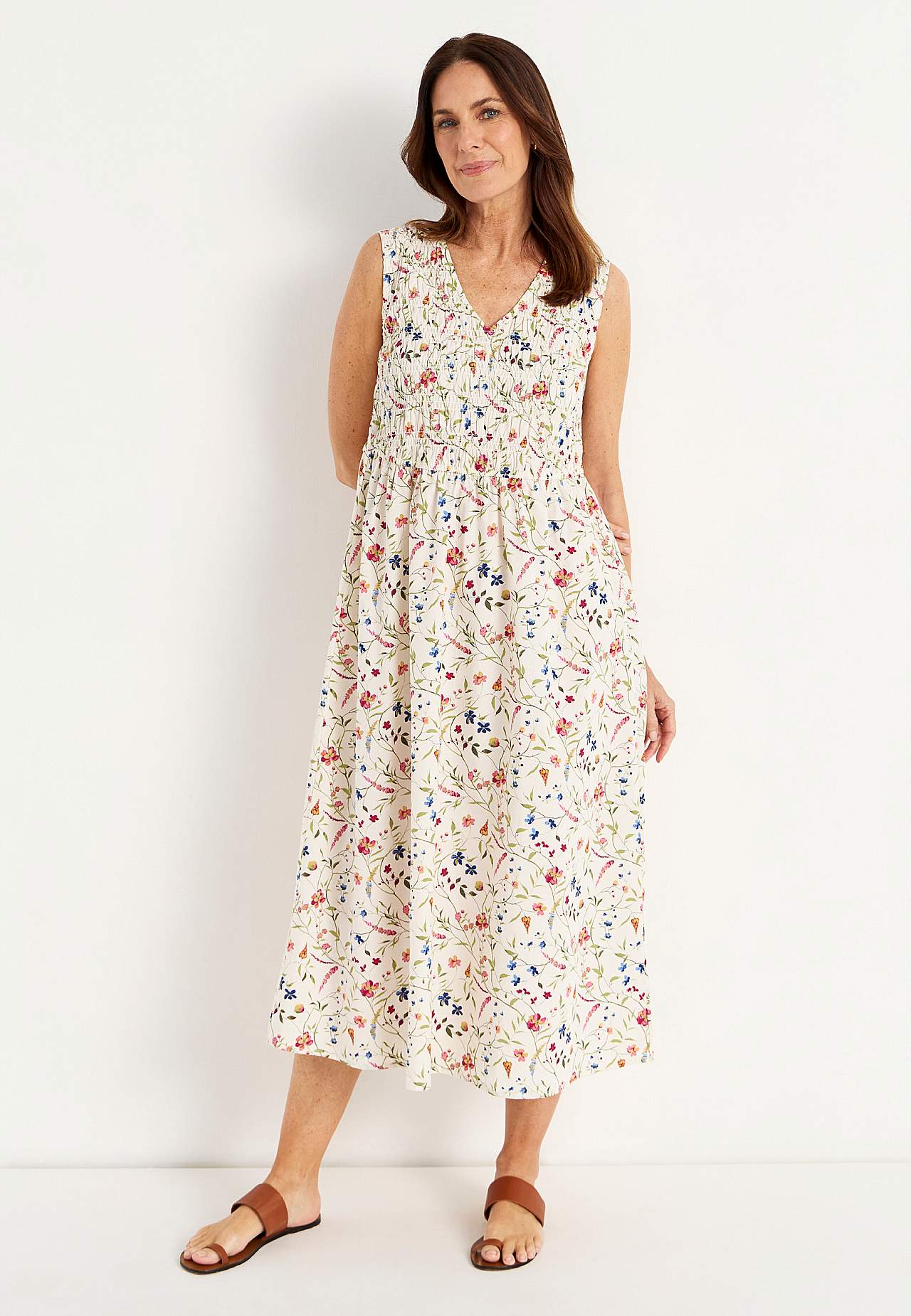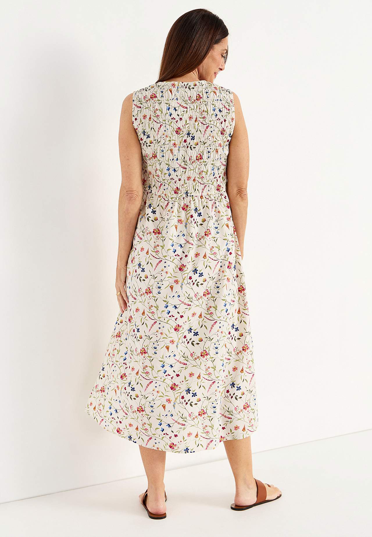 Sukienka typu smock na letnie okazje. Łatwo ją ubrać ze sandałami i biżuterią albo nosić na luzie z klapkami w ciepły letni dzień. Przyjemna sukienka bez rękawów z marszczeniem na stronie wierzchniej. Miękka i chłodząca popelina z gładką powierzchnią i lekki i stabilny dotyk. Ściągana góra z elastycznym i twarzowym fasonem... Czytaj więcej