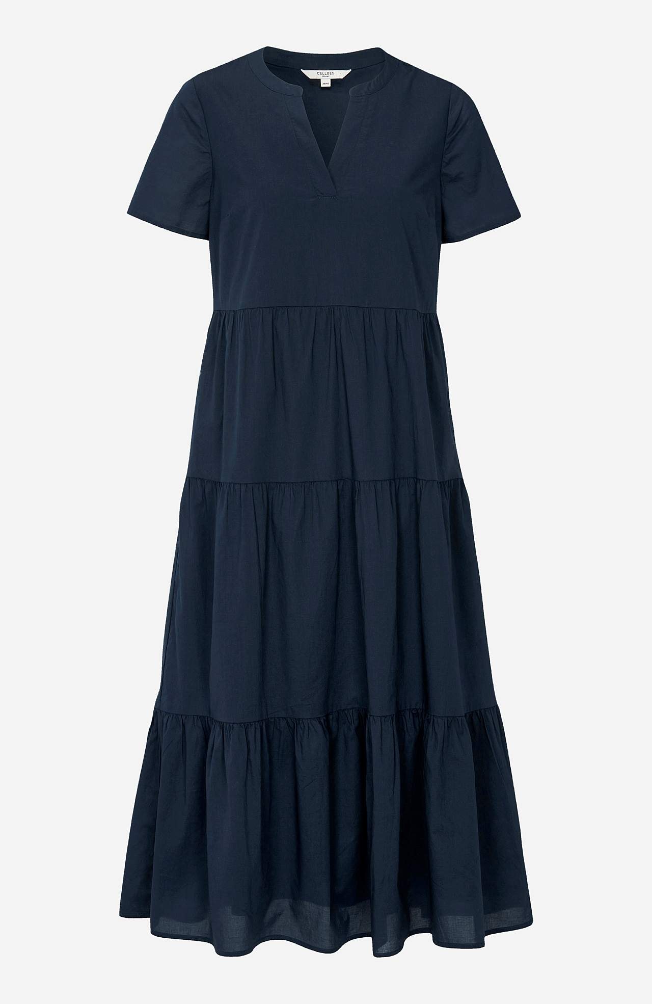 Sukienka z miłej jakości bawełny. Okrągły dekolt z otwarciem w kształcie V. Skrojony szew na talii. Spodnia strona rozszerzany krój z falbanką i cienką i szytą spódnicą. Krótkie rękawy. Długość od ramion w zależności od rozmiaru ok. 124-136 cm.