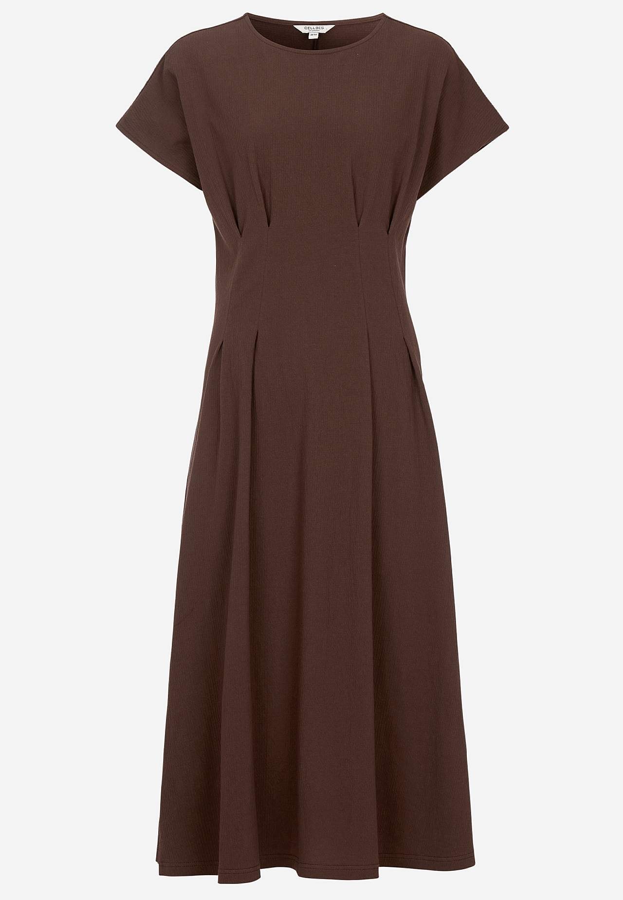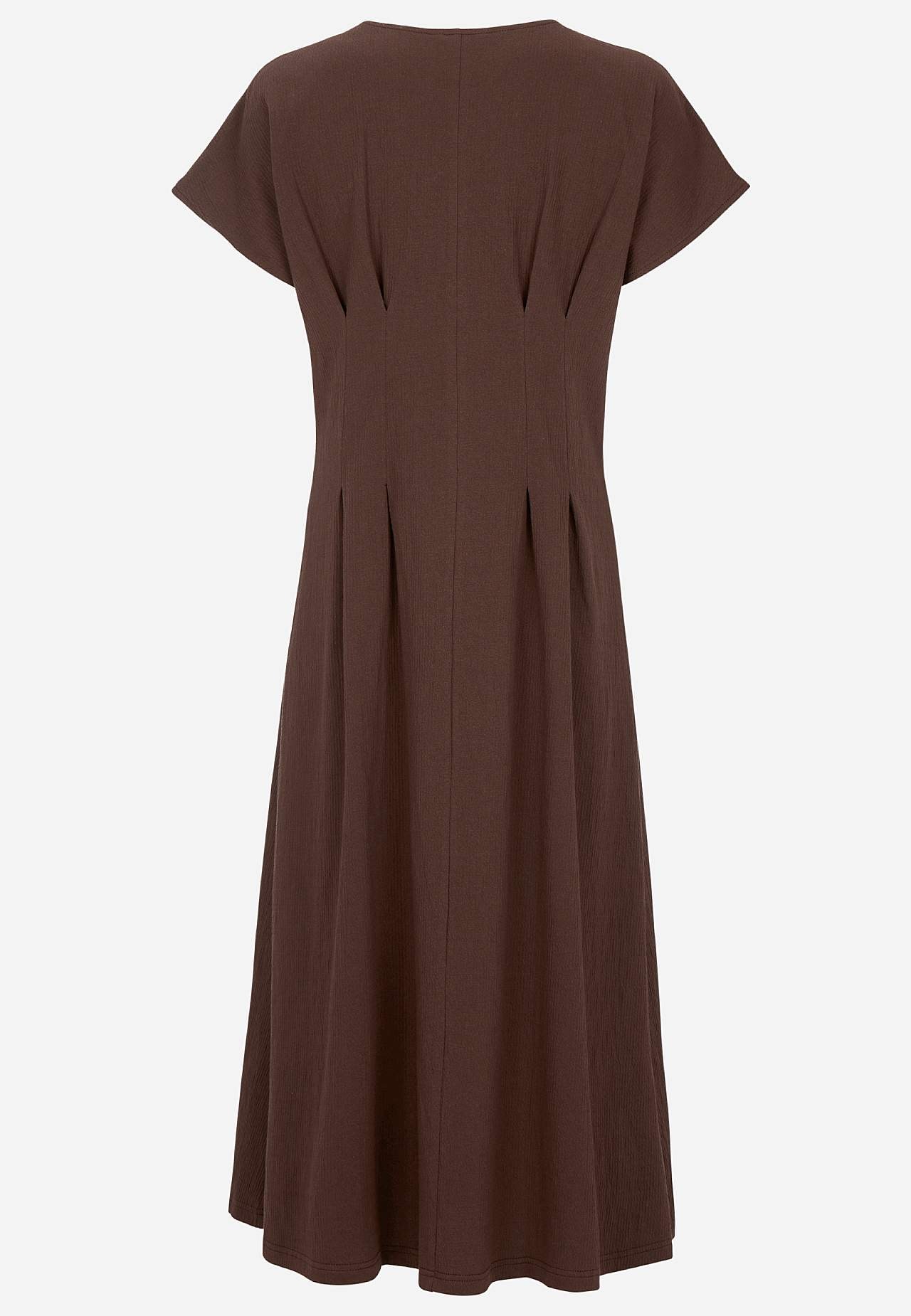 Kobieca dżersejowa sukienka z falistą strukturą. Miękki i elastyczny materiał. Rugularny fason z częścią spódnicy rozszerzany krój. Podkreślona talia z wyszczuplającą sylwetkę zaszewką zarówno z przodu jak i z tyłu. Zaokrąglona szyja. Krótkie kapturkowe rękawy. Lekko zaokrąglony brzeg. Długość z tyłu zależna od rozmiaru, ok... Czytaj więcej