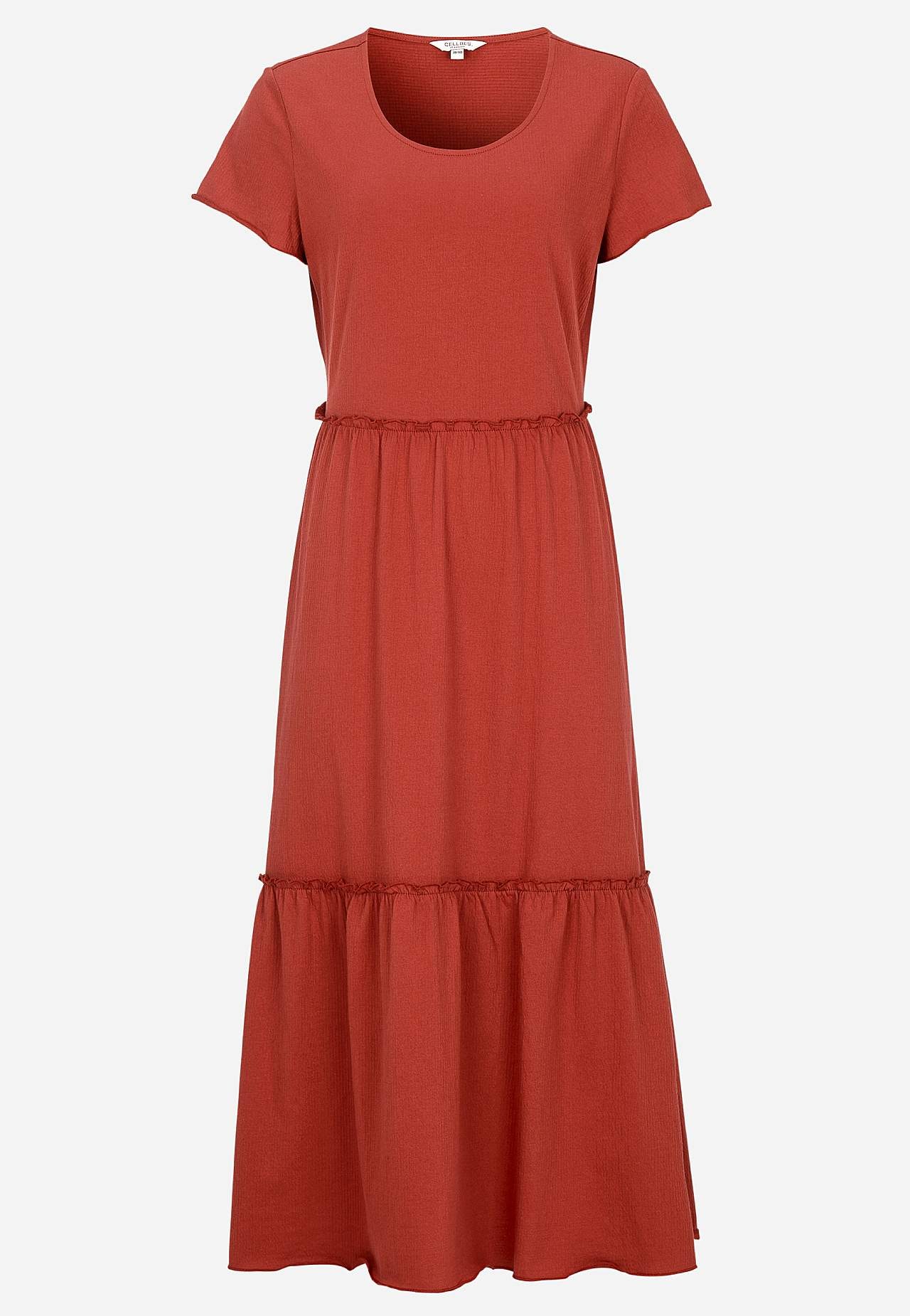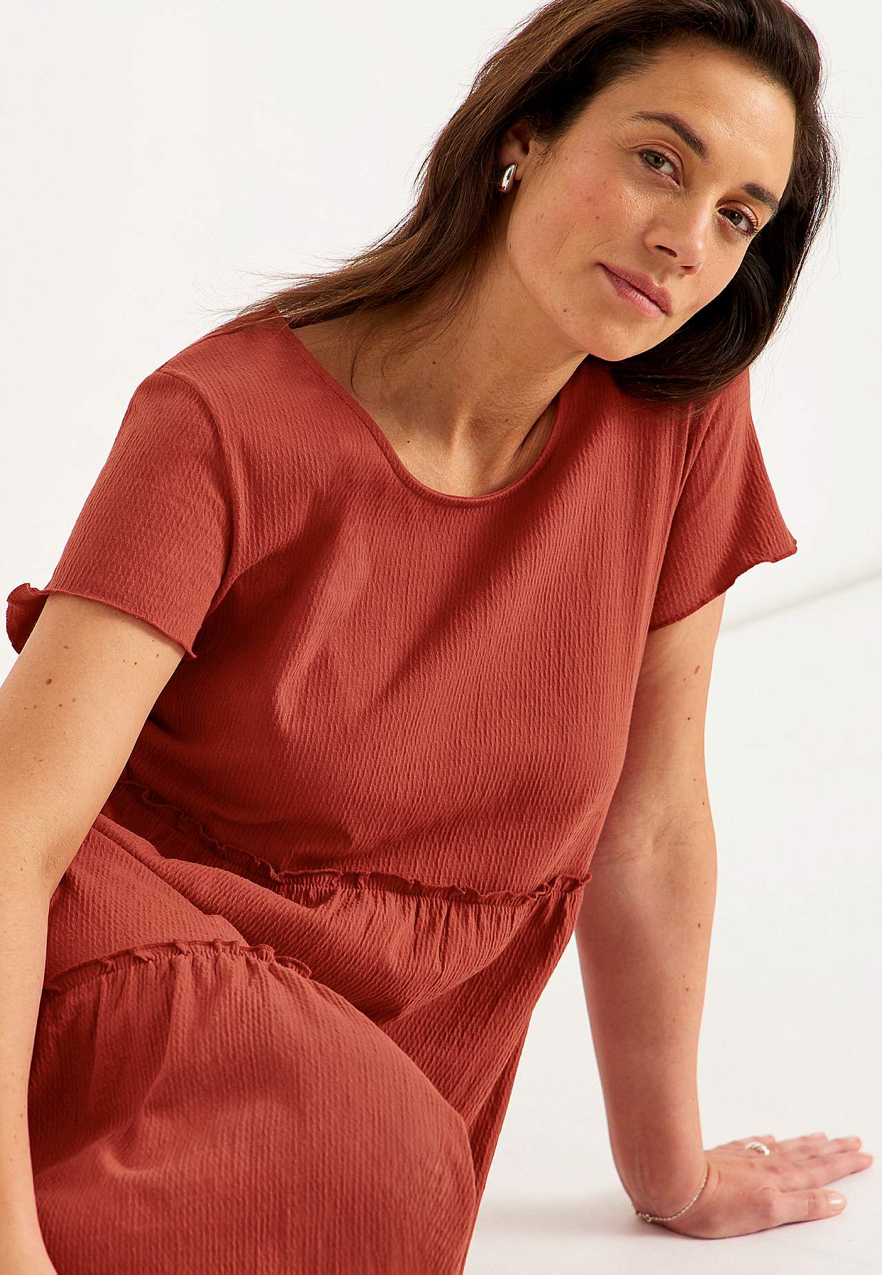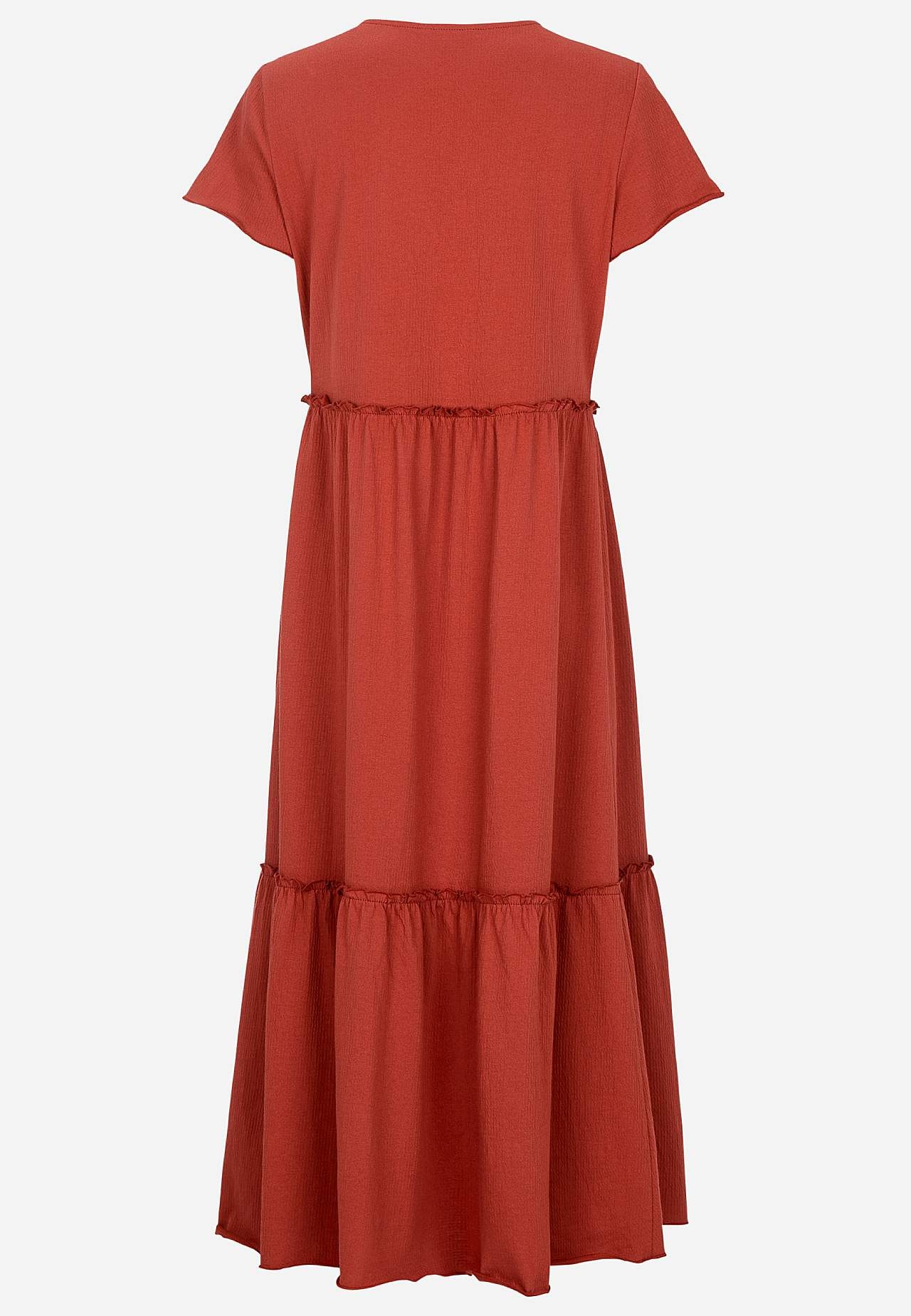 Elastyczna i miękka sukienka z falbankami z falistą strukturą. Swobodny i rozszerzany na dole fason. Część spódnicy z przyjemną szerokością. Wykończony overlockiem, falisty i cienki szew na spodzie, na krawędzi falbany i na mankietach. Zaokrąglona szyja. Krótkie kapturkowe rękawy. Lekko zaokrąglony brzeg. Długość pleców we ... Czytaj więcej
