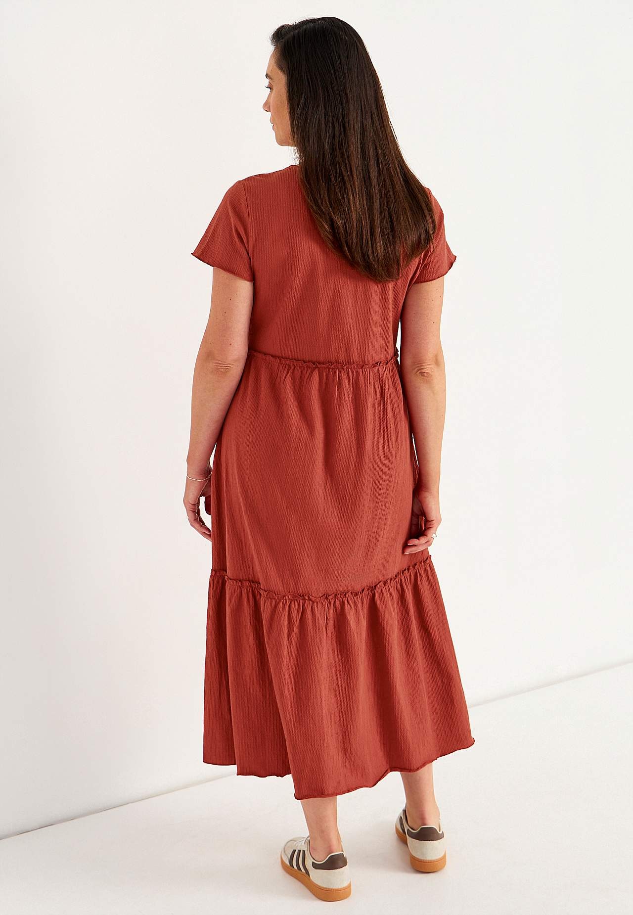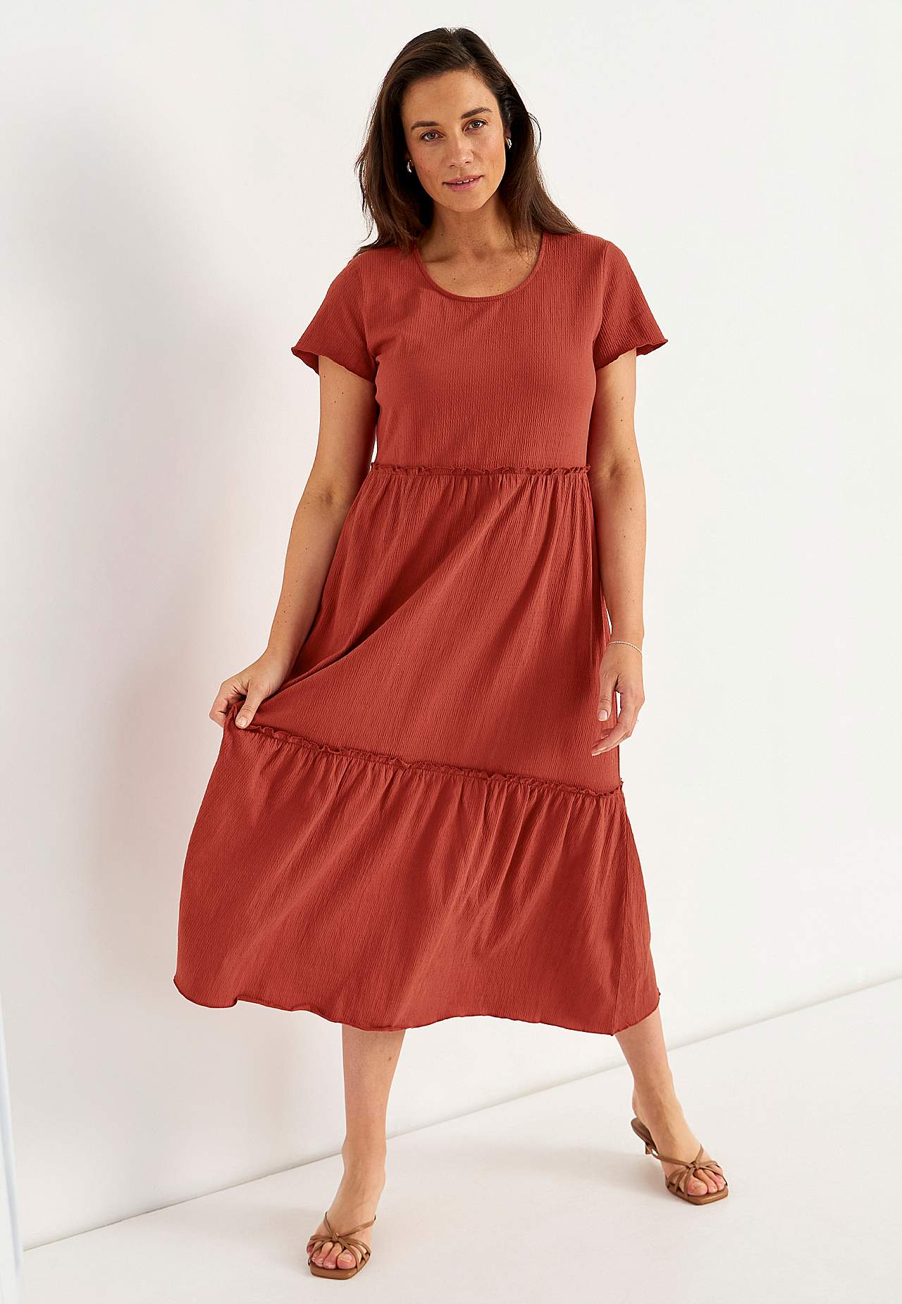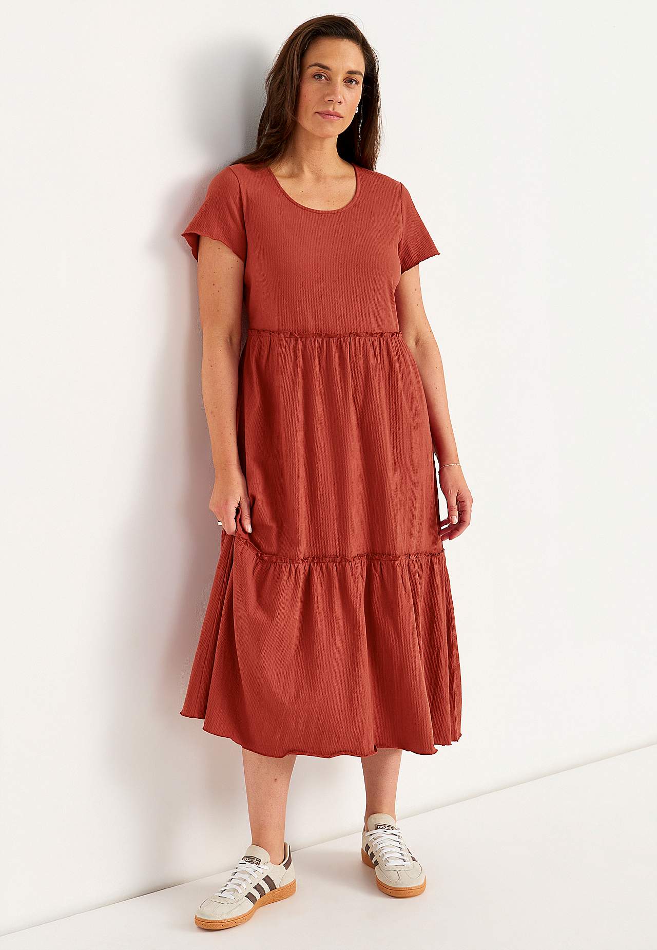 Elastyczna i miękka sukienka z falbankami z falistą strukturą. Swobodny i rozszerzany na dole fason. Część spódnicy z przyjemną szerokością. Wykończony overlockiem, falisty i cienki szew na spodzie, na krawędzi falbany i na mankietach. Zaokrąglona szyja. Krótkie kapturkowe rękawy. Lekko zaokrąglony brzeg. Długość pleców we ... Czytaj więcej