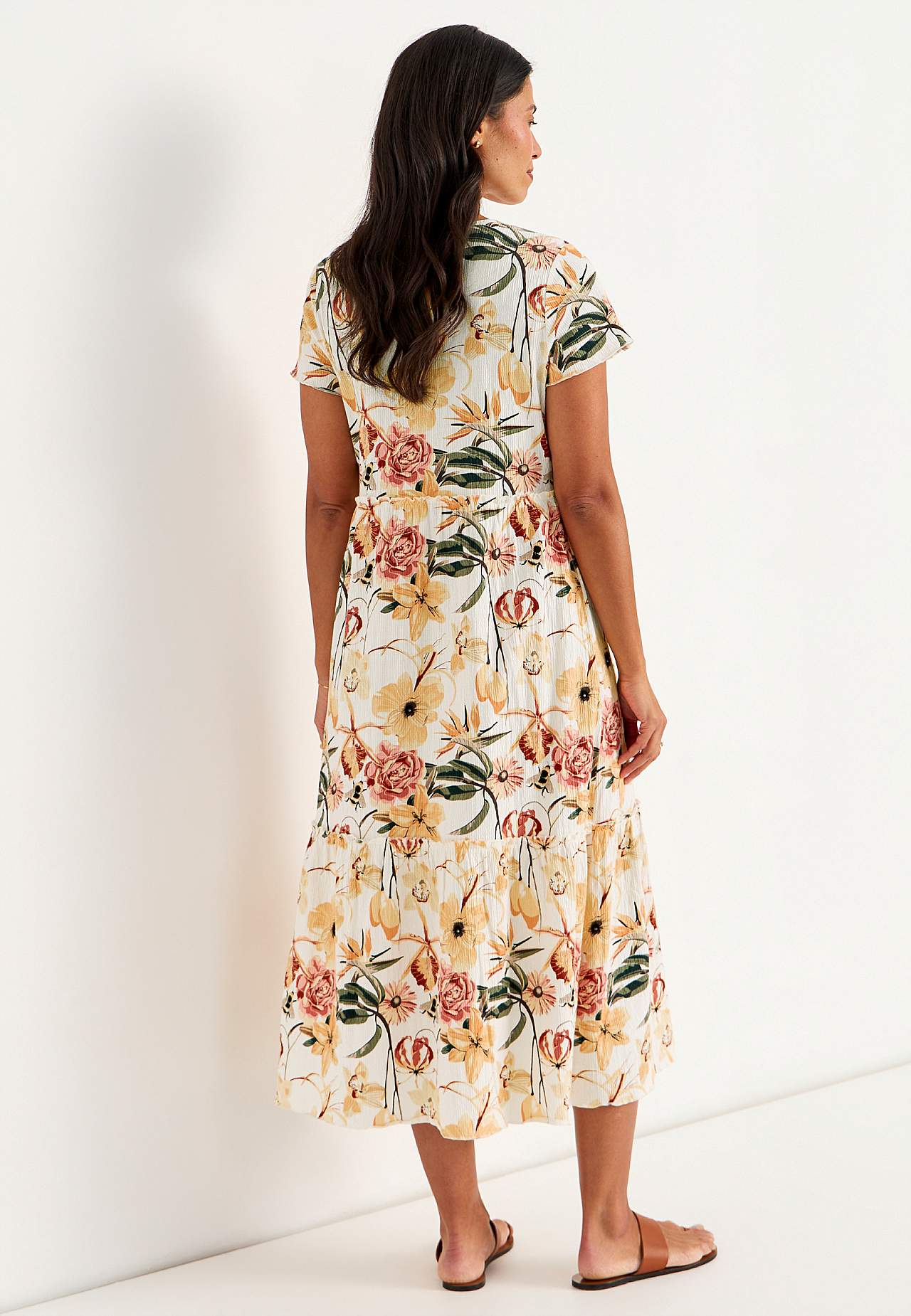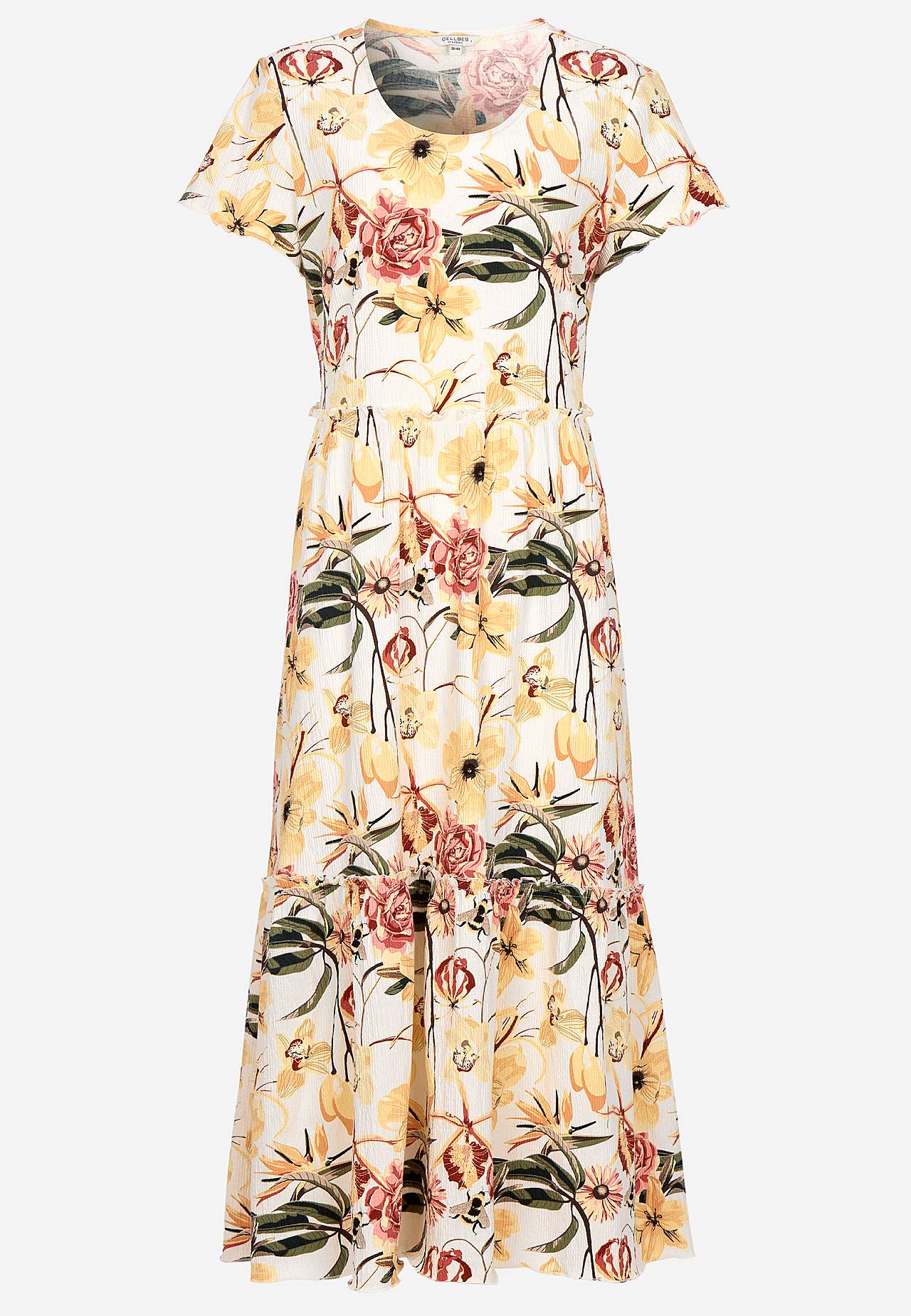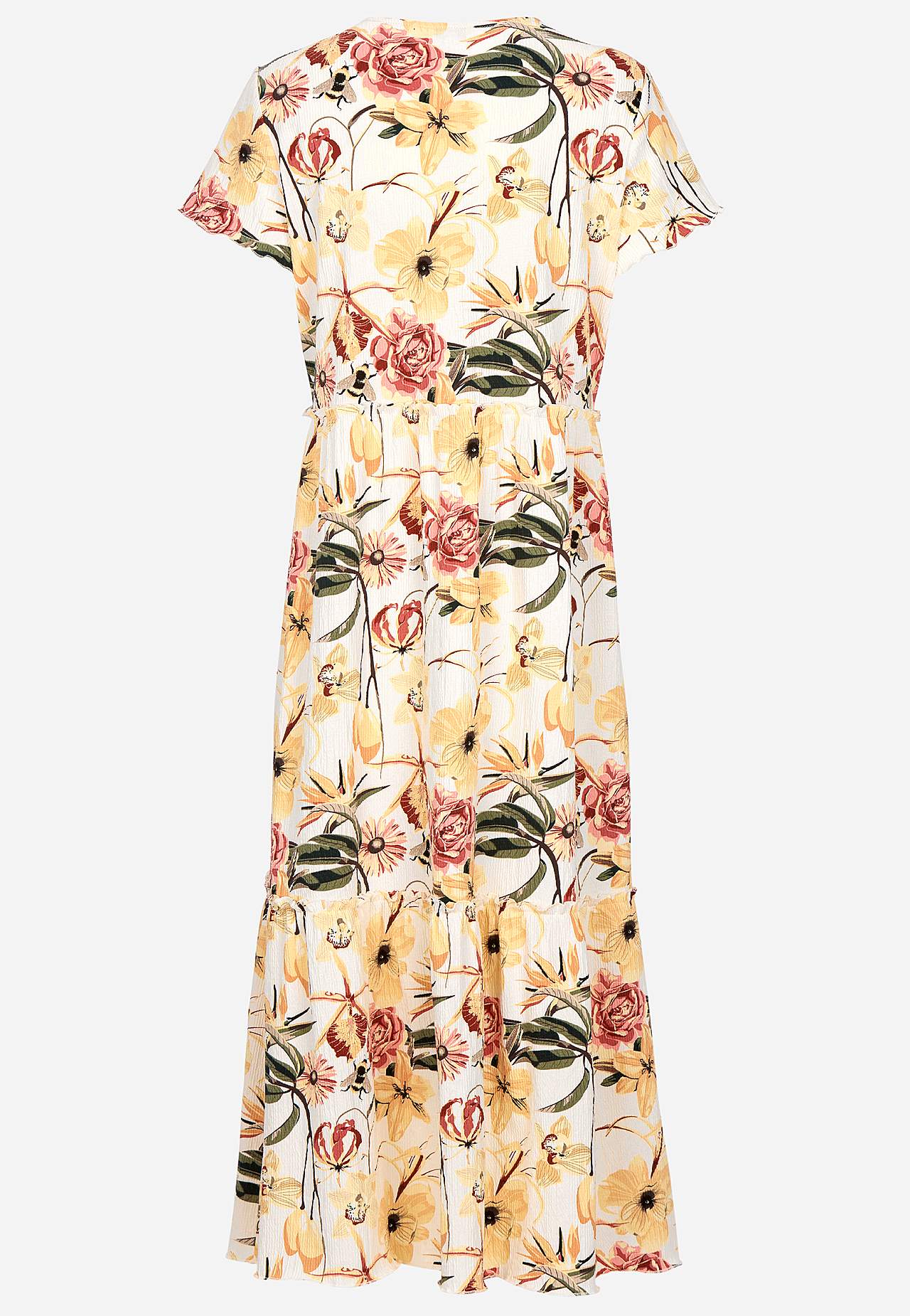 Elastyczna i miękka sukienka z falbankami z falistą strukturą. Swobodny i rozszerzany na dole fason. Część spódnicy z przyjemną szerokością. Wykończony overlockiem, falisty i cienki szew na spodzie, na krawędzi falbany i na mankietach. Zaokrąglona szyja. Krótkie kapturkowe rękawy. Lekko zaokrąglony brzeg. Długość pleców we ... Czytaj więcej