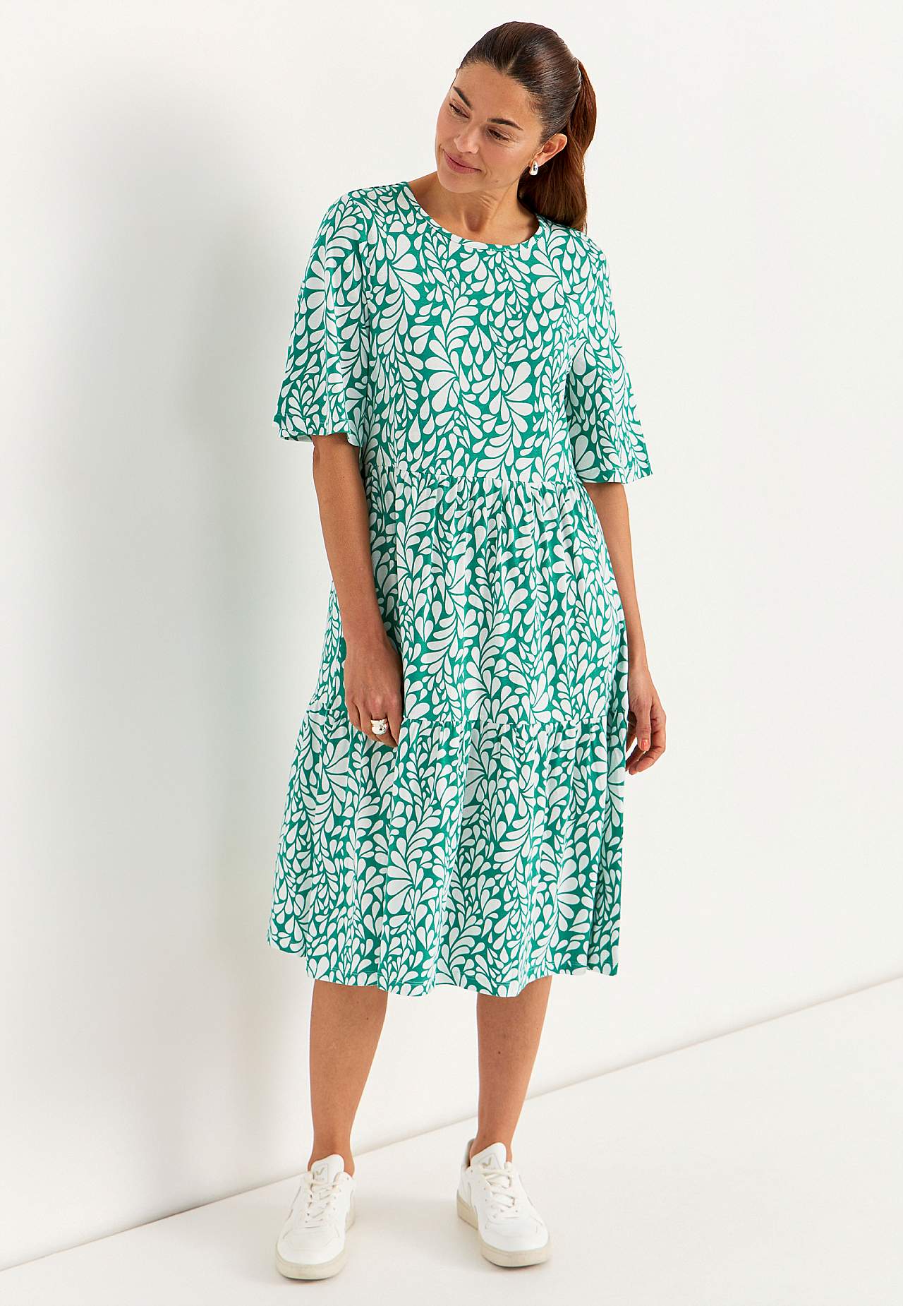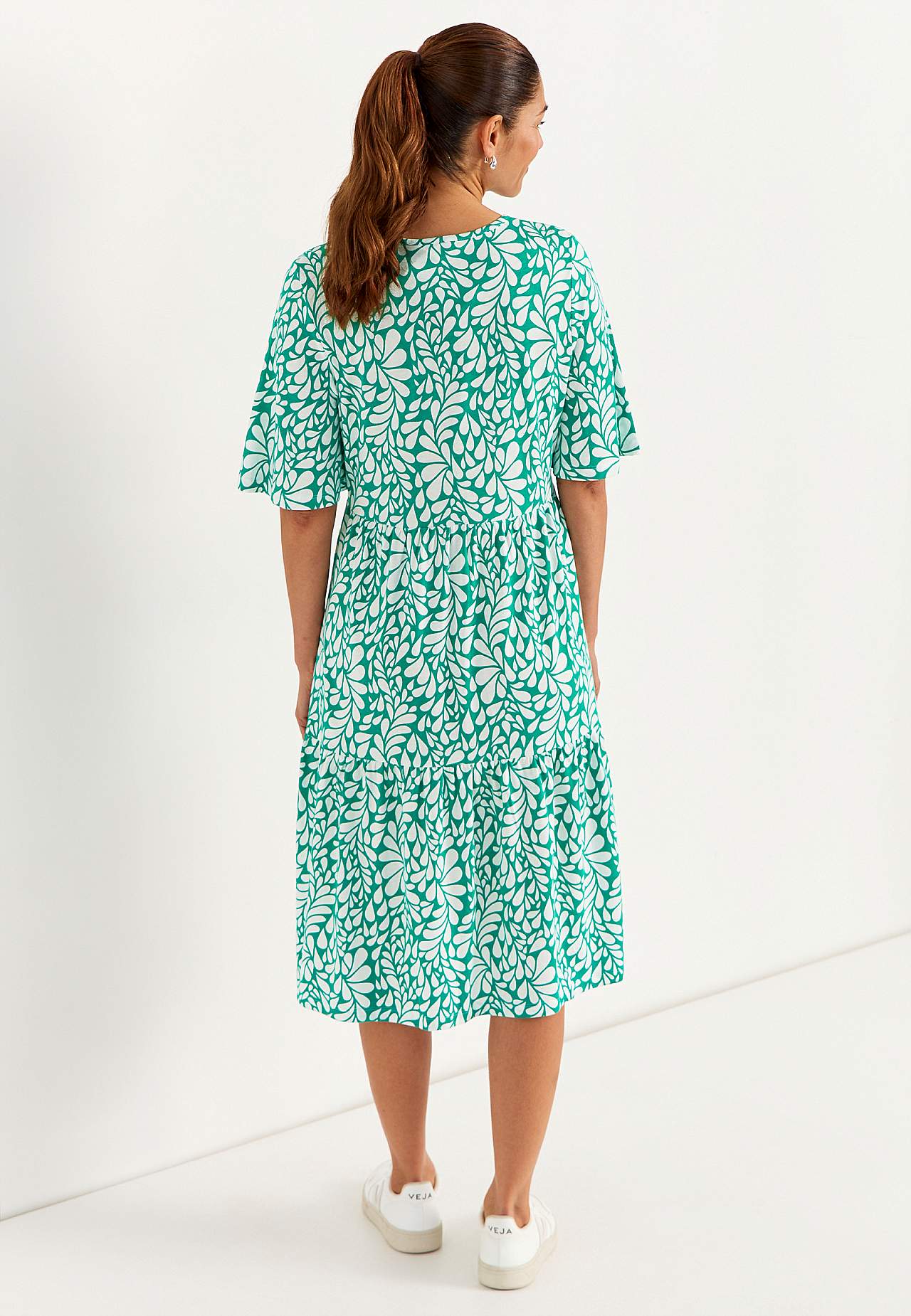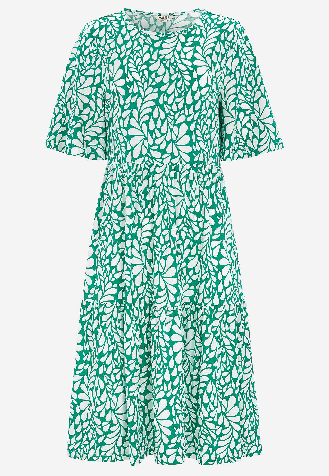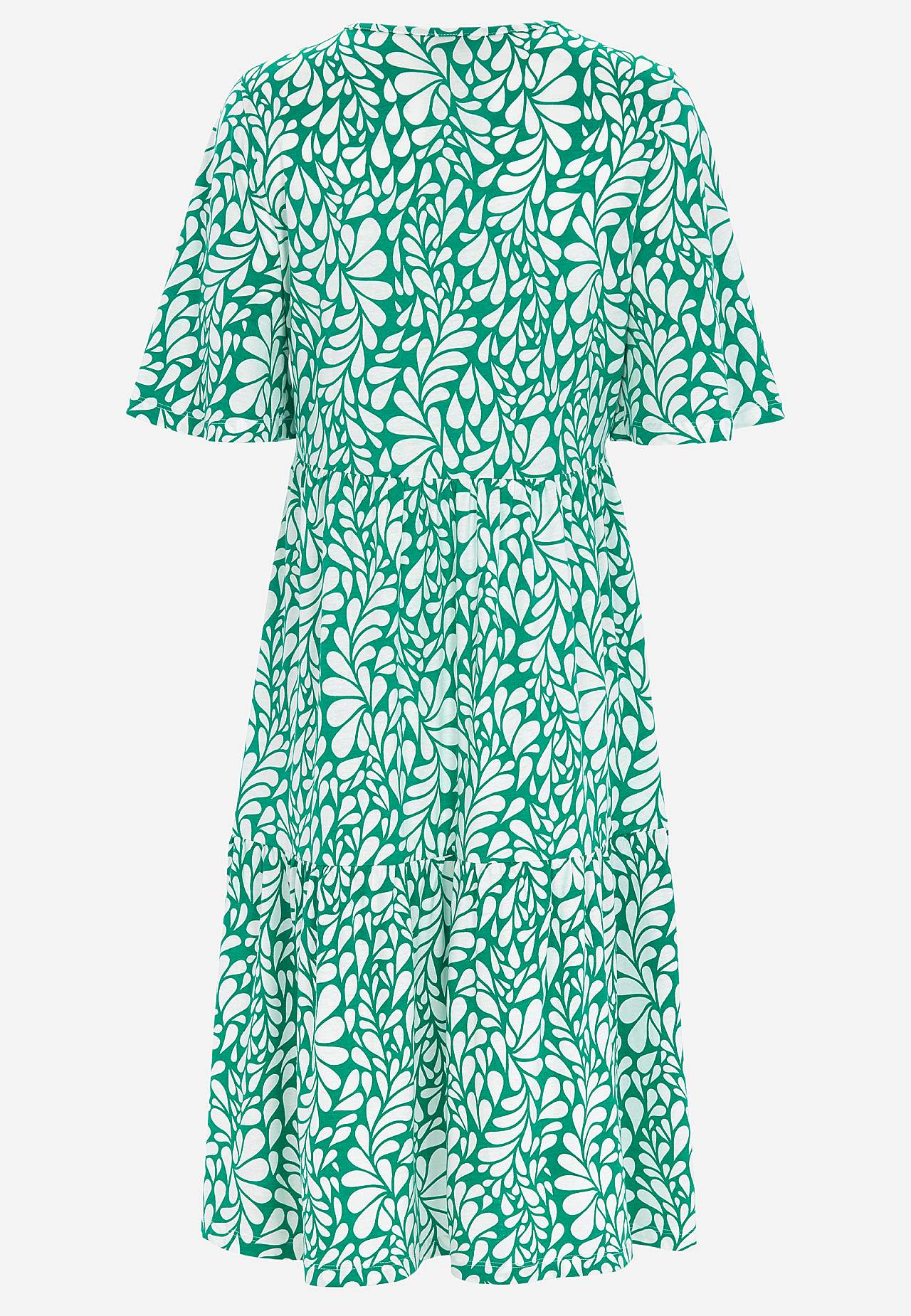 Rozszerzany na dole i luźny fason. Okrągły dekolt. Szew pod biustem. Część spódnicy z falbanką. Lekko zaokrąglony brzeg. Długość z tyłu zależna od rozmiaru, ok. 108 cm.