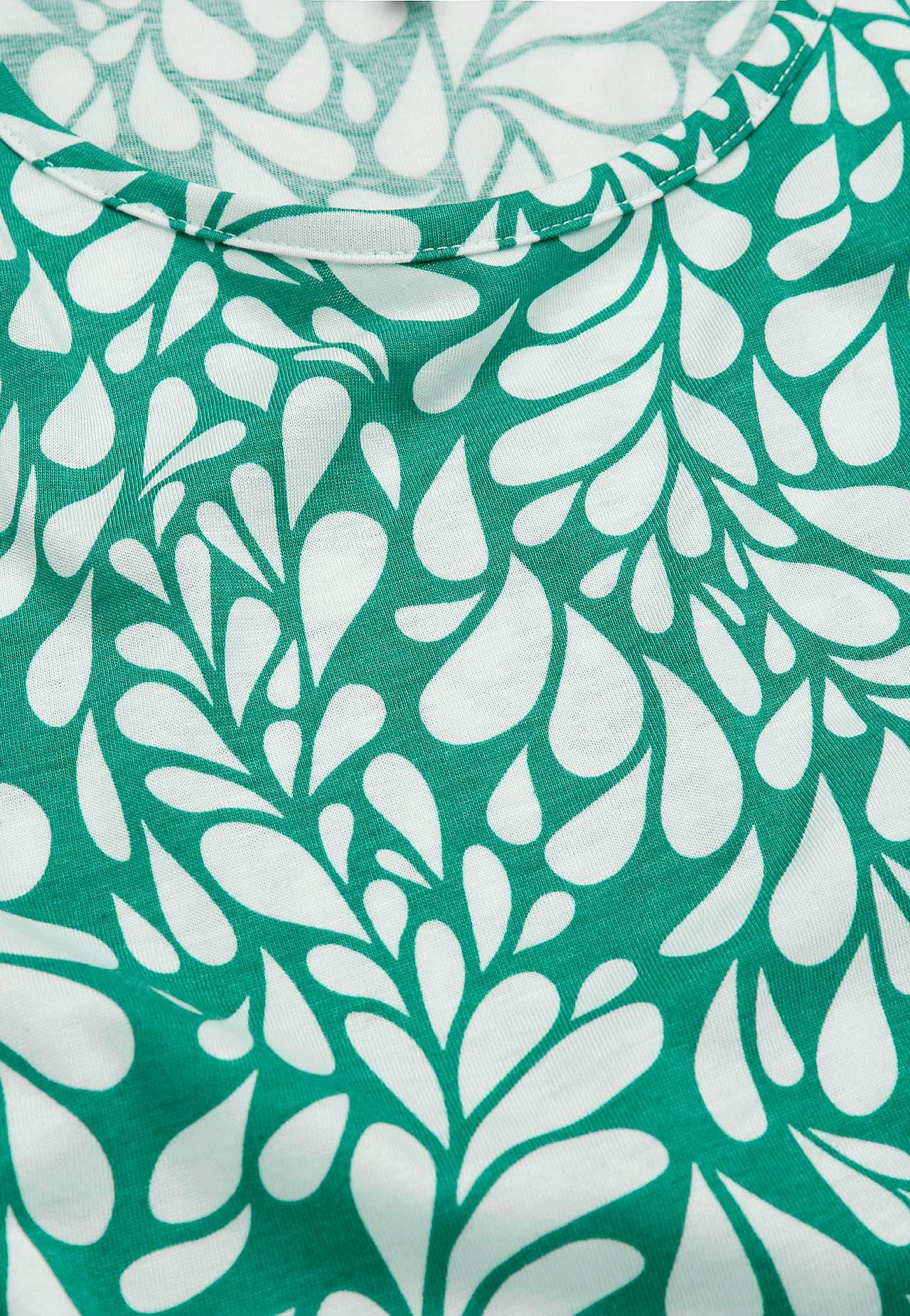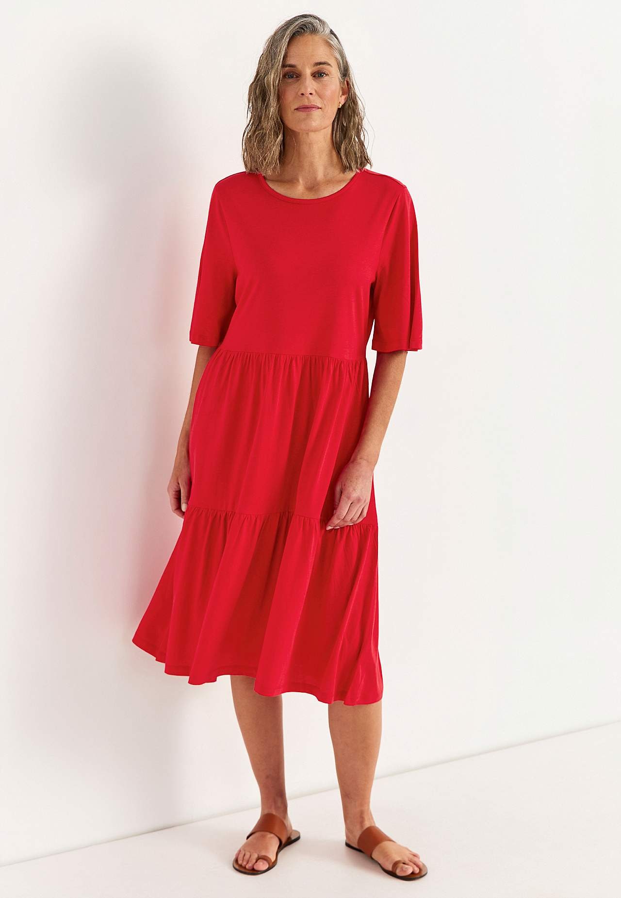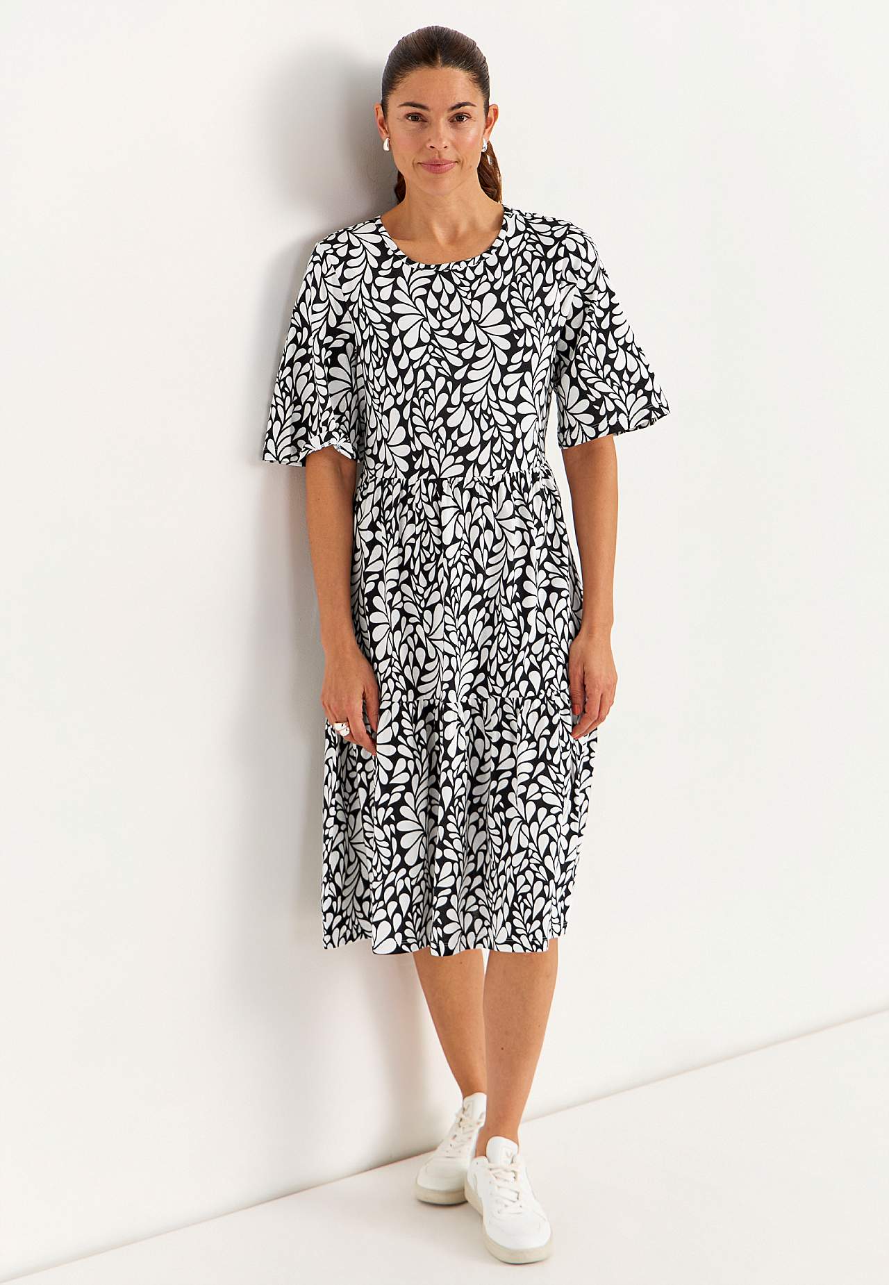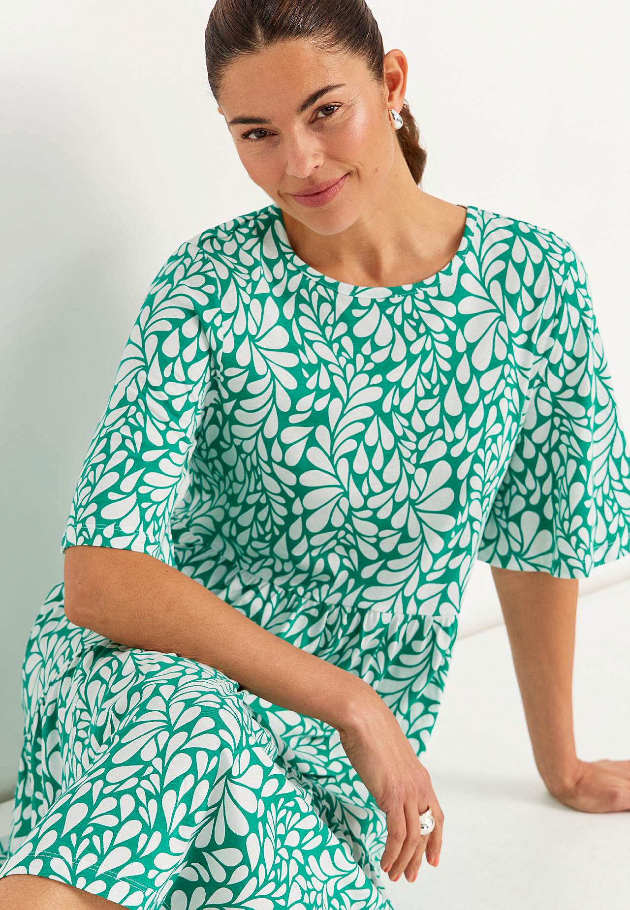Rozszerzany na dole i luźny fason. Okrągły dekolt. Szew pod biustem. Część spódnicy z falbanką. Lekko zaokrąglony brzeg. Długość z tyłu zależna od rozmiaru, ok. 108 cm.