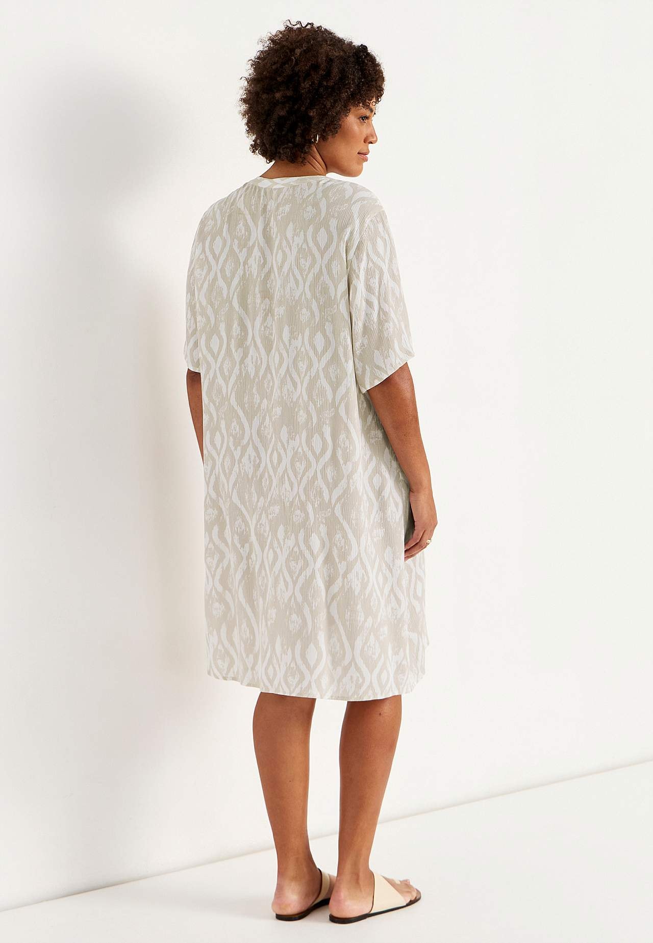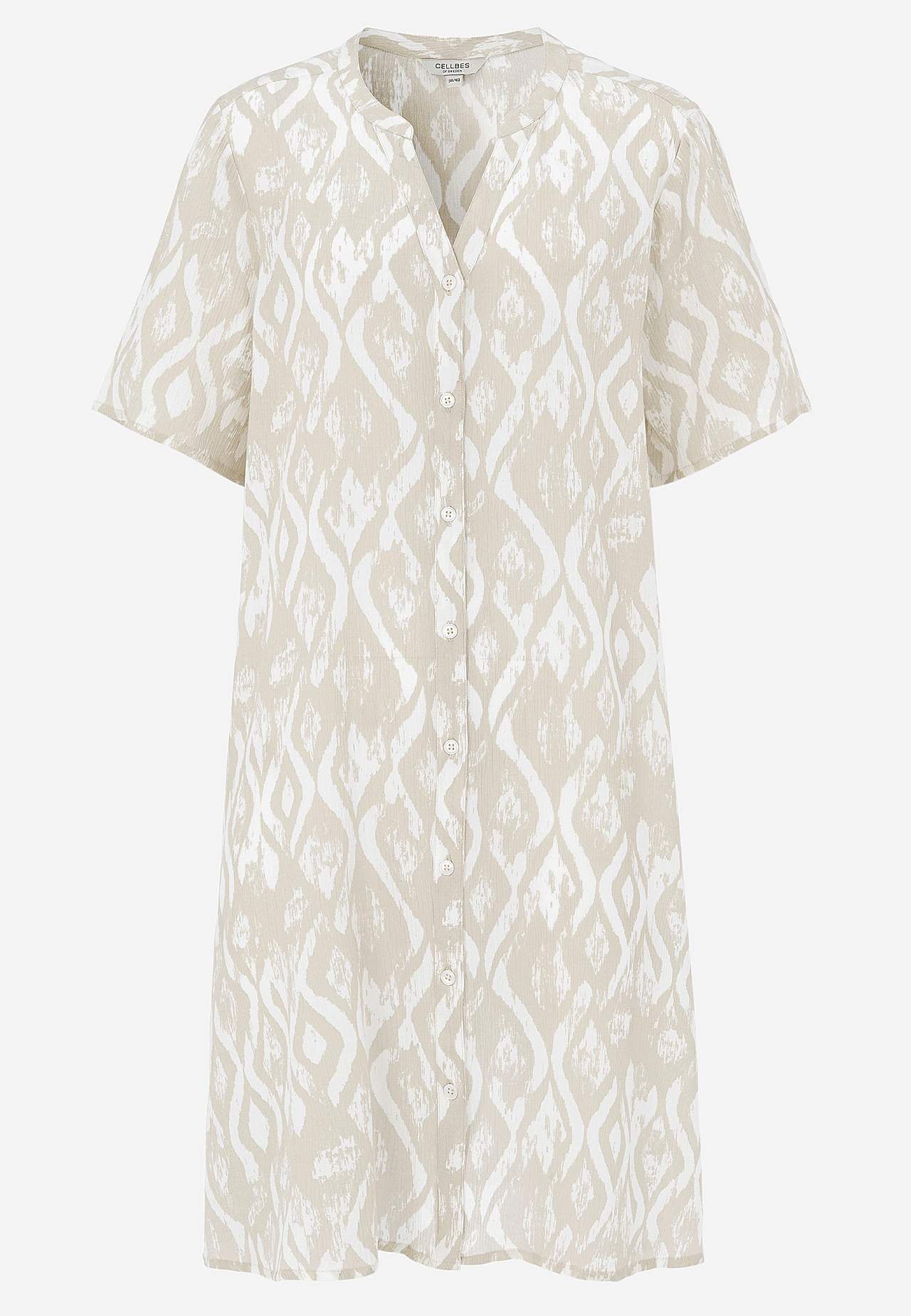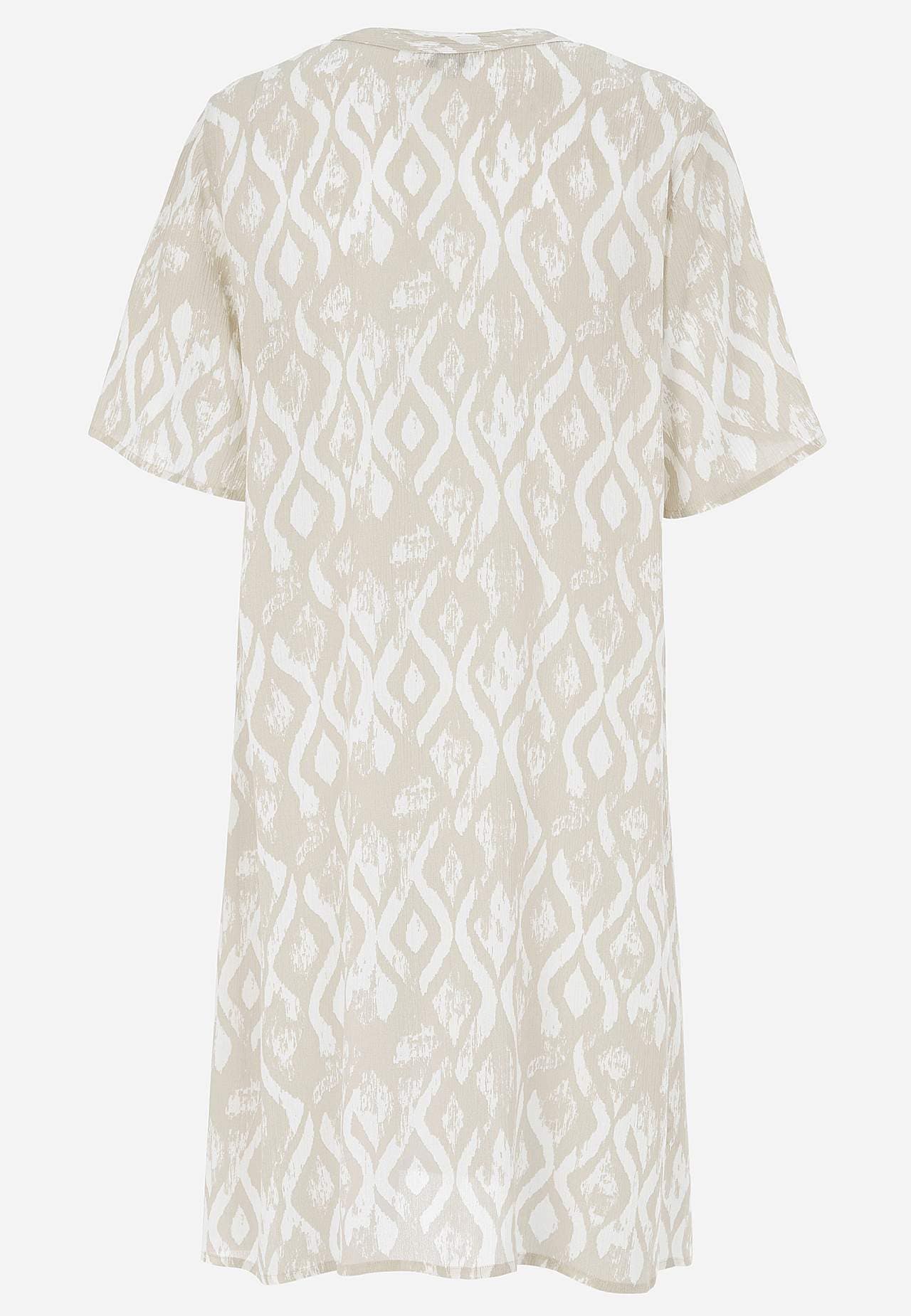 Przewiewny i chłodzący materiał z matową powierzchnią i miłą strukturą. Rozszerzany na dole i bardziej pojemny fason. Zapięcie na guziki z przodu. Krótkie rękawy. Długość z tyłu zależna od rozmiaru, ok. 97-105 cm.