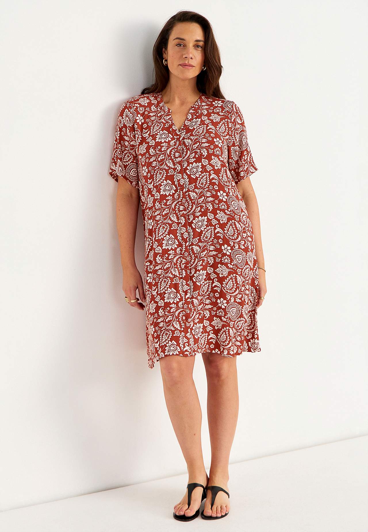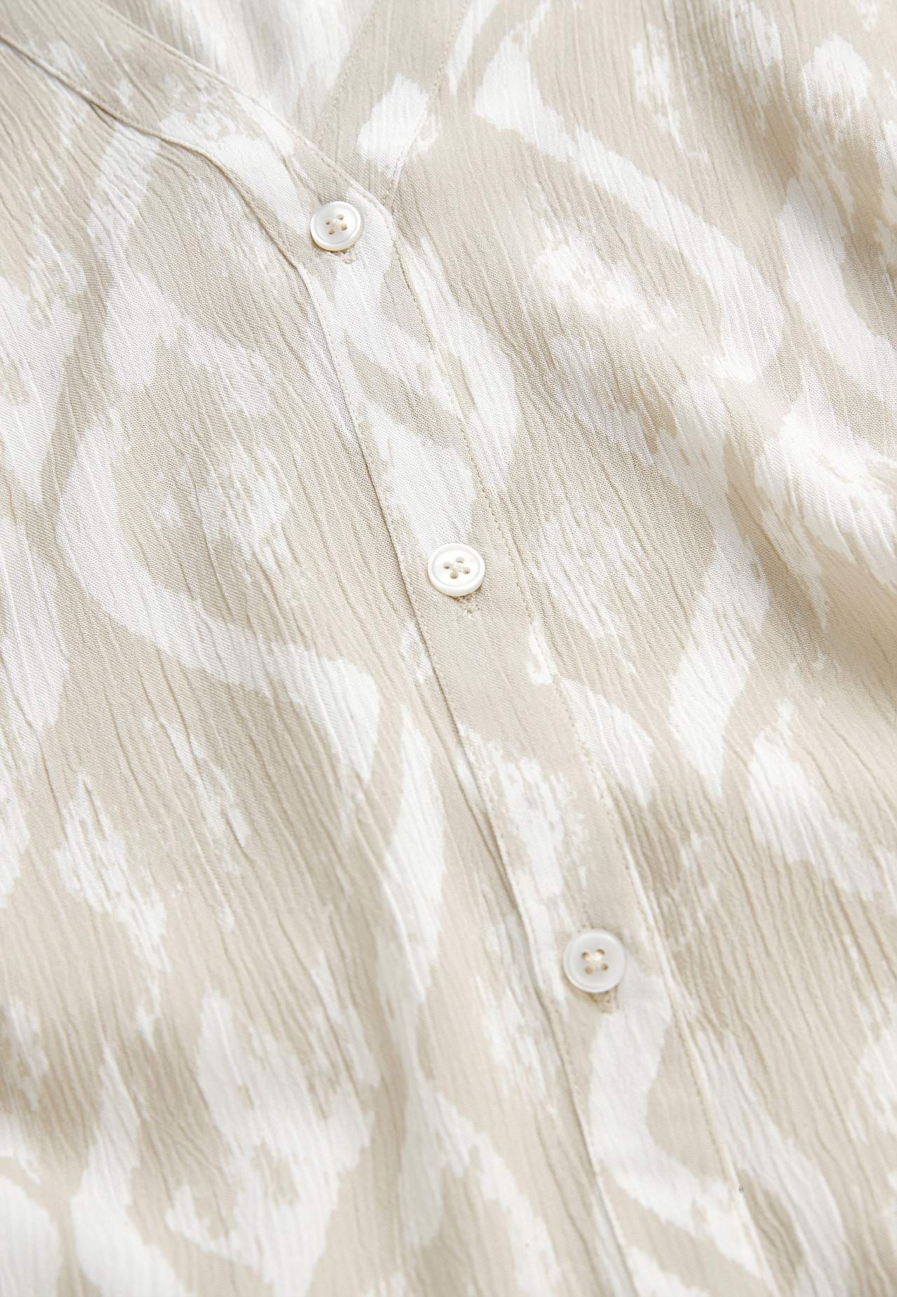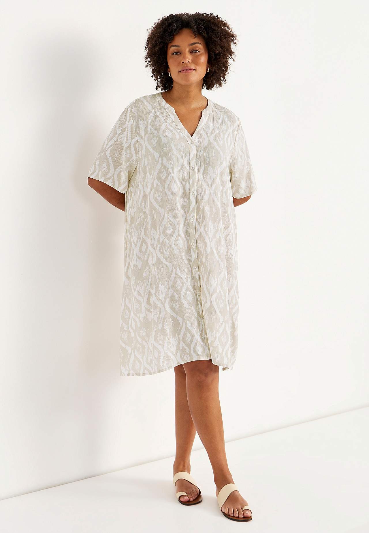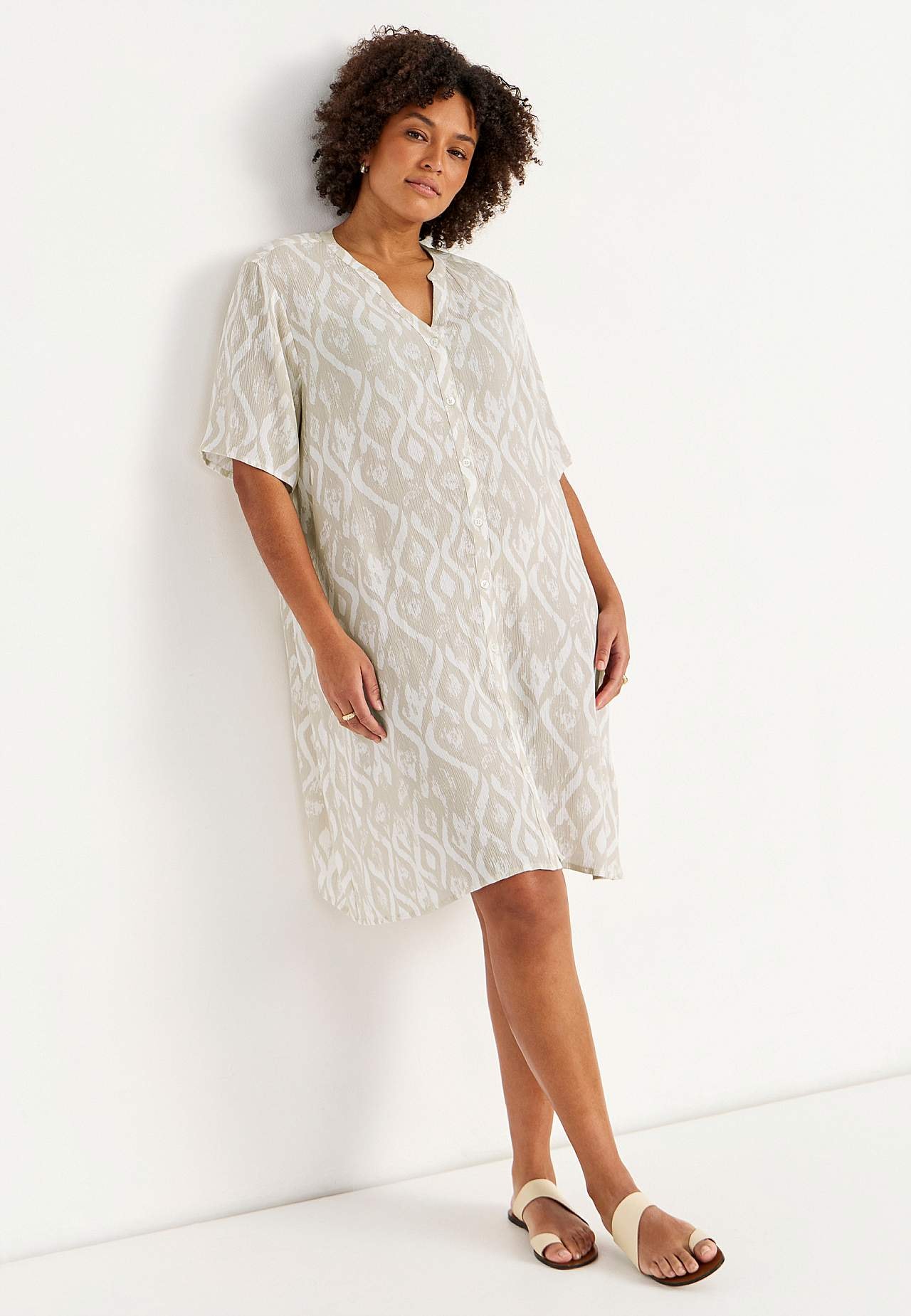 Przewiewny i chłodzący materiał z matową powierzchnią i miłą strukturą. Rozszerzany na dole i bardziej pojemny fason. Zapięcie na guziki z przodu. Krótkie rękawy. Długość z tyłu zależna od rozmiaru, ok. 97-105 cm.