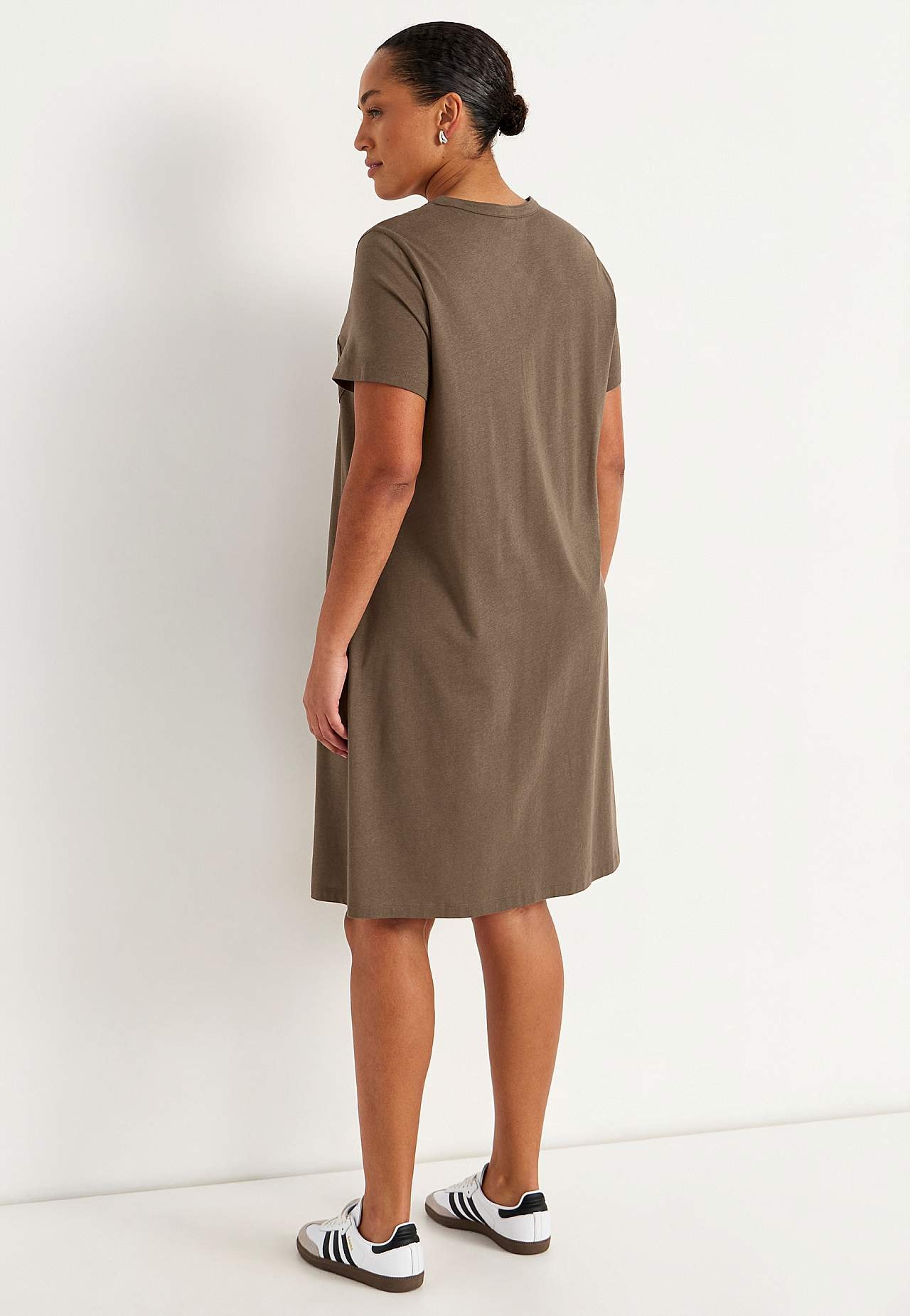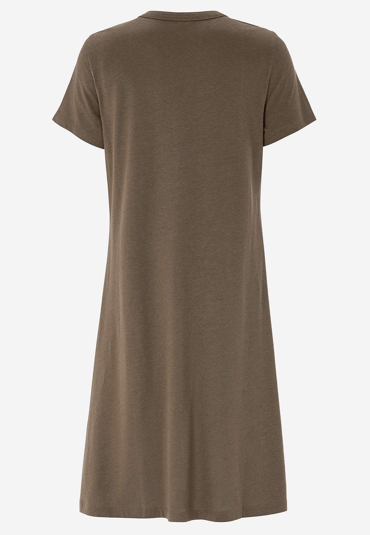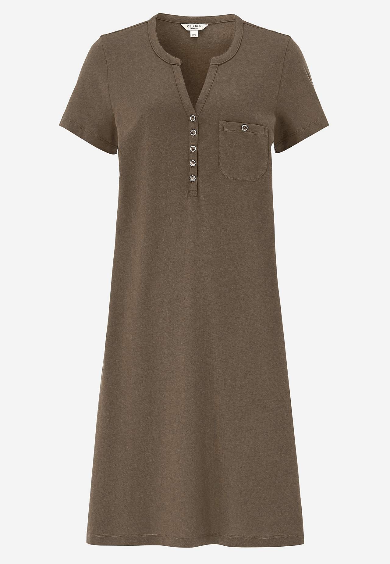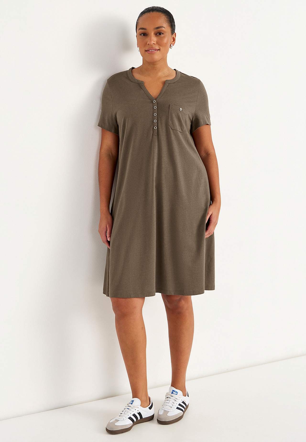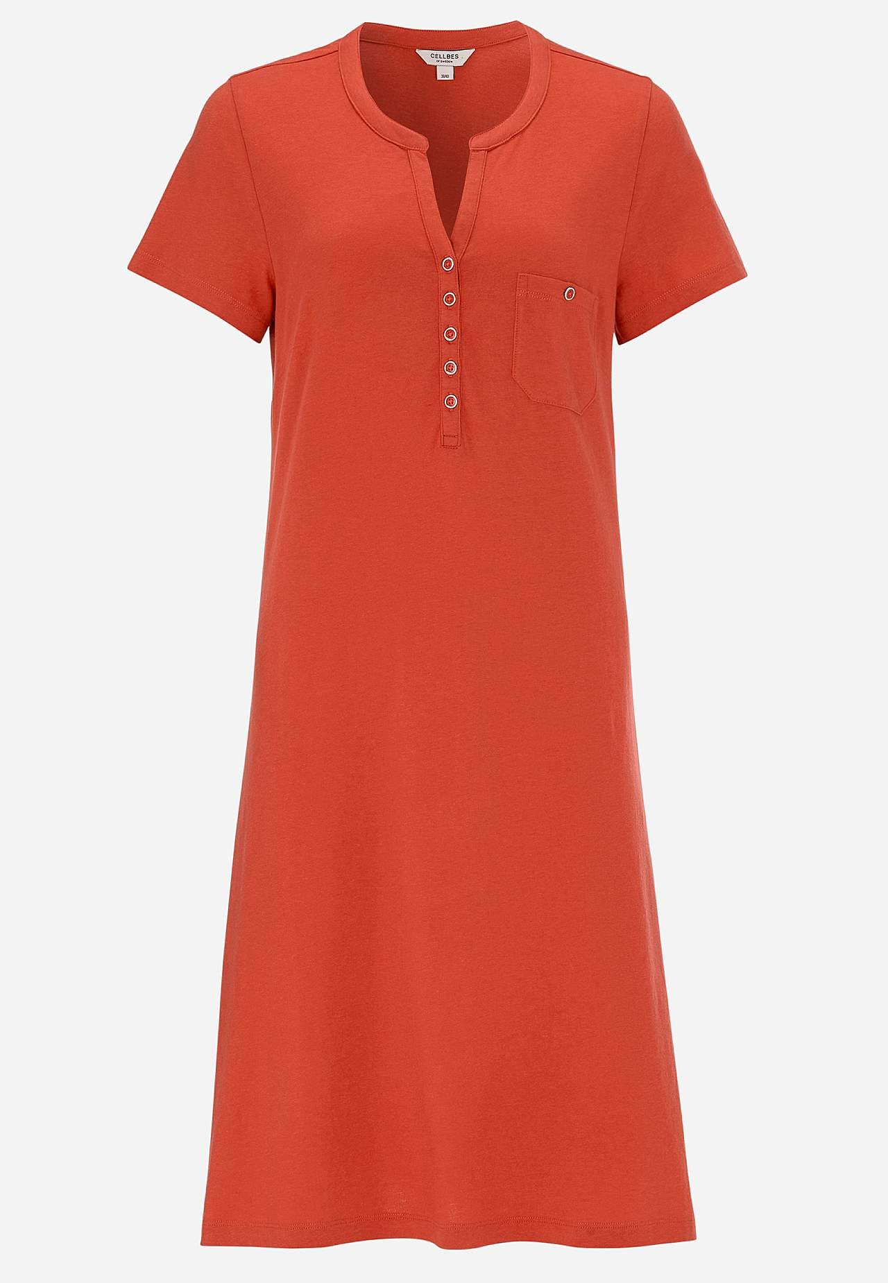 Rozszerzana na dole sukienka z krótkimi rękawami. Dżersej z przyjemnie miękkiej bawełny ekologicznej i modalu. Zaokrąglona szyja z wycięciem w kształcie litery v i rozcięciem zapinanym na guziki. Mała kieszeń na piersi z guzikiem. Zaszewka na piersiach. Lekko zaokrąglony brzeg. Długość od ramion w zależności od rozmiaru ok.... Czytaj więcej